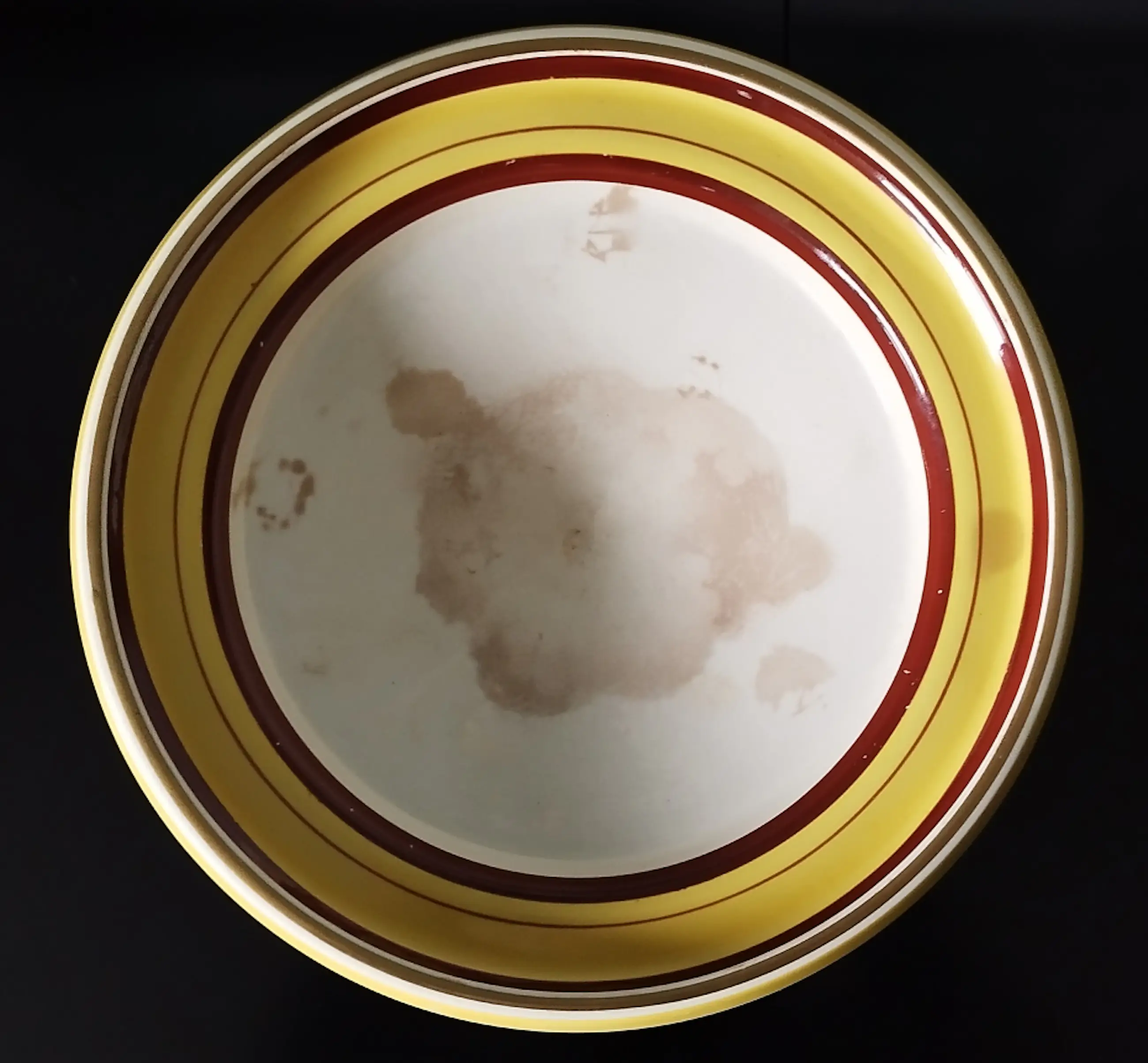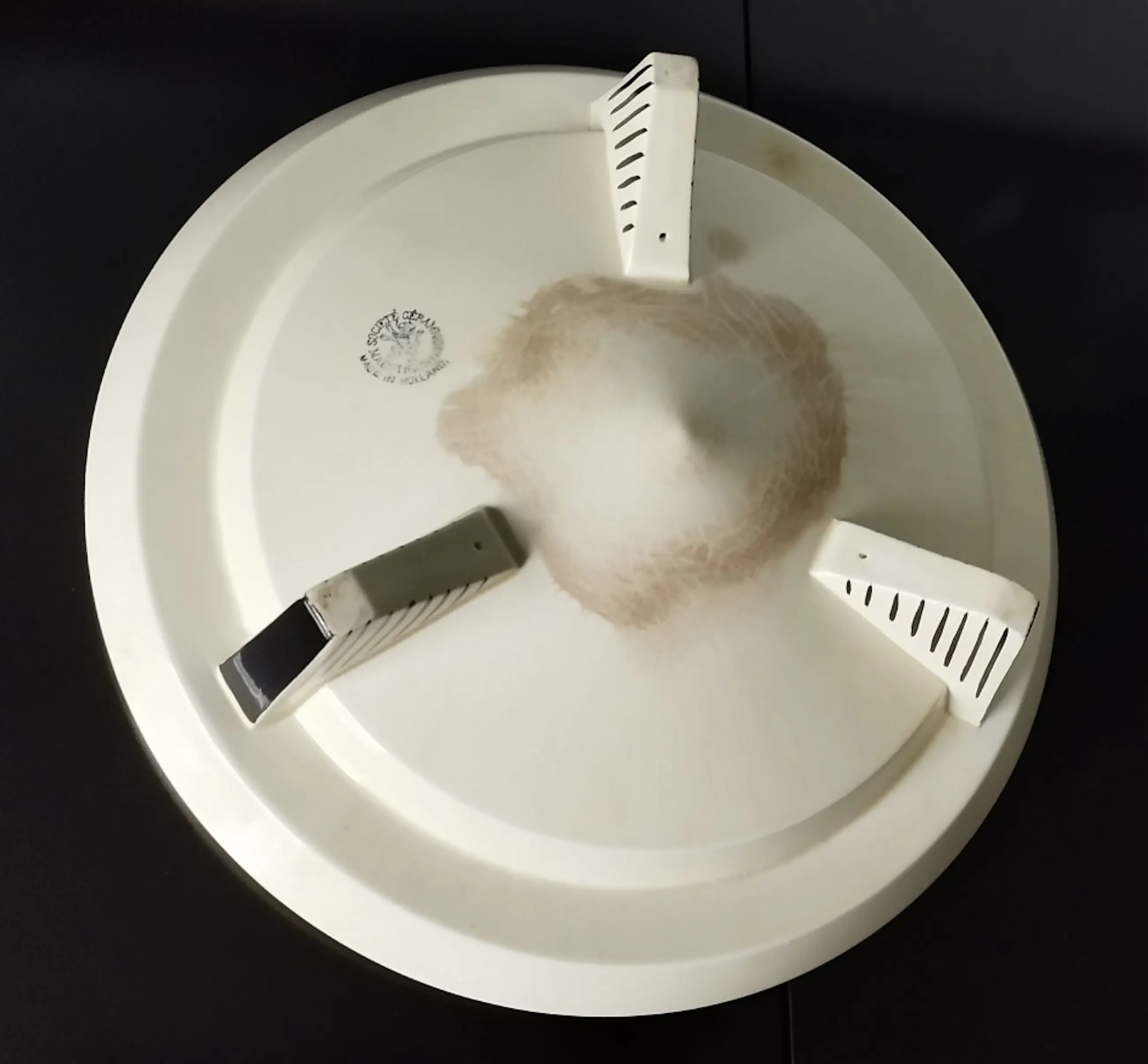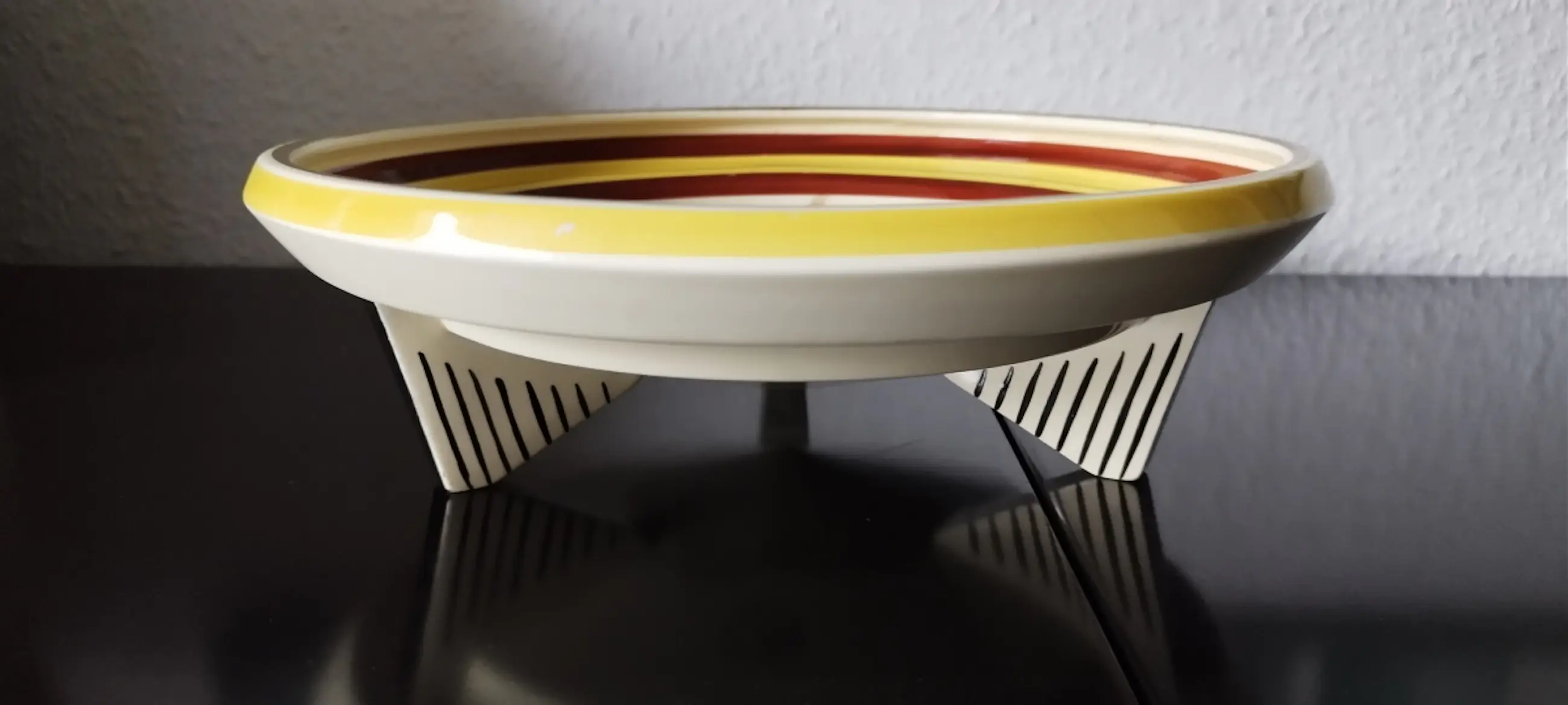 Art Deco fruitschaal van de firma Société Ceramique, Maastricht (1859-1958) De fruitschaal is aan de onderzijde voorzien van een ingebakken stempel (zie foto). Conditie : Gaaf, behoudens fruitvlekken die zijn door het galzuur heen getrokken (zie foto’s) maar bij gebruik met fruit minder zichtbaar.
