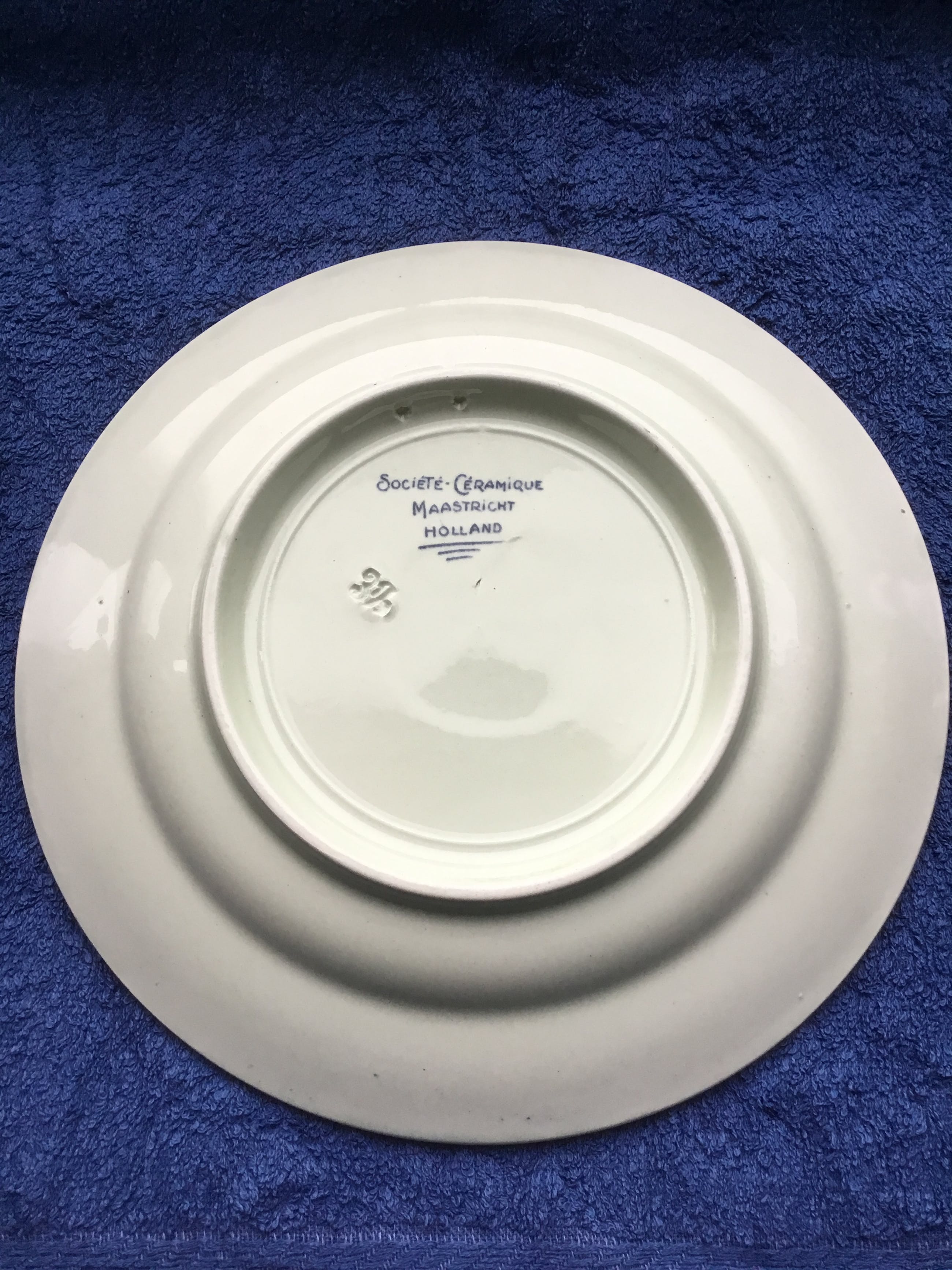 Aangeboden een herdenkingsbord van société-céramique, maastricht uit 1945. Tekst voorzijde “herrijzend nederland”, “naar vrede en welvaart” en “je maintiendrai”. Aan de achterzijde;société-céramique maastricht holland; (beschilderd); 3 1/2 (blindmerk). Breedte plm. 23 Cm. In prima staat. (Wat lichte gebruikssporen in het glazuur aan de voorzijde.)