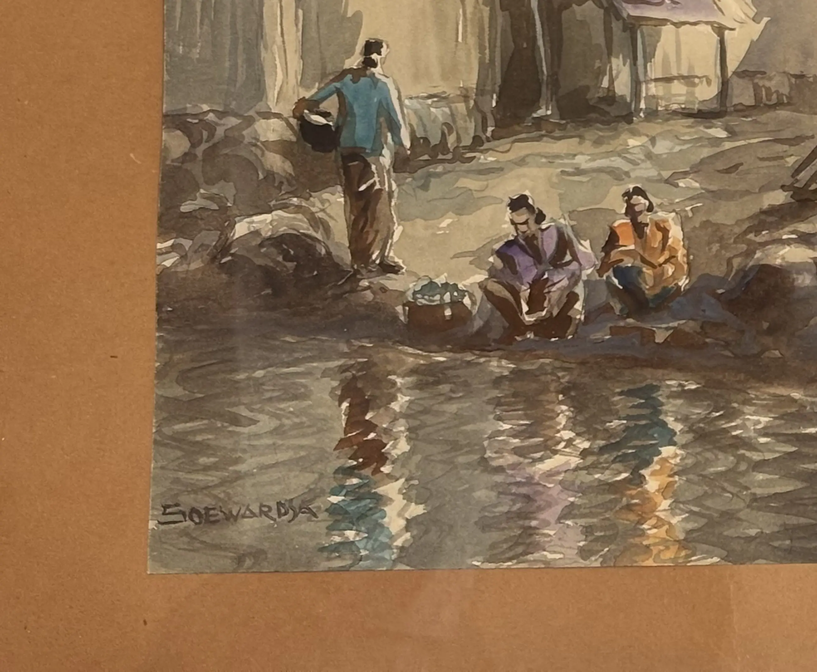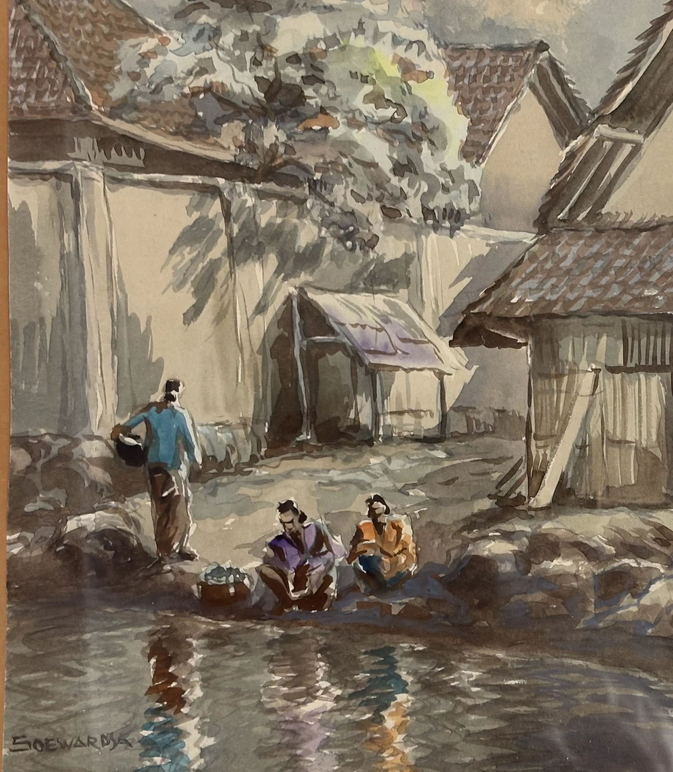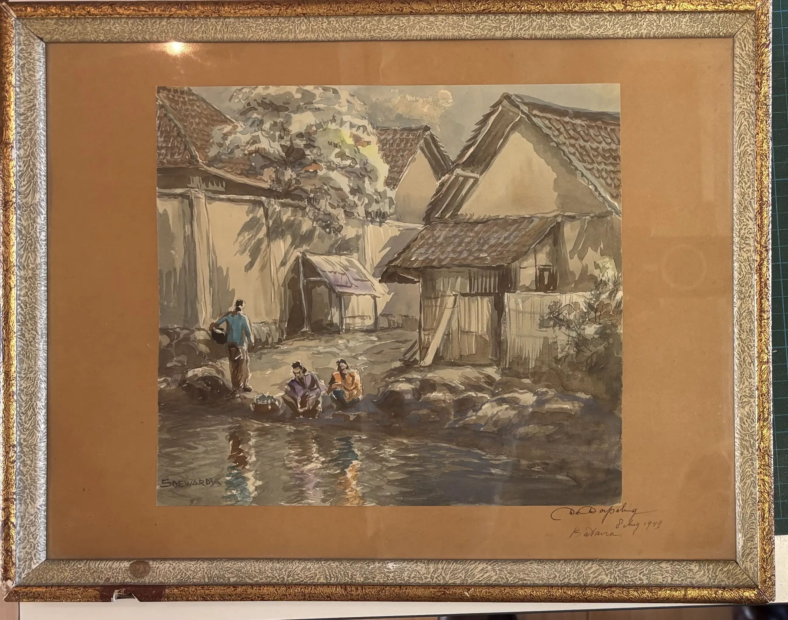Ingelijste aquarel van Soewardja linksonder gesigneerd en rechtsonder op het passepartout getiteld als "De dorpeling" en gedateerd als 8 augustus 1949.