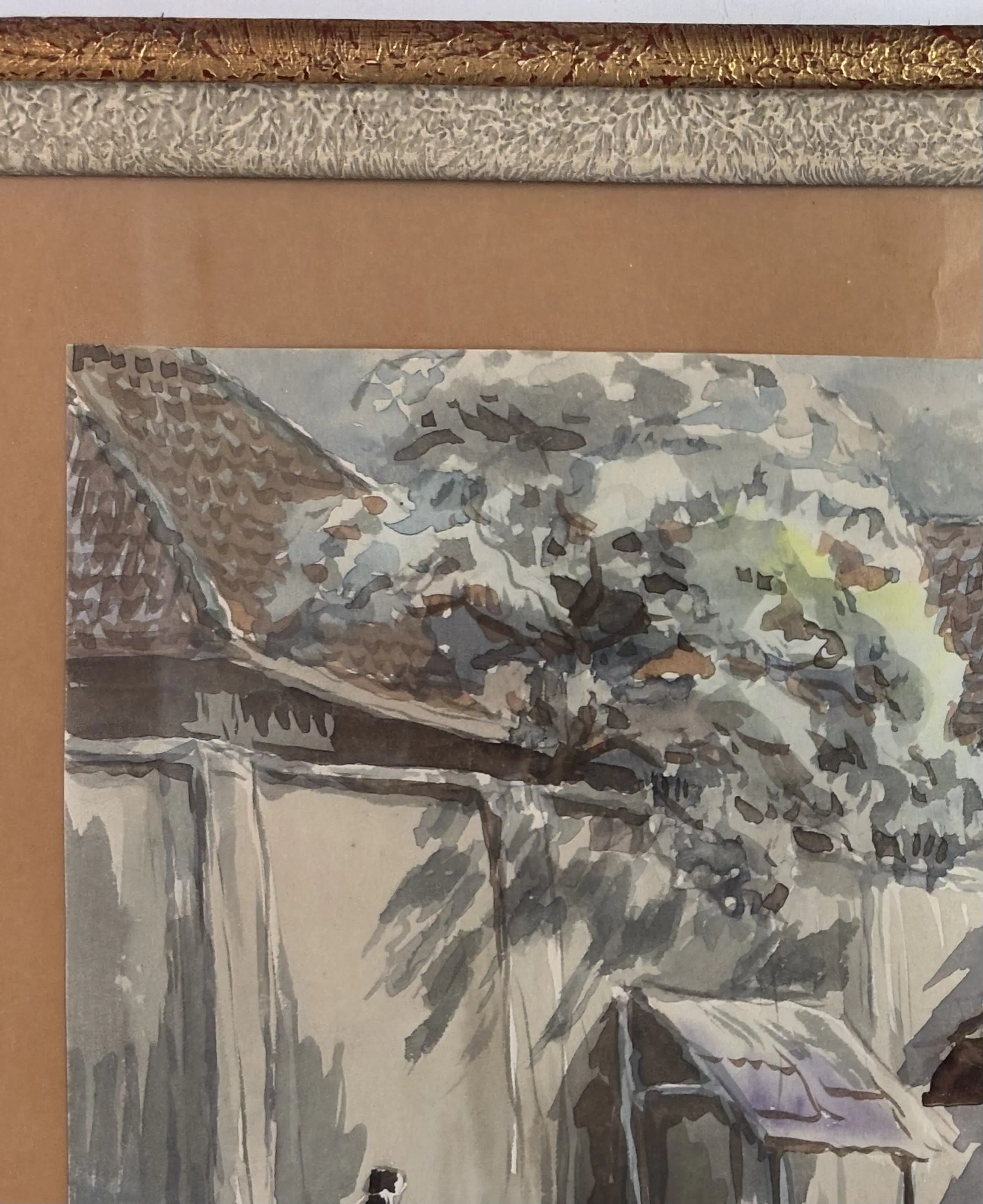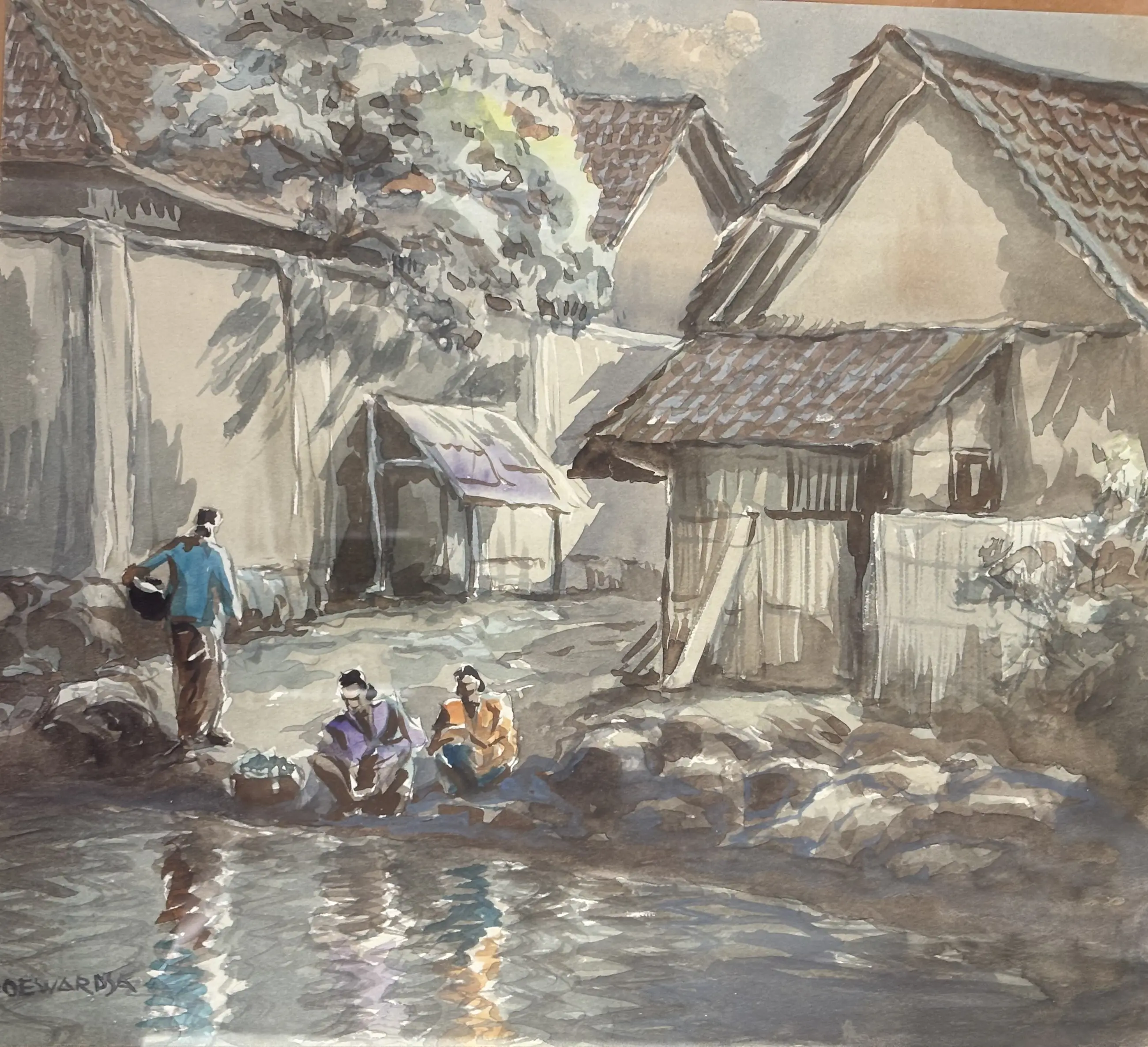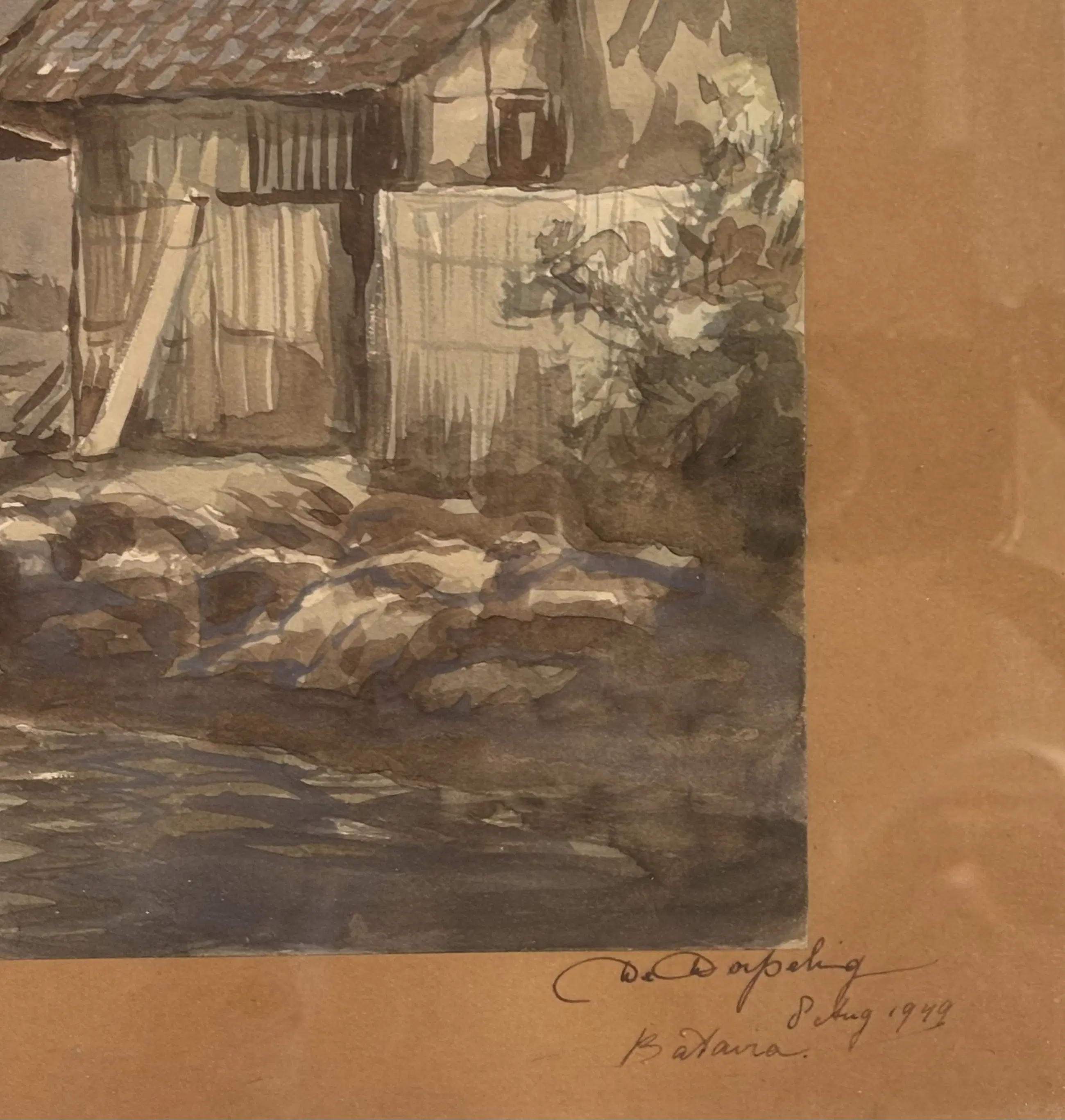 Ingelijste aquarel van Soewardja linksonder gesigneerd en rechtsonder op het passepartout getiteld als "De dorpeling" en gedateerd als 8 augustus 1949.