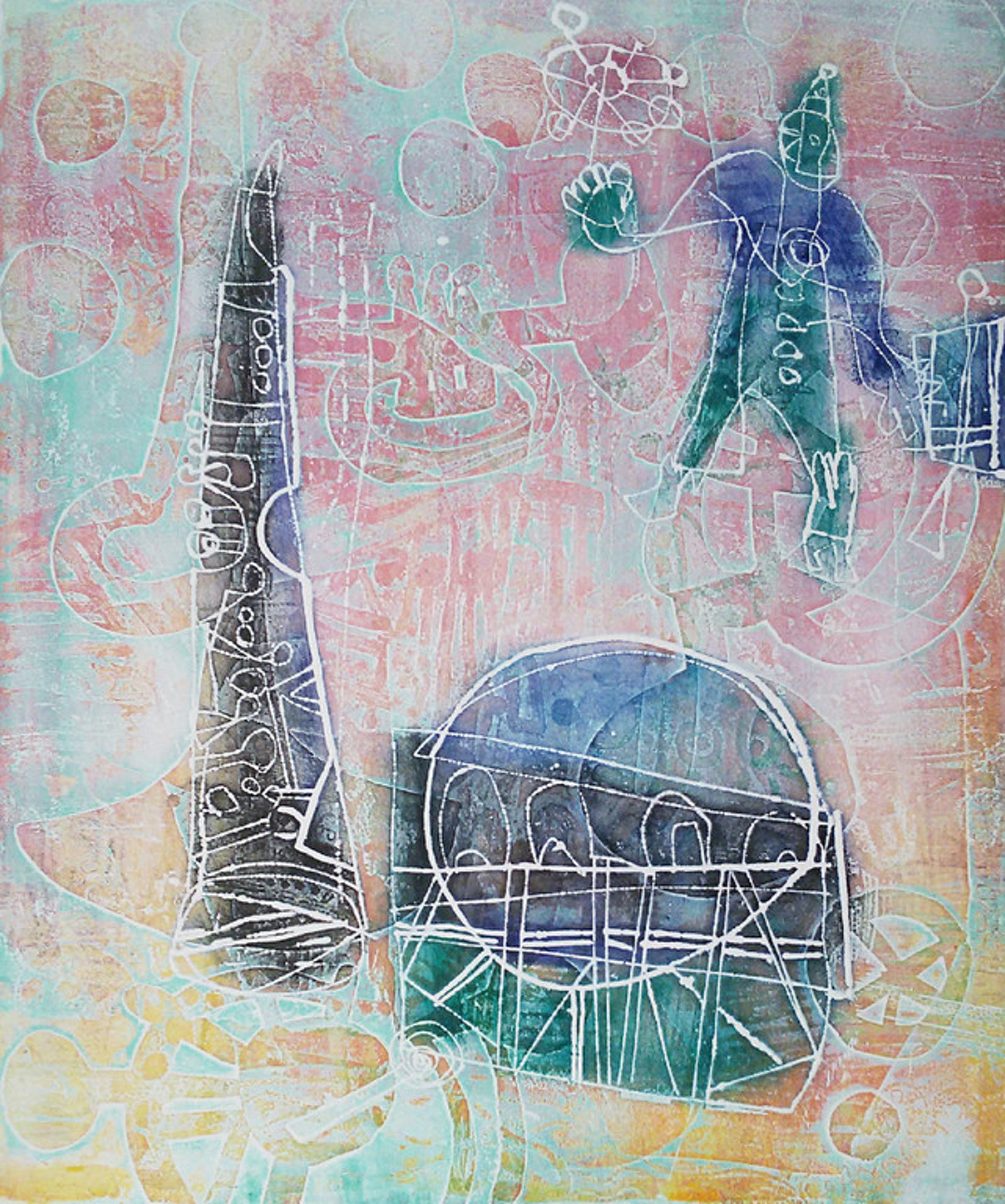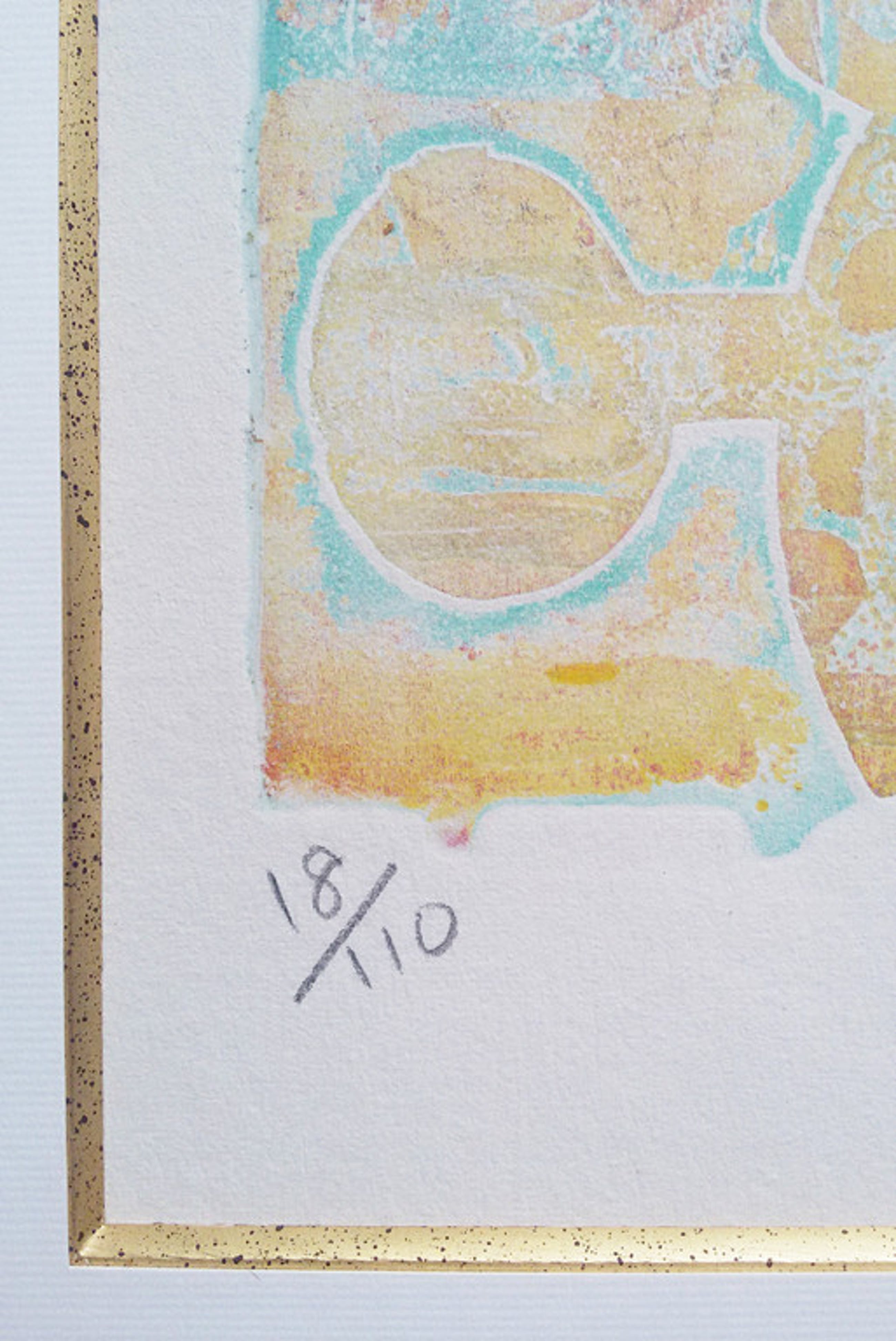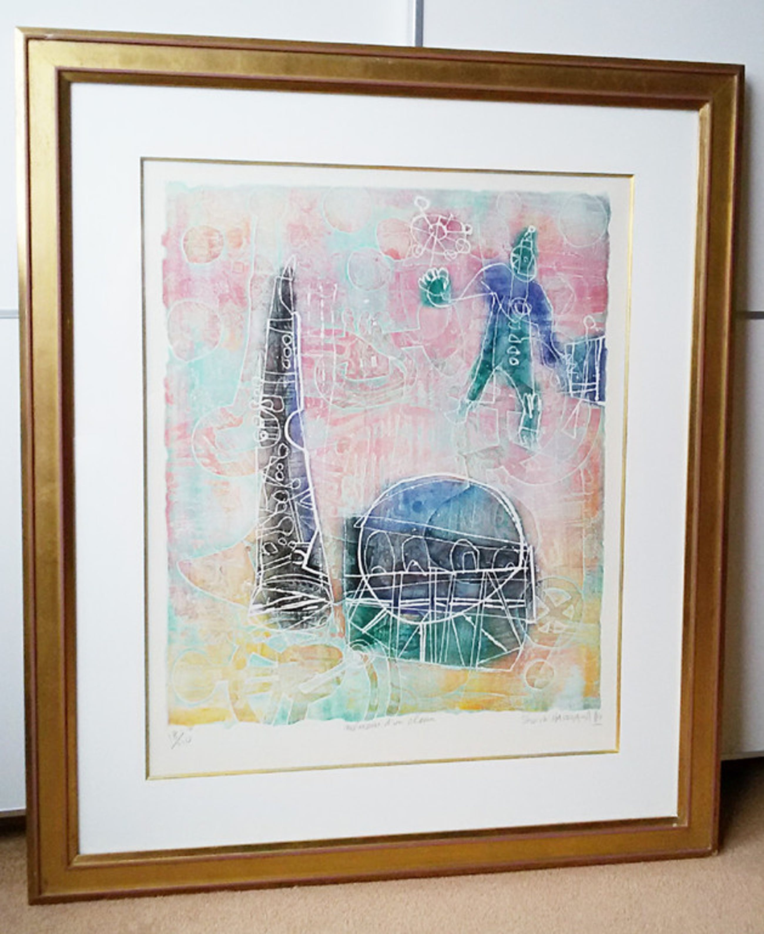 Ragfijne, gelaagde compositie van de Japanse kunstenaar Shoichi Hasegawa. Aquatint ets op papier, met potlood gesigneerd, getiteld en genummerd (18/110). Prachtig ingelijst, achter glas en met luxueus, complementerend passe-partout. Alles in zeer goede conditie. Het glas ervoor neemt wat van de sprankeling weg in de foto’s, de kleuren zijn in het echt scherper en de compositie sterker gedefinieerd.