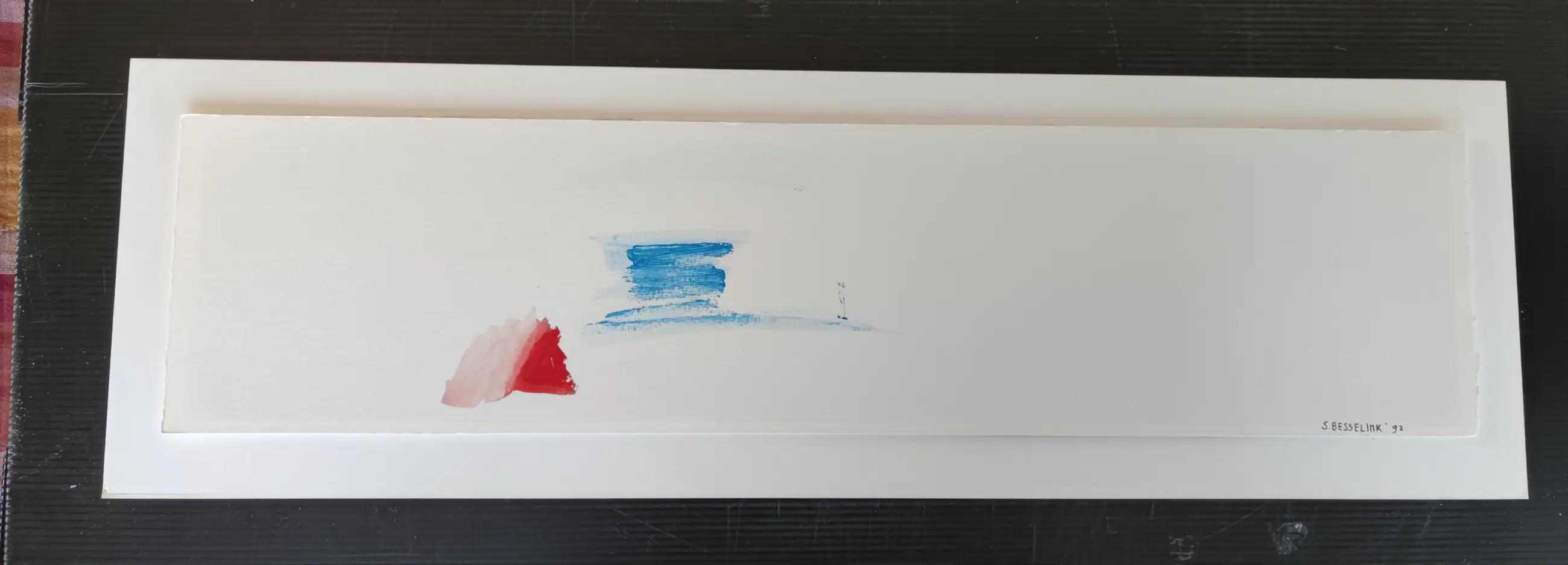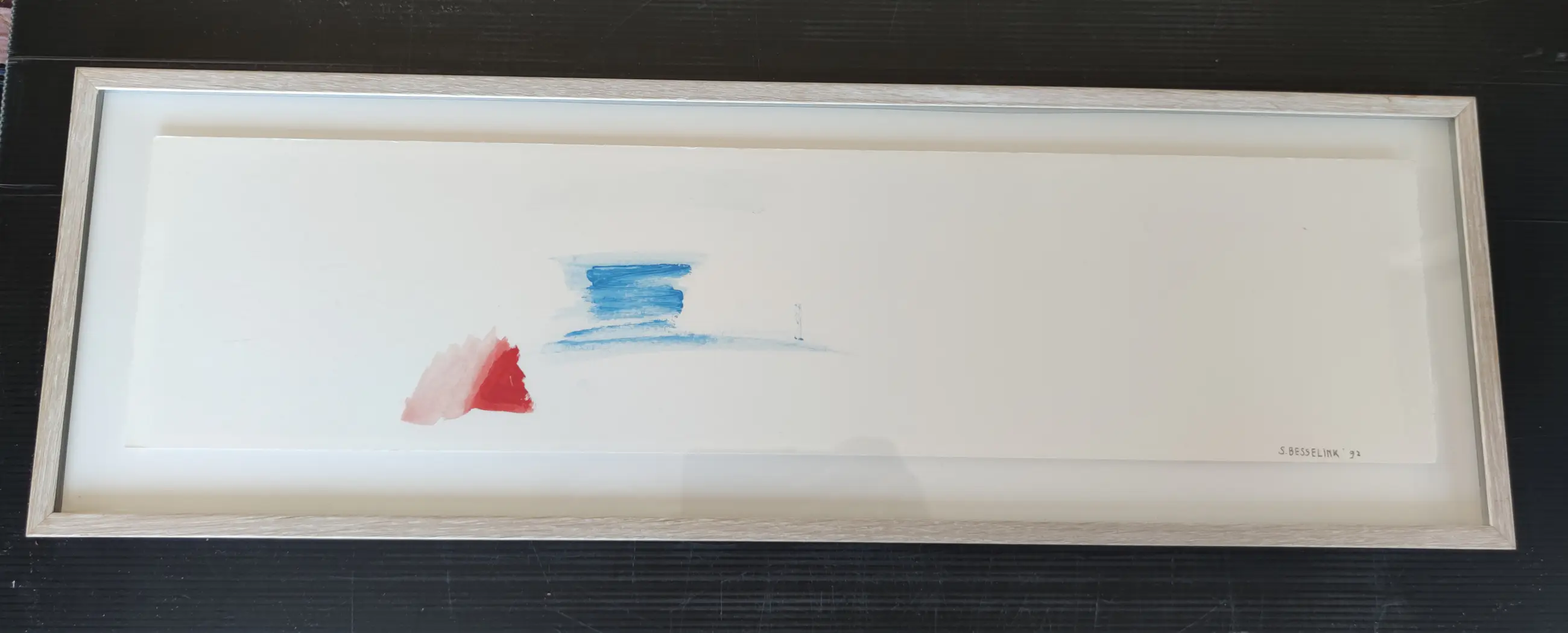 Tekening zonder titel met acrylverf op geschept papier, ingelijst met glasplaat hoog 20 cm, breed 62 cm.