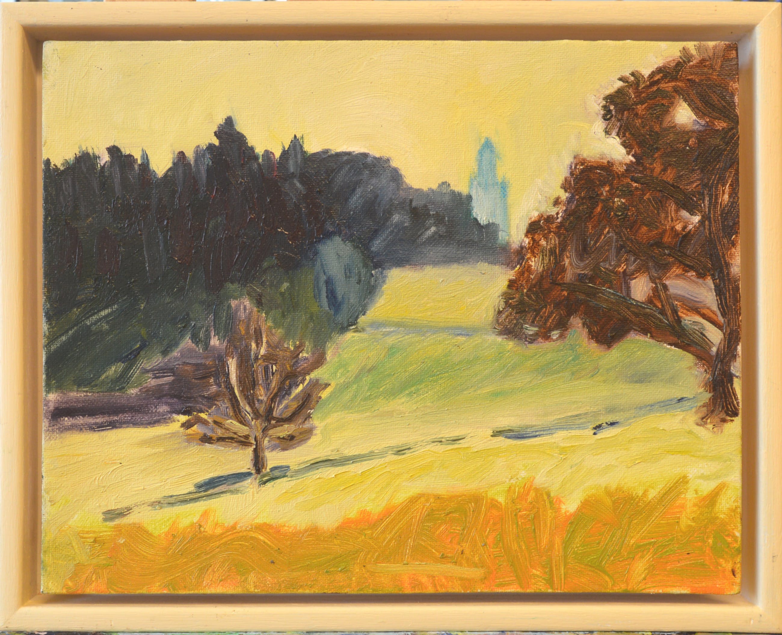 plein air geschilderd september 2017 vanaf de watertoren Arnhem. Zicht over park Klarenbeek met op de achtergrond de Eusebiuskerk. Uniek moment in de tijd, want de toren staat in de steigers en heeft dus een andere vorm dan de eigenlijke toren.