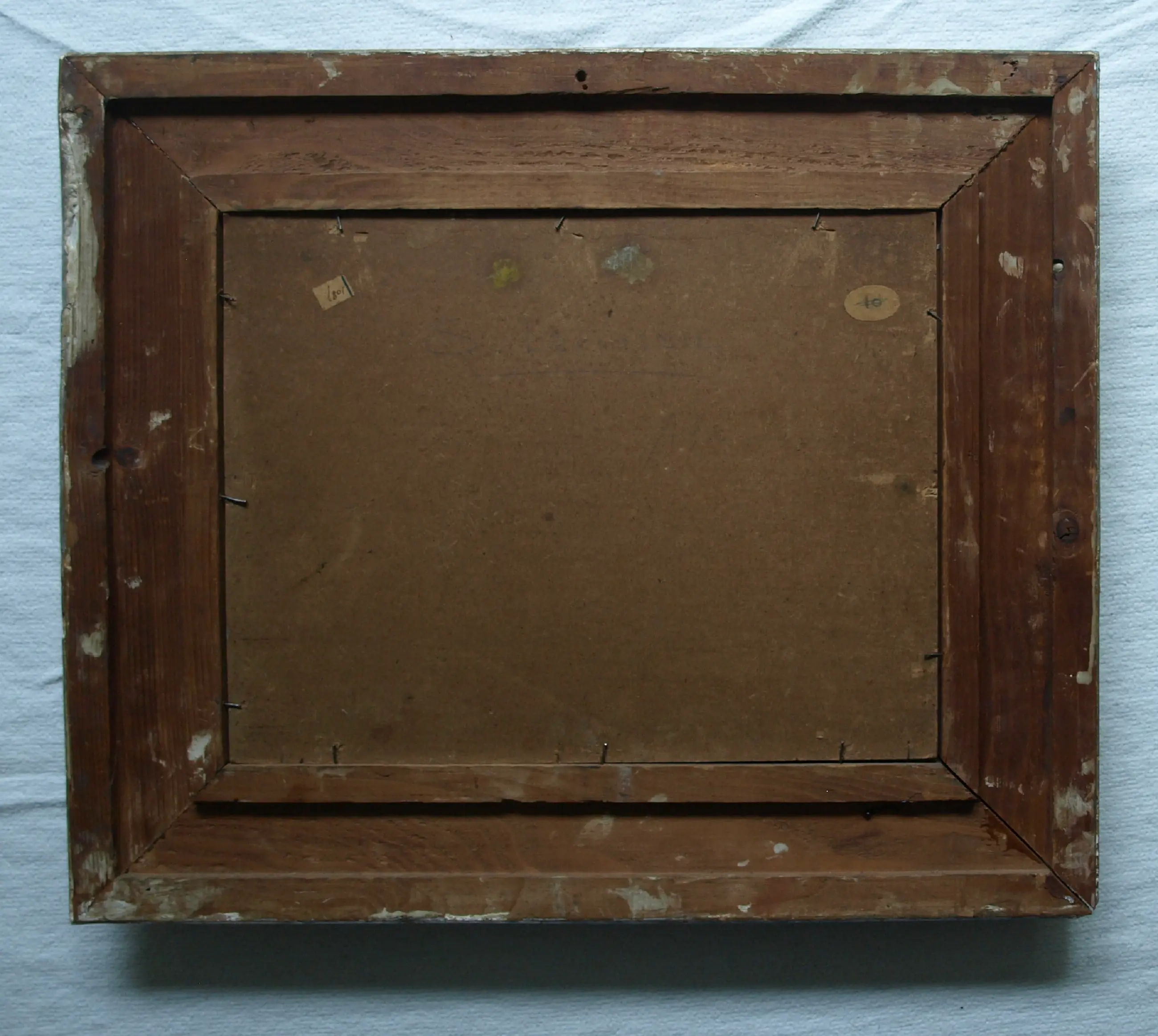 In goede staat met ouderdomssporen: oppervlaktevuil, craquelé. De lijst heeft slijtplekken.