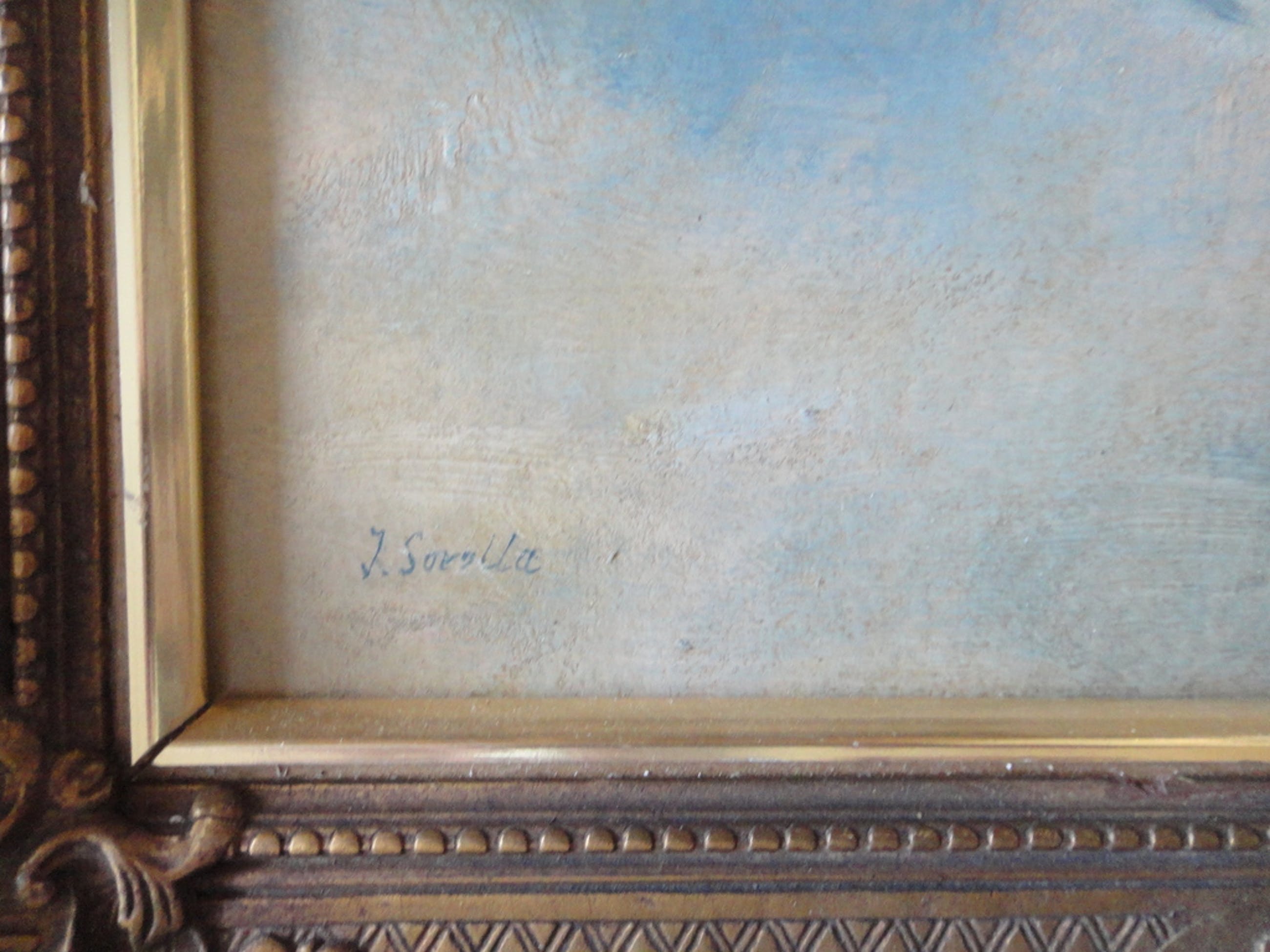 Voor een derde bied ik aan dit schilderij met voorstelling van flanerende dames aan het strand, gesigneerd Sorella (l.o).