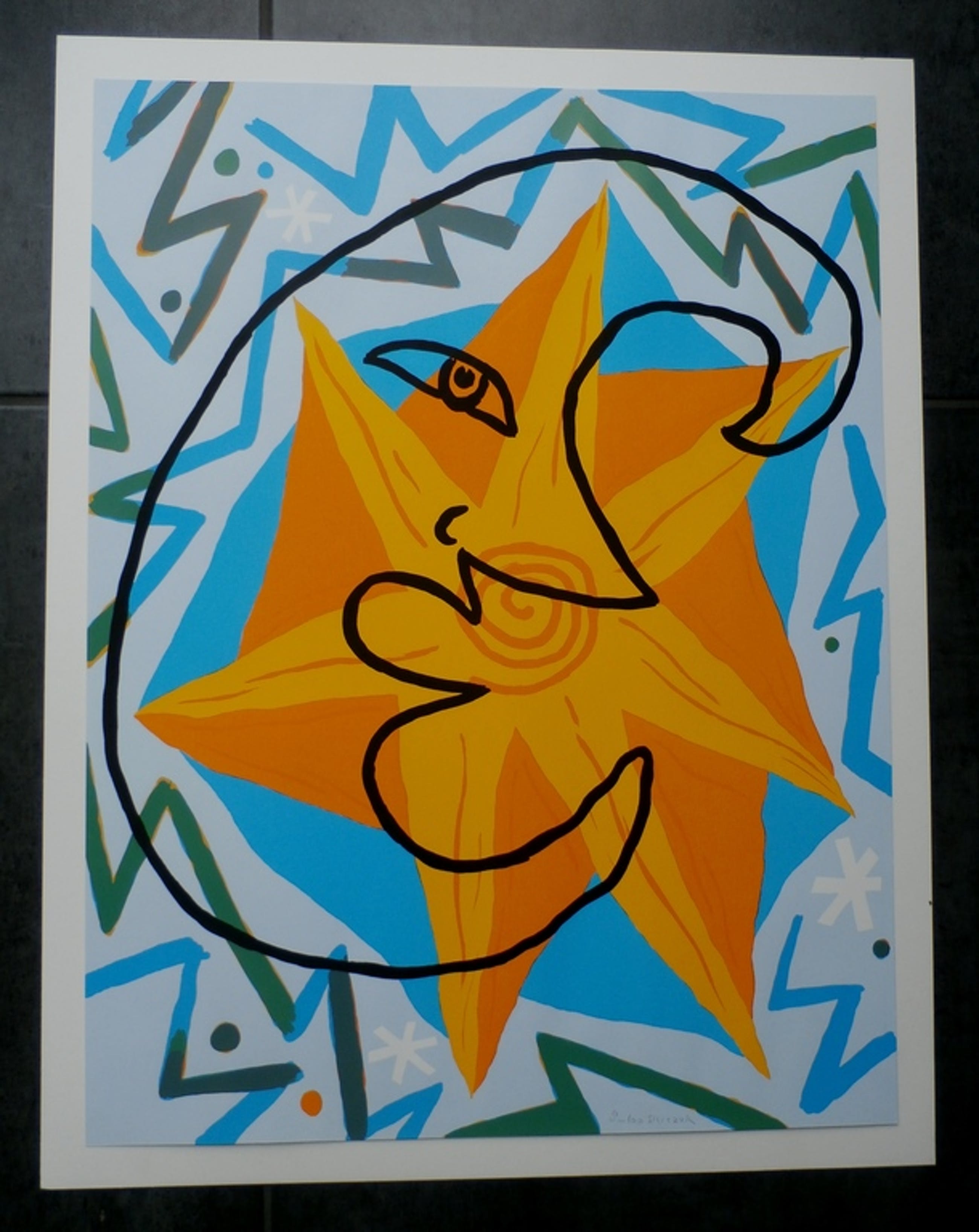 Zeefdruk van Stanco Skiczuk. Titel: Zon en maan. Het werk is middenonder , met potlood, gesigneerd door de kunstenaar. Afmetingen werk: H65 x b50 cm. Afmetingen incl. kartonnen achterkant: H70 x b55 cm. Nummer: 8/100. Het werk moet plat verzonden worden i.v.m. de afmetingen. Hierdoor zijn de verzendkosten wat hoger (>100x 50 cm). De authenticiteit van dit werk wordt volledig gegarandeerd. Een certificaat van echtheid kan, op verzoek, worden meegeleverd. Conditie: in goede staat.