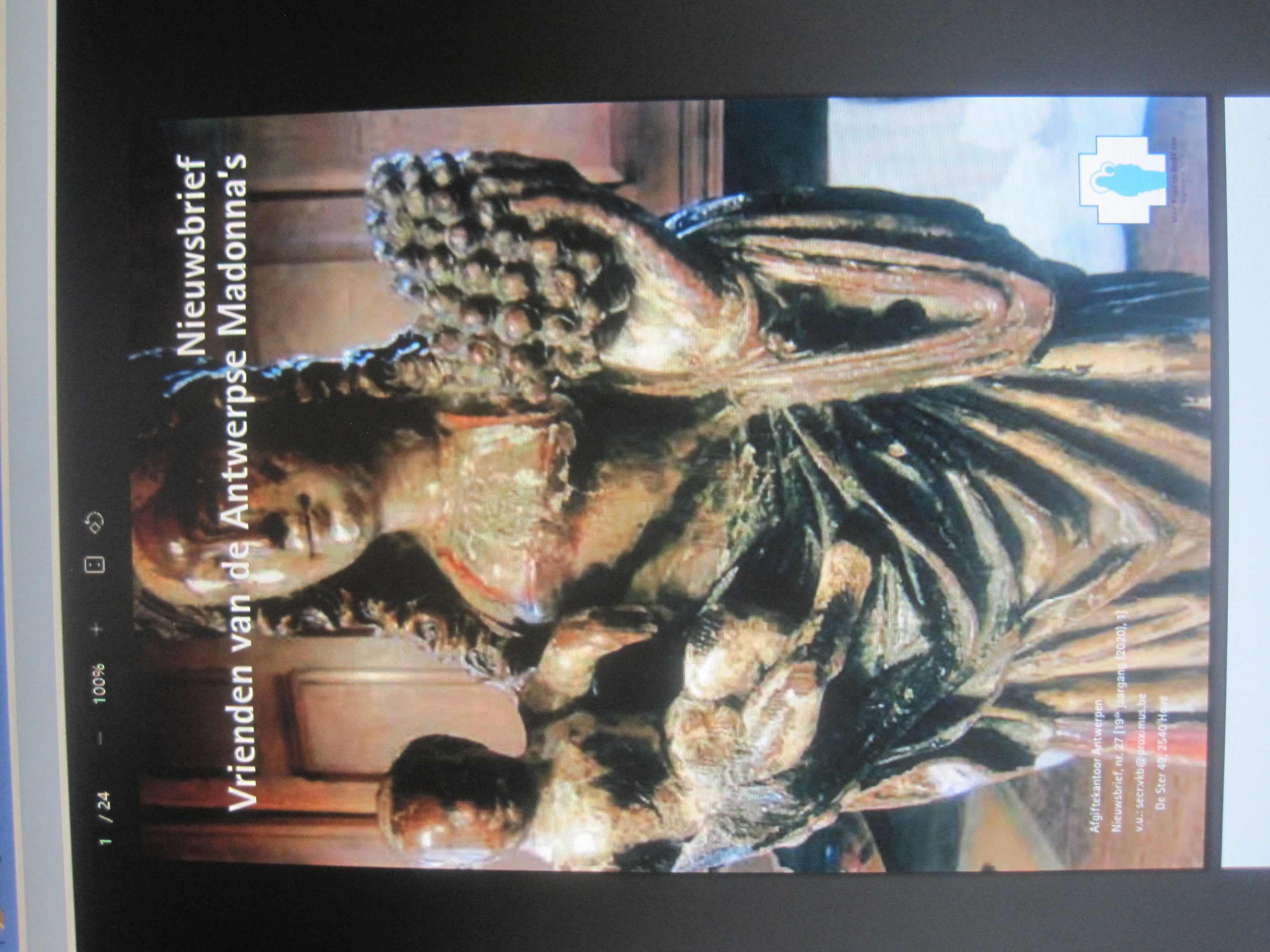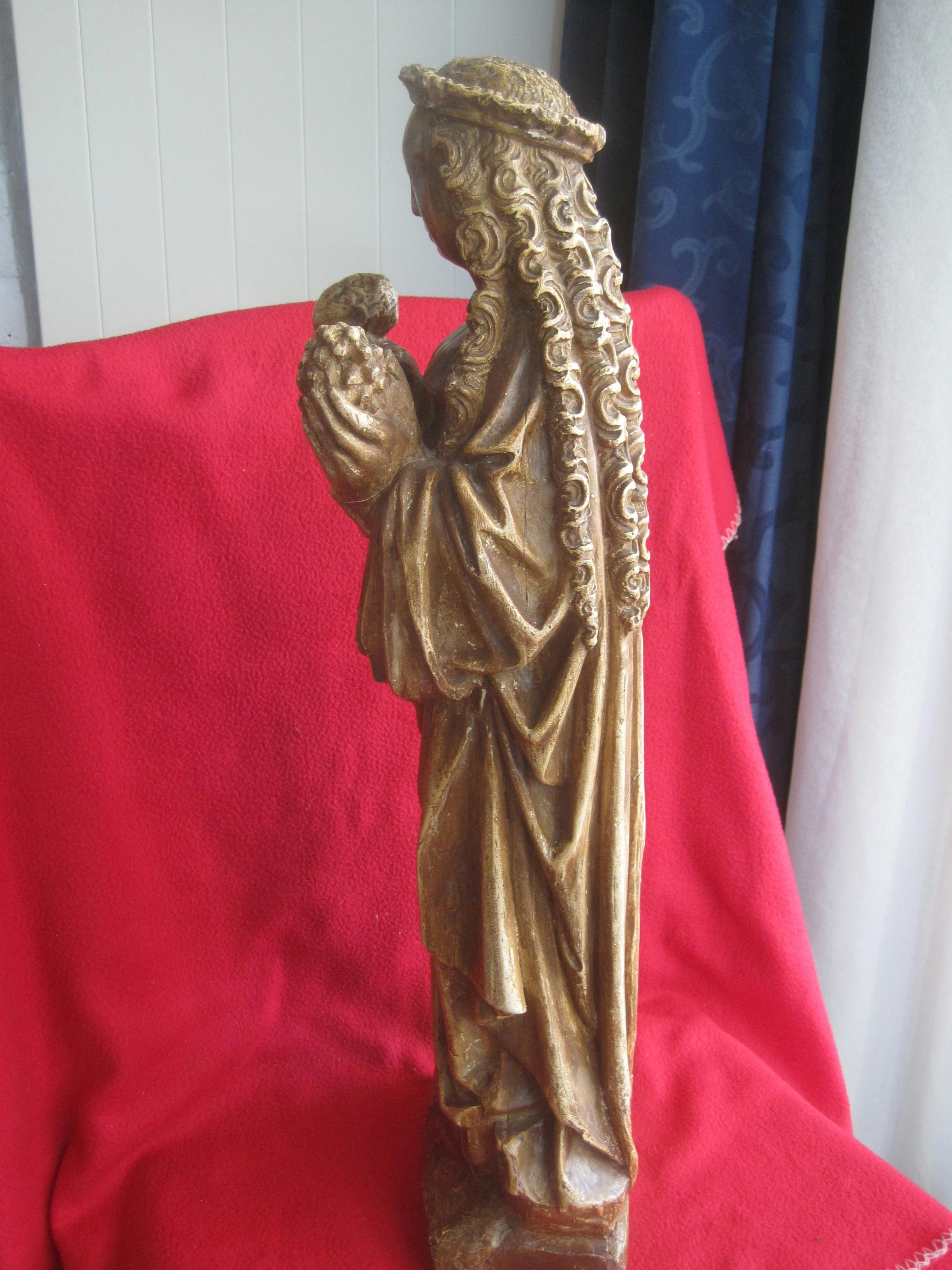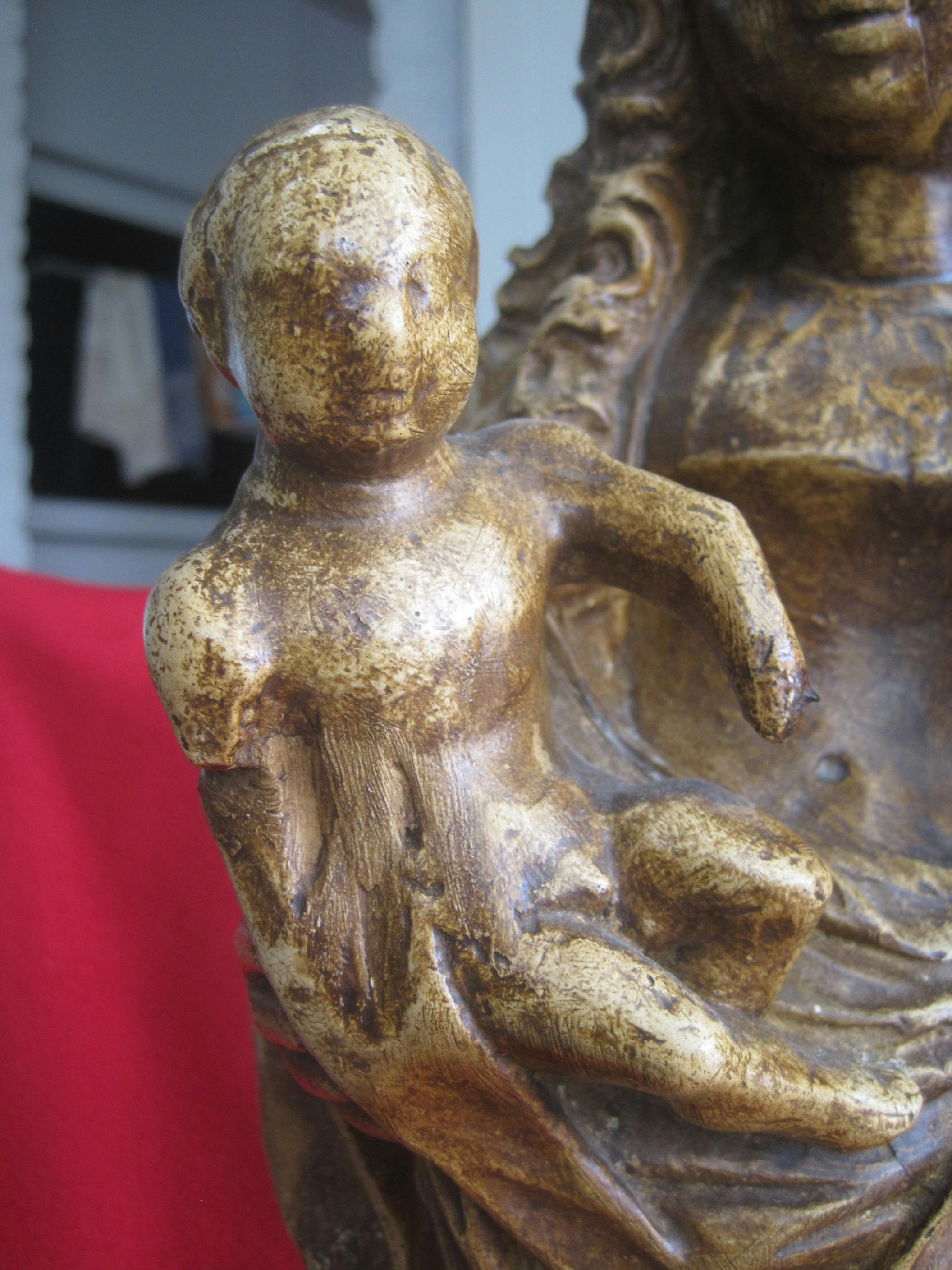 Een indrukwekkend gipsen beeld van Maria en Jezus, naar het eikenhouten origineel welke wordt bewaard in de St. Willibrorduskerk te Antwerpen. Het beeld heeft leeftijd en gebruikssporen, maar is vrij van breuk. Onderop is een soort cerificaat bevestigd met handtekening en stempel en nummer. Ik heb hierover niets kunnen vinden. Ik heb de leeftijd daarom in de 2e helft van de 20e eeuw gehouden.