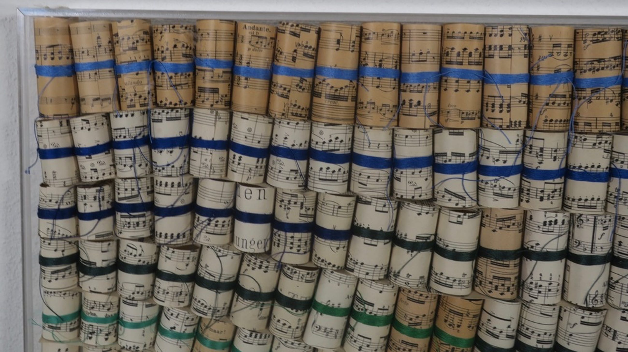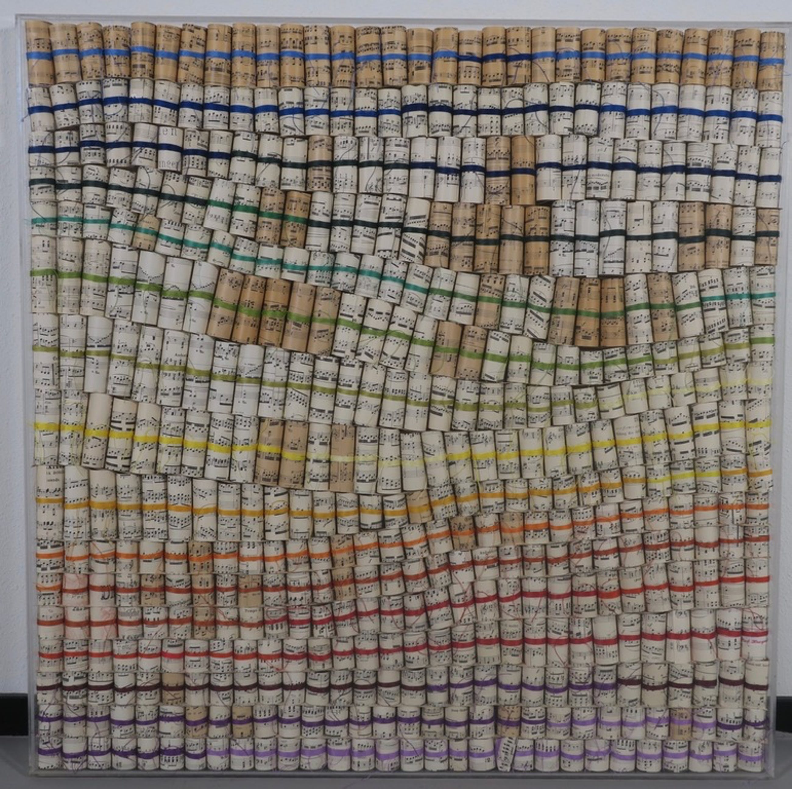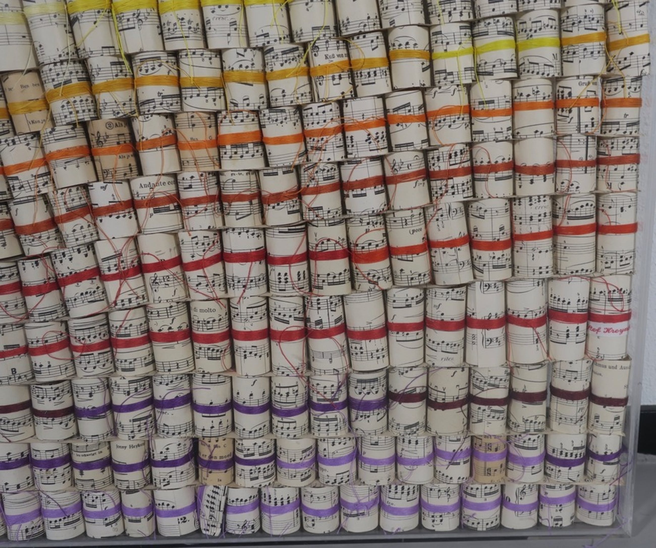 Materiaal: Opgerolde stukjes bladmuziek omwikkeld met diverse kleuren garen in een plexiglas box/lijst