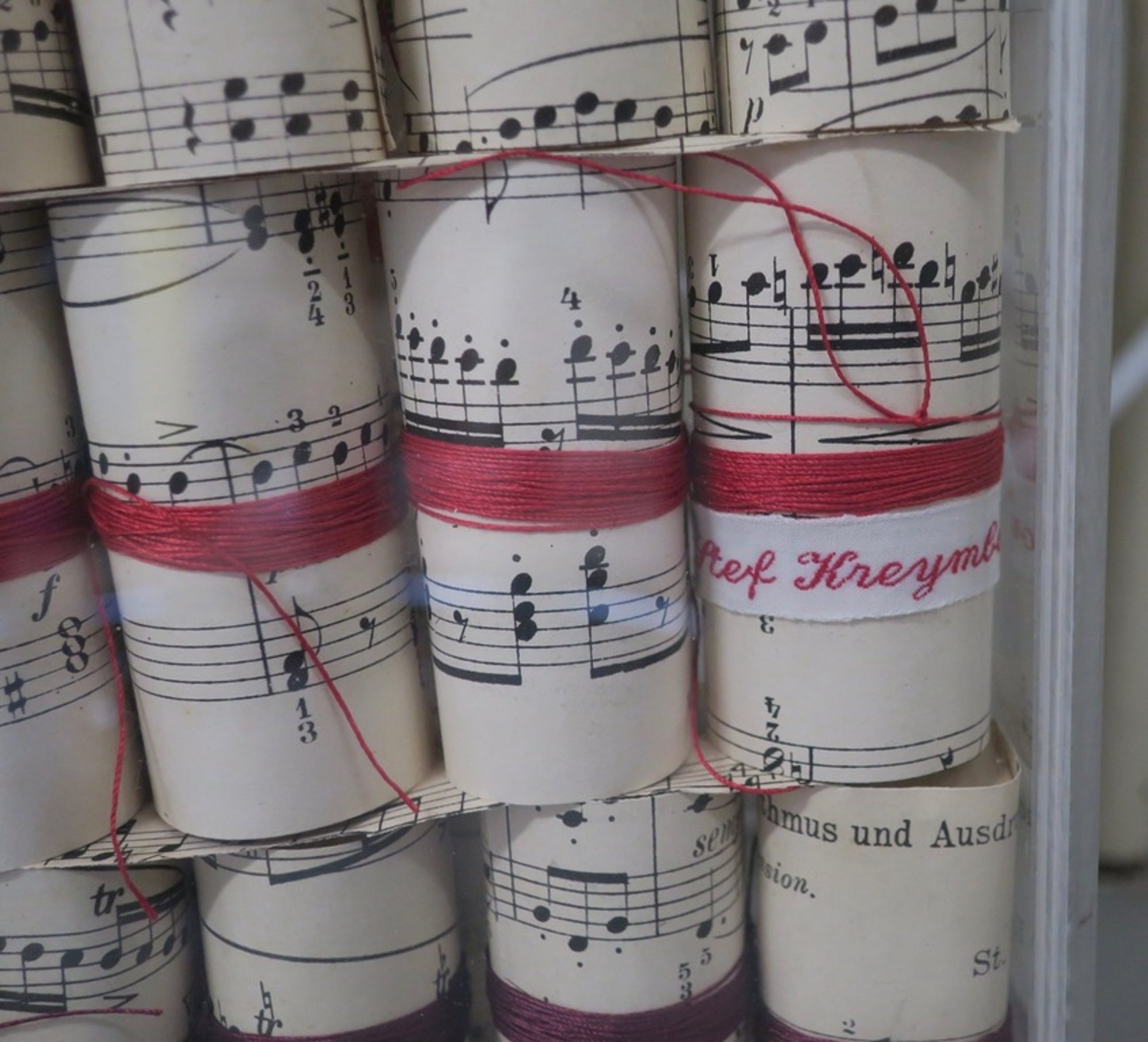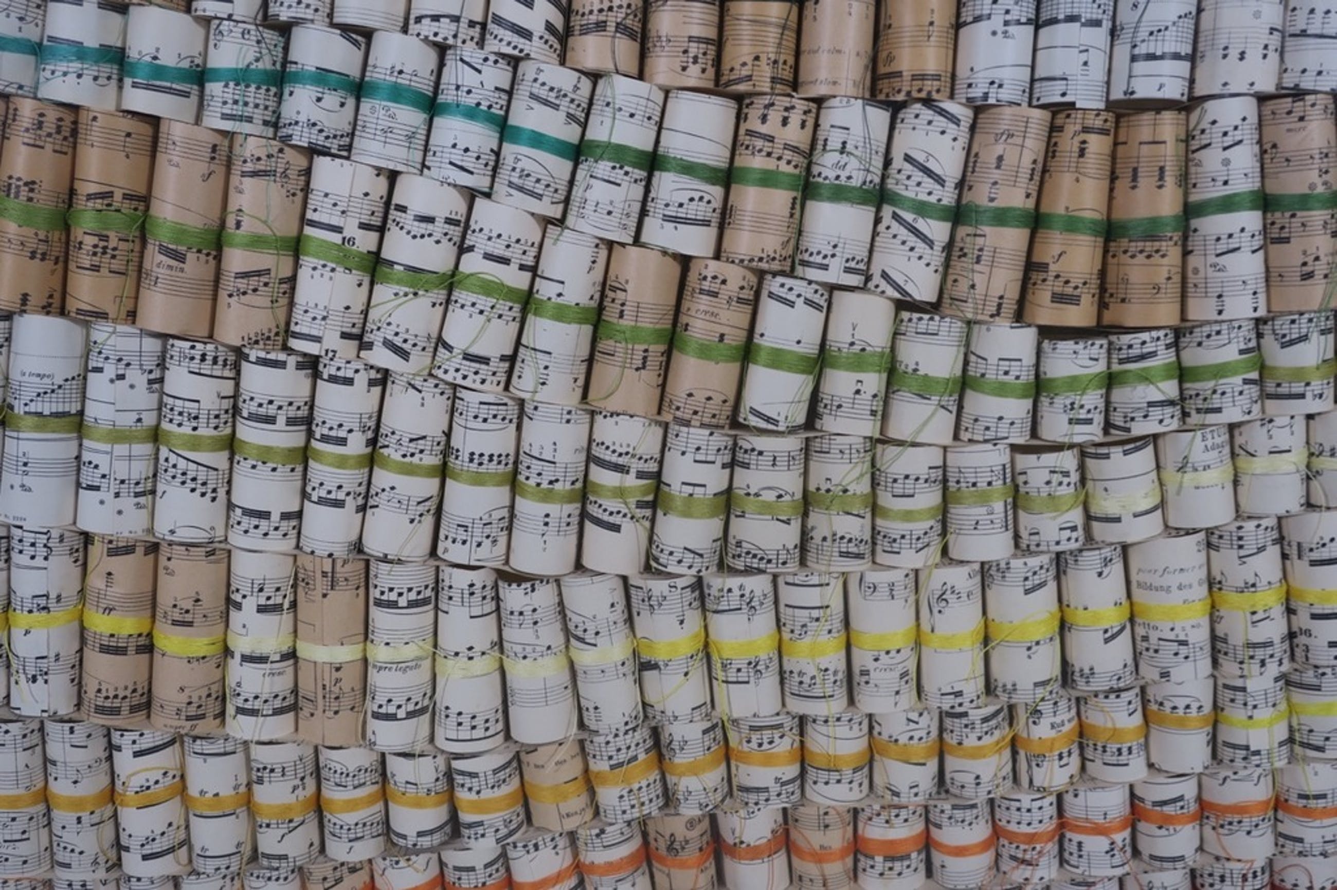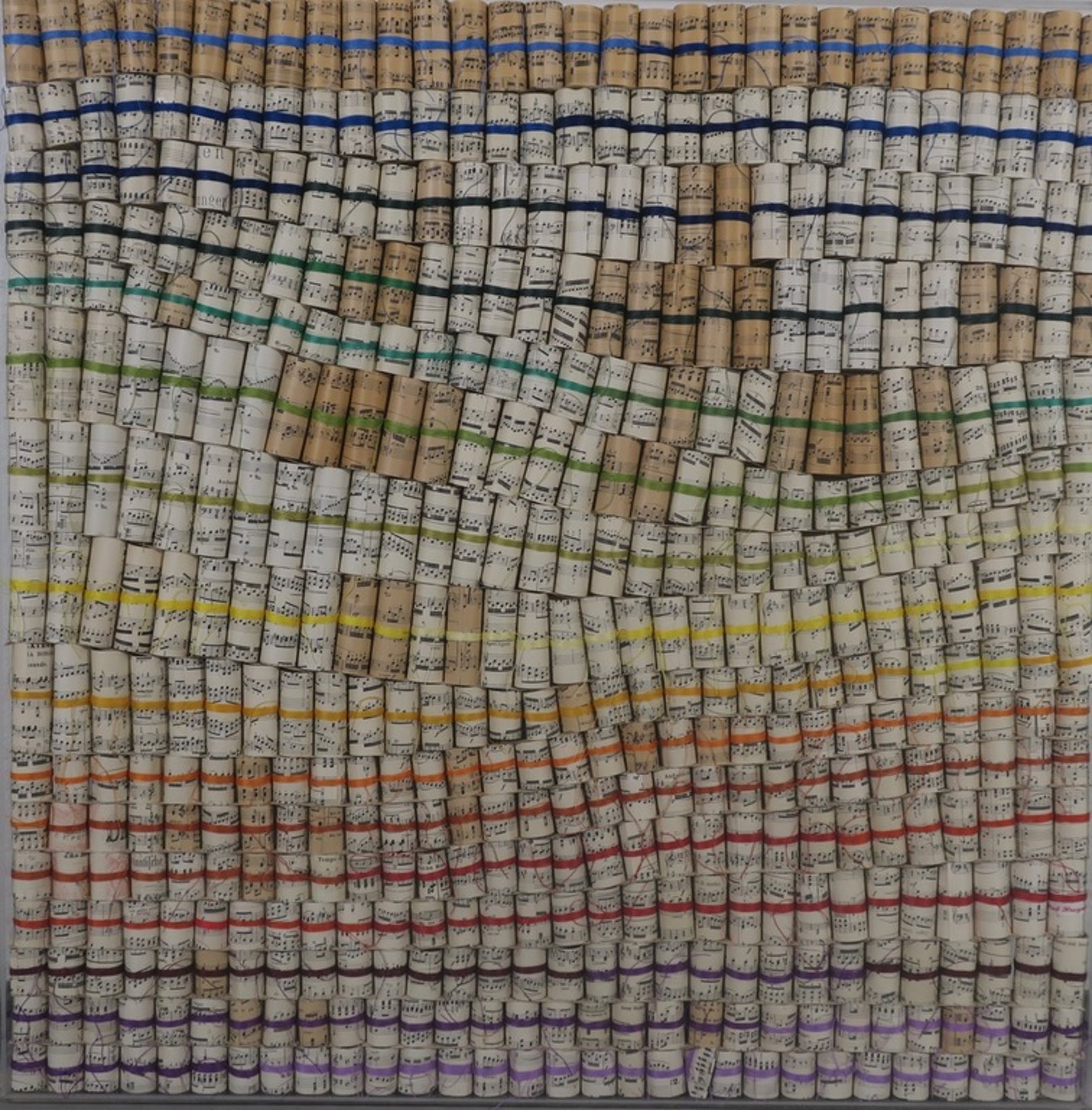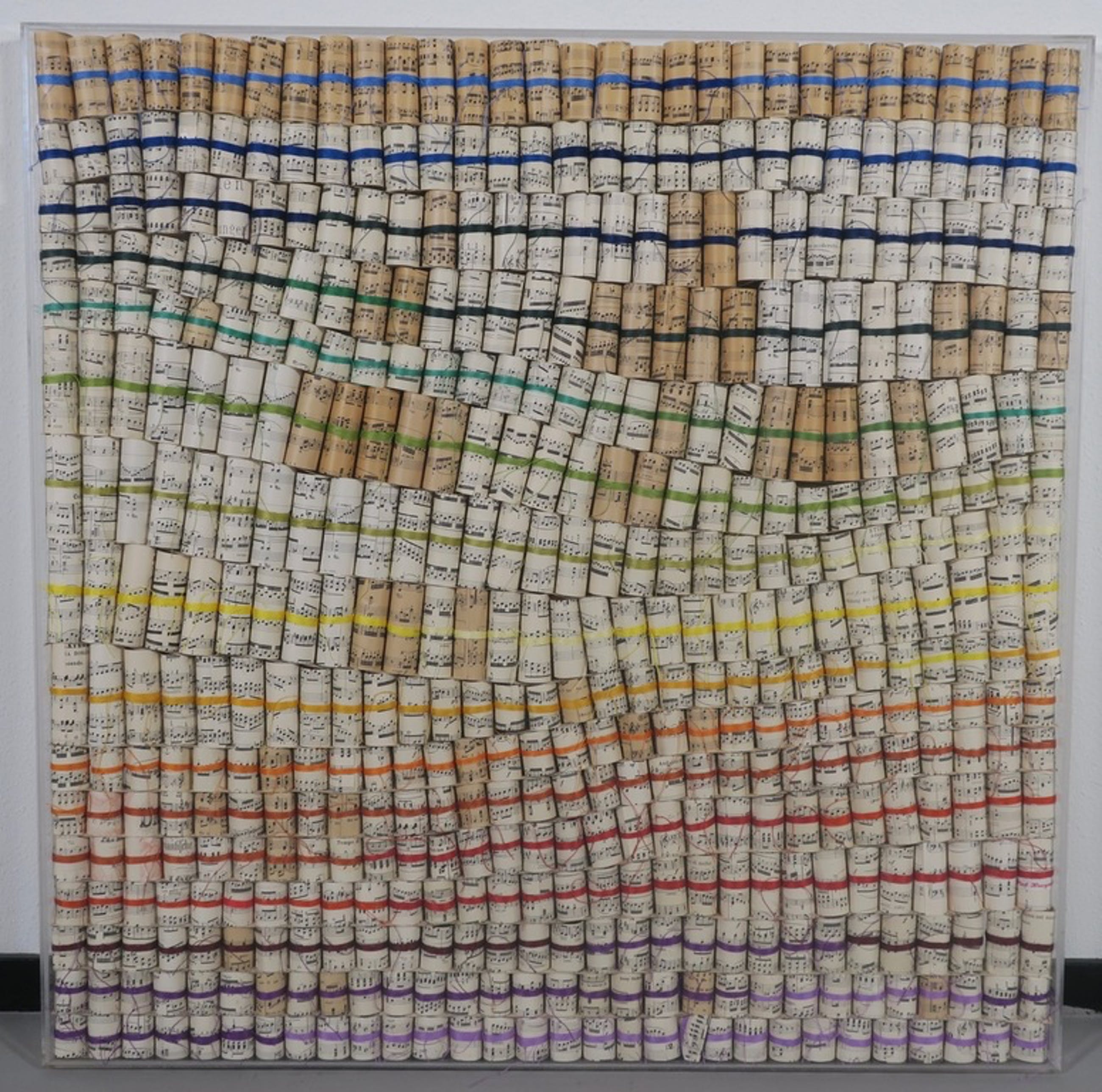 Materiaal: Opgerolde stukjes bladmuziek omwikkeld met diverse kleuren garen in een plexiglas box/lijst