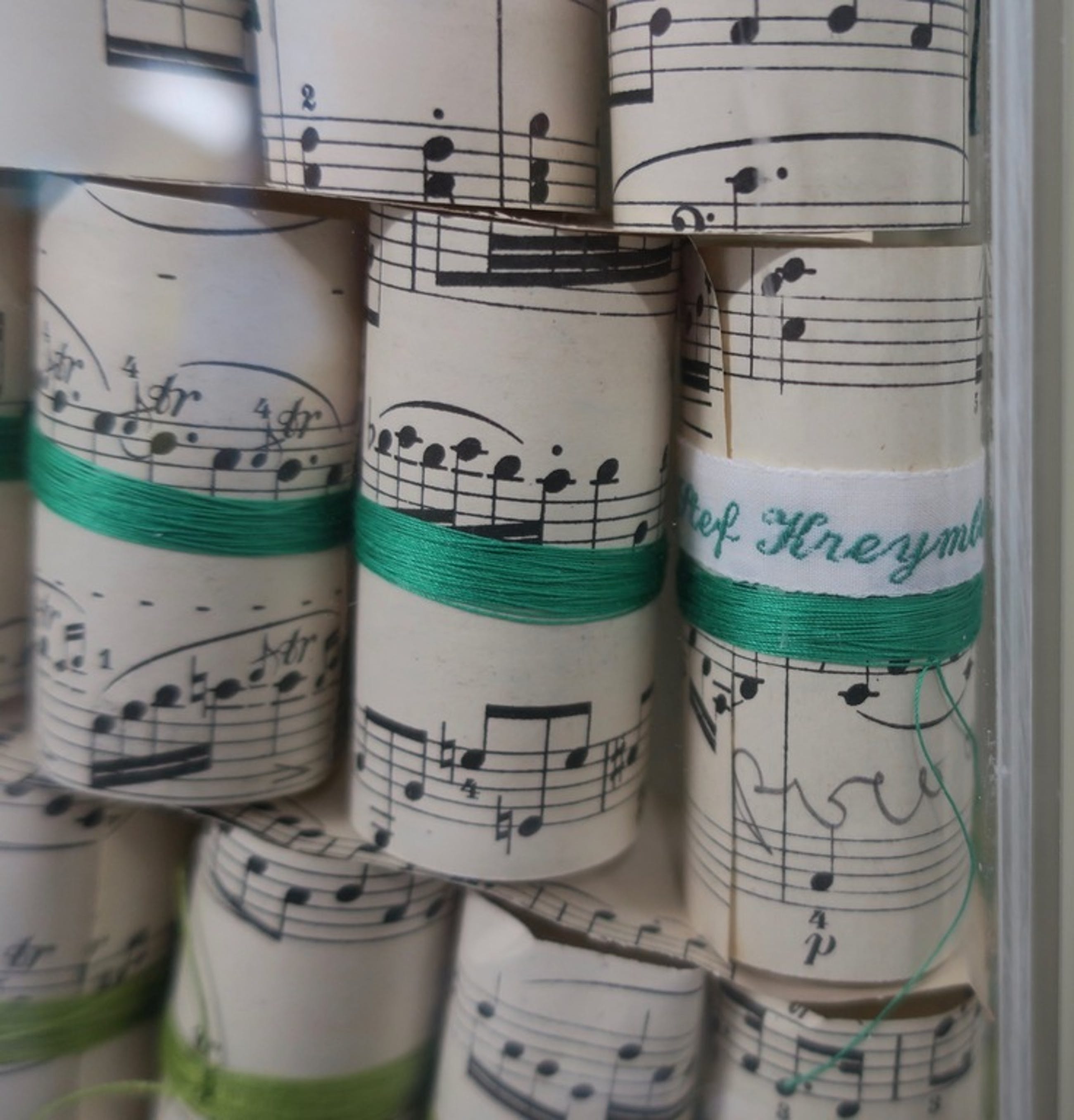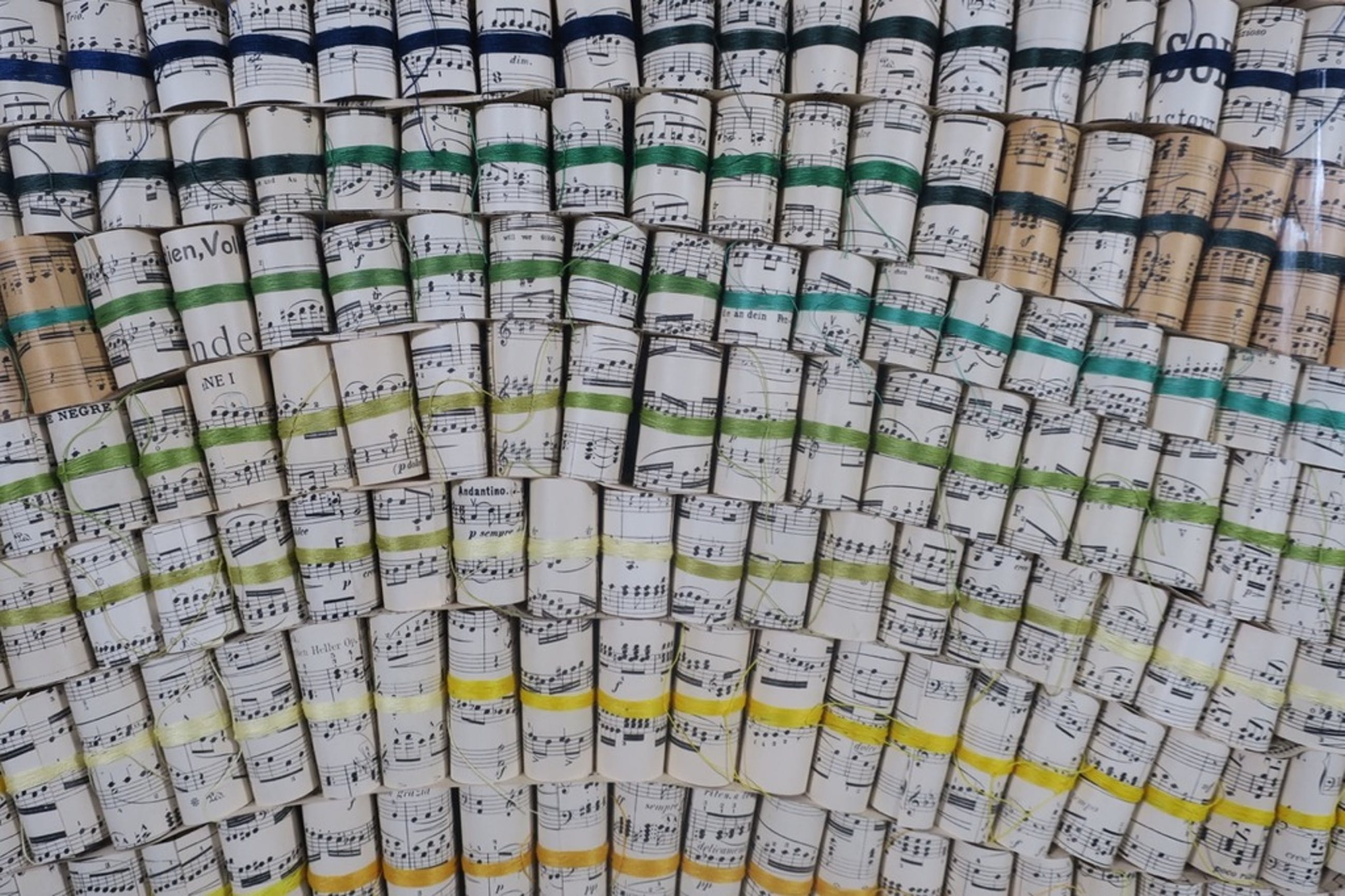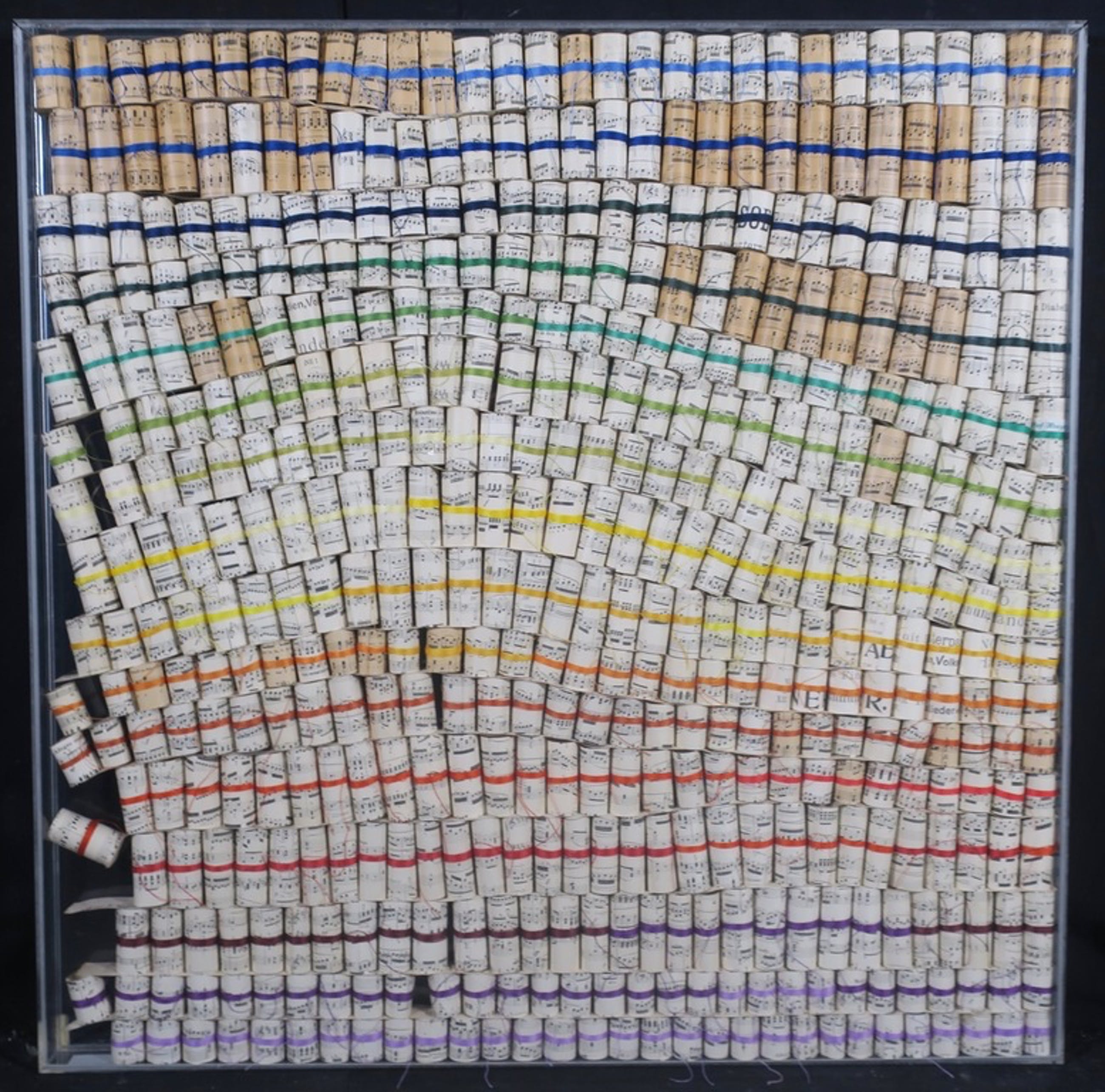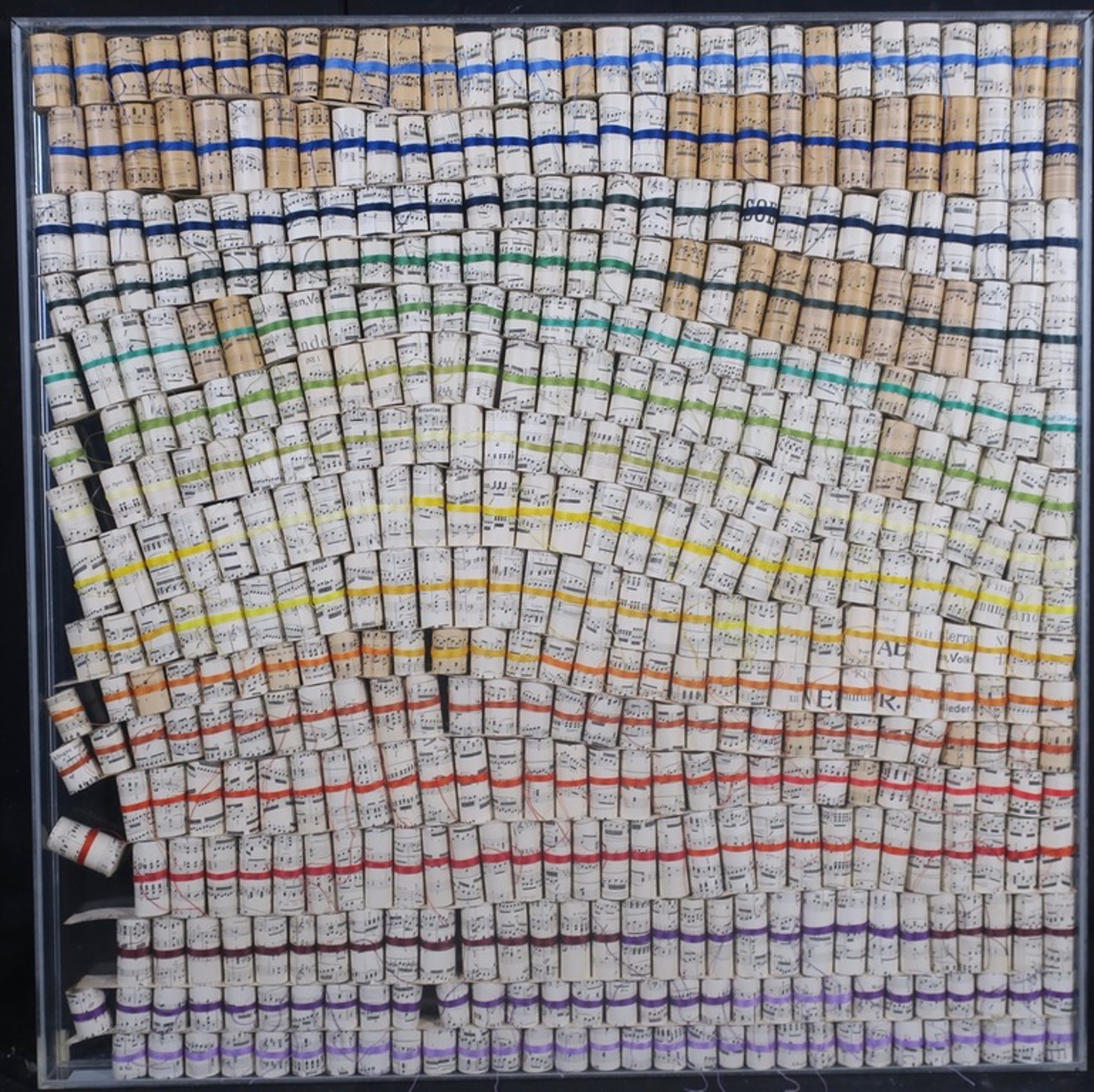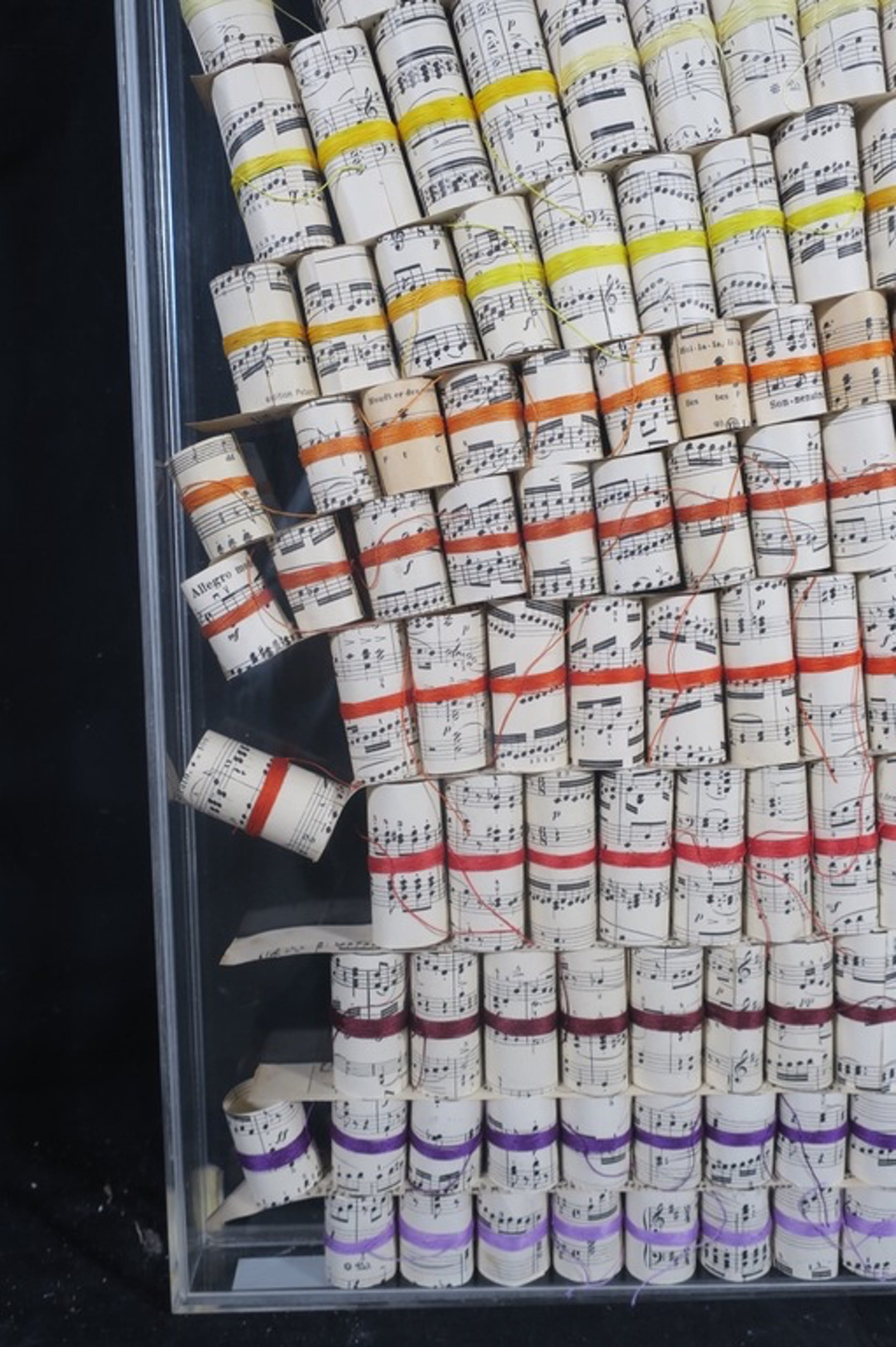 Materiaal: Opgerolde stukjes bladmuziek omwikkeld met diverse kleuren garen in een plexiglas box/lijst
