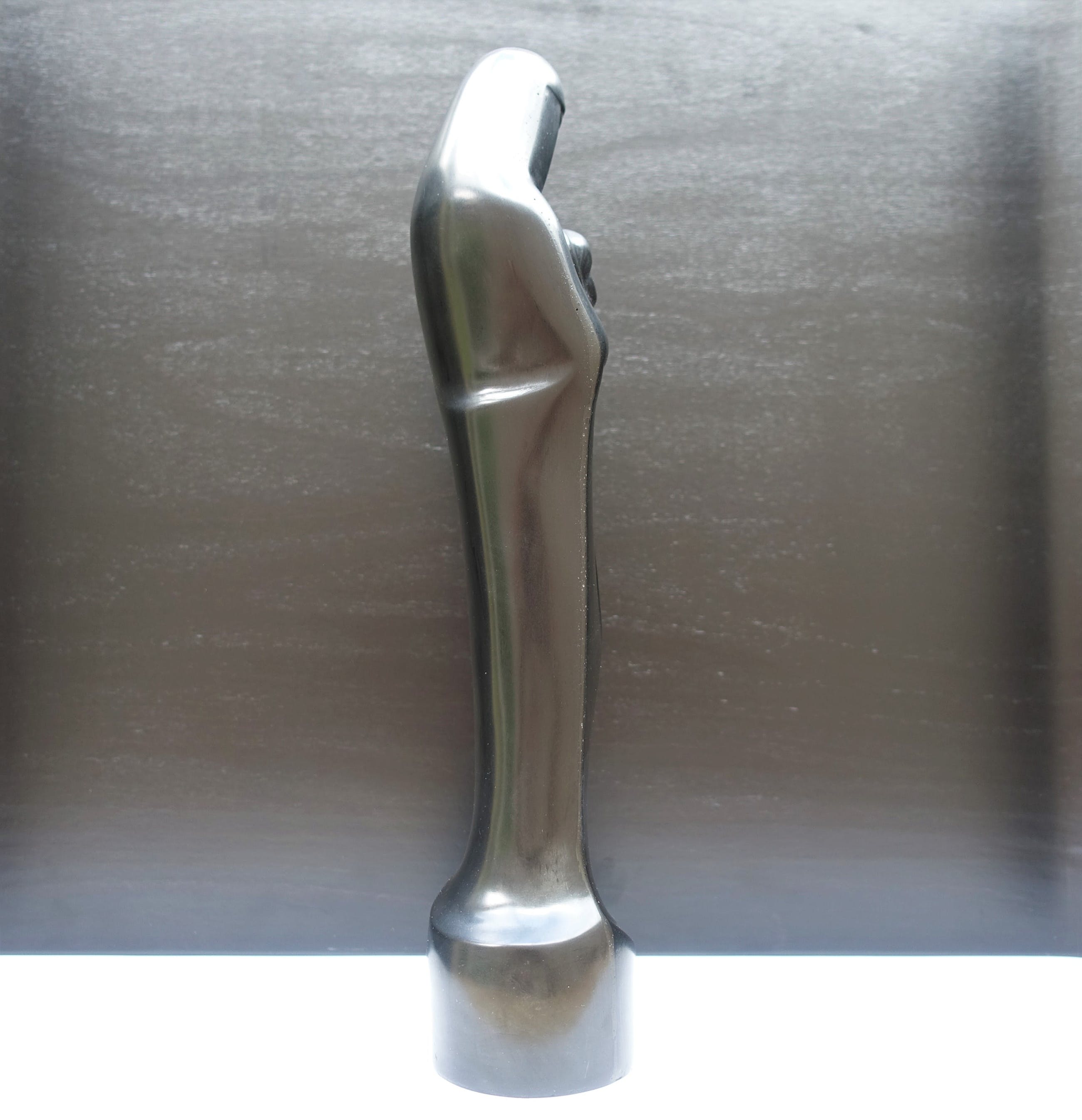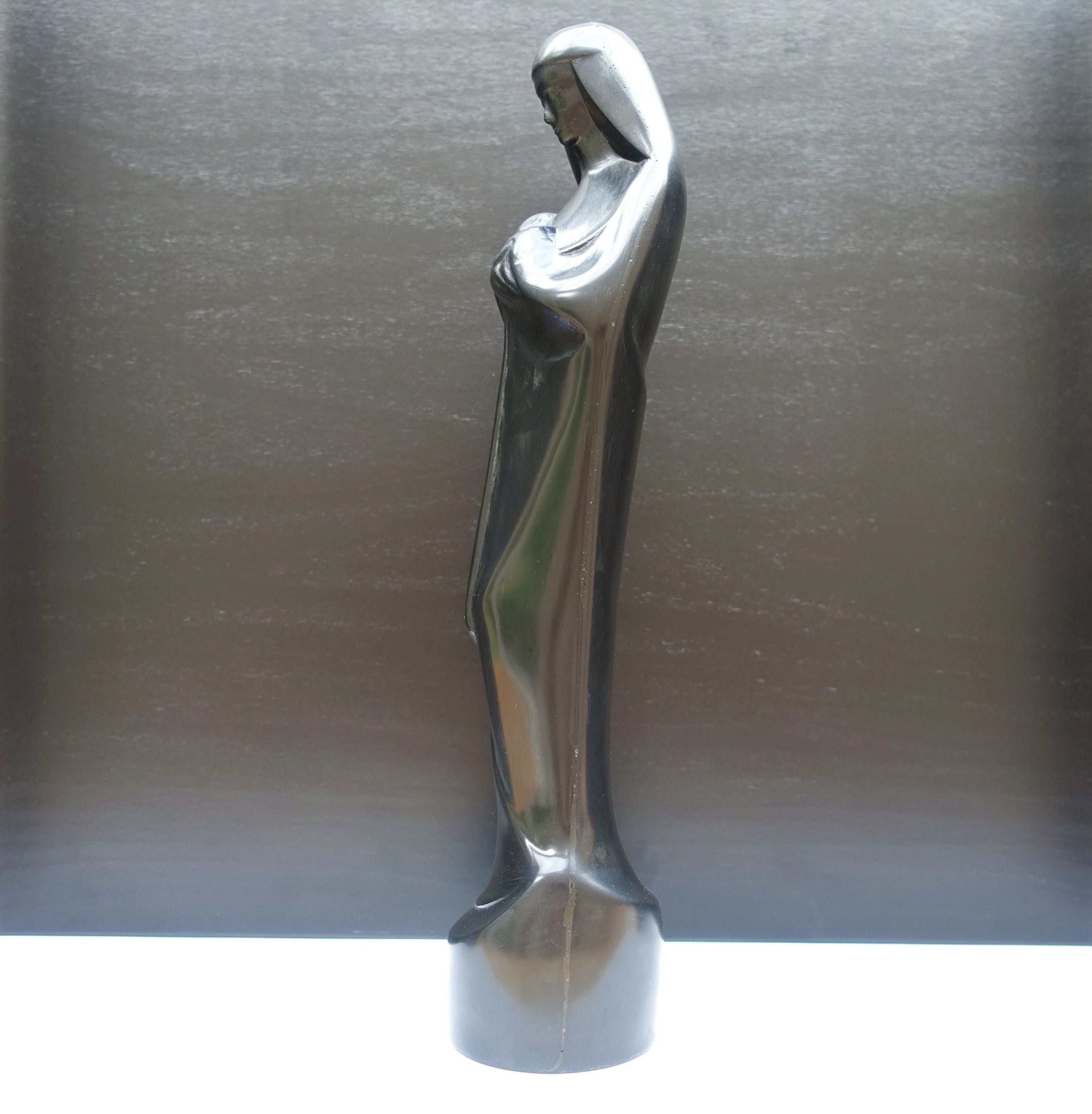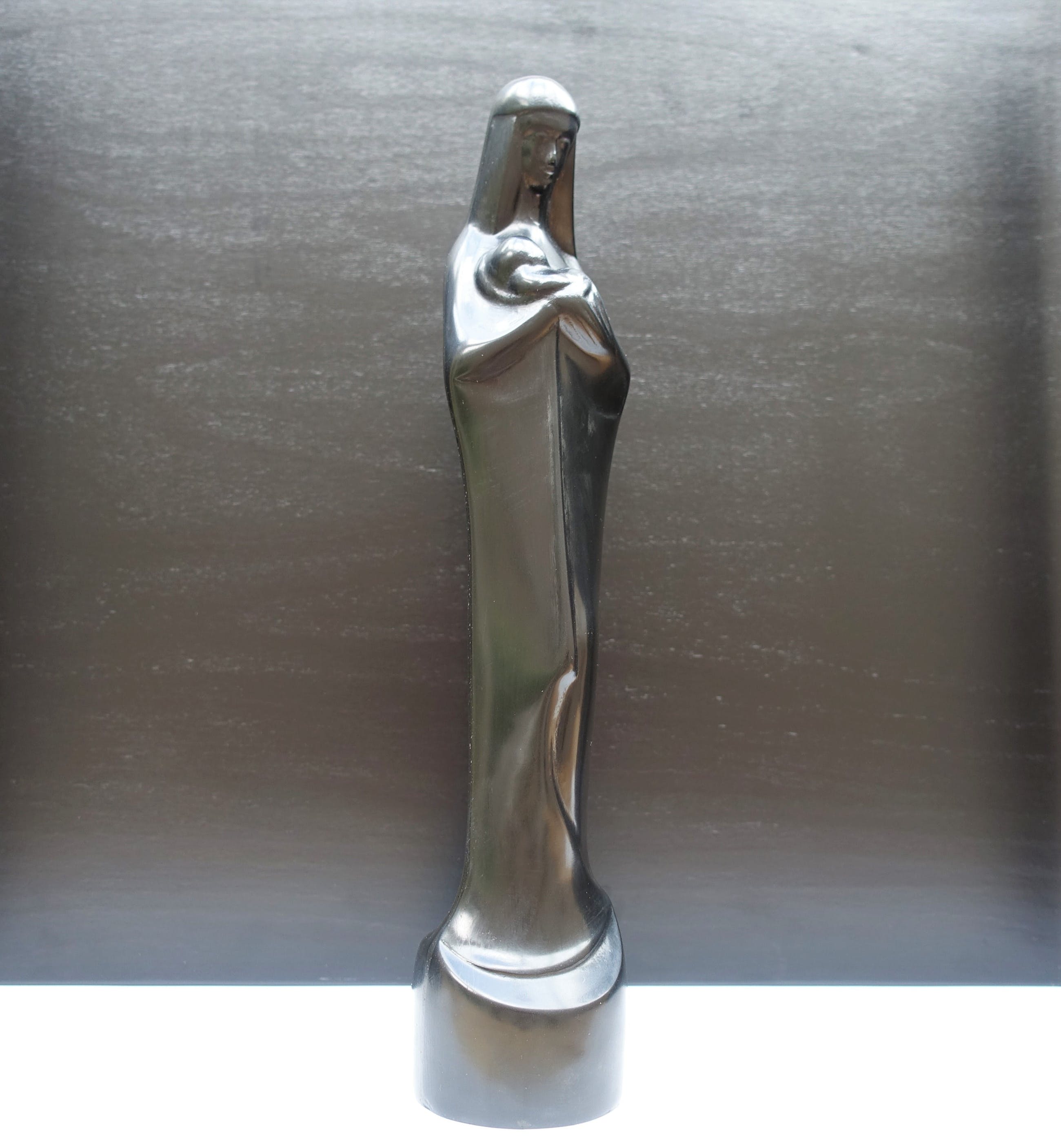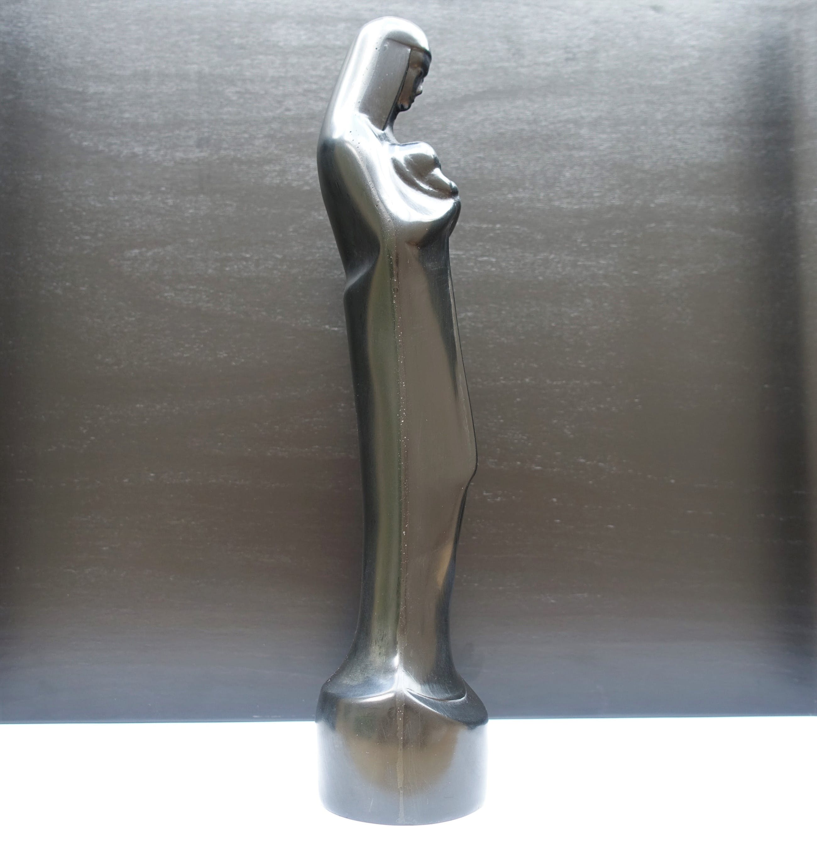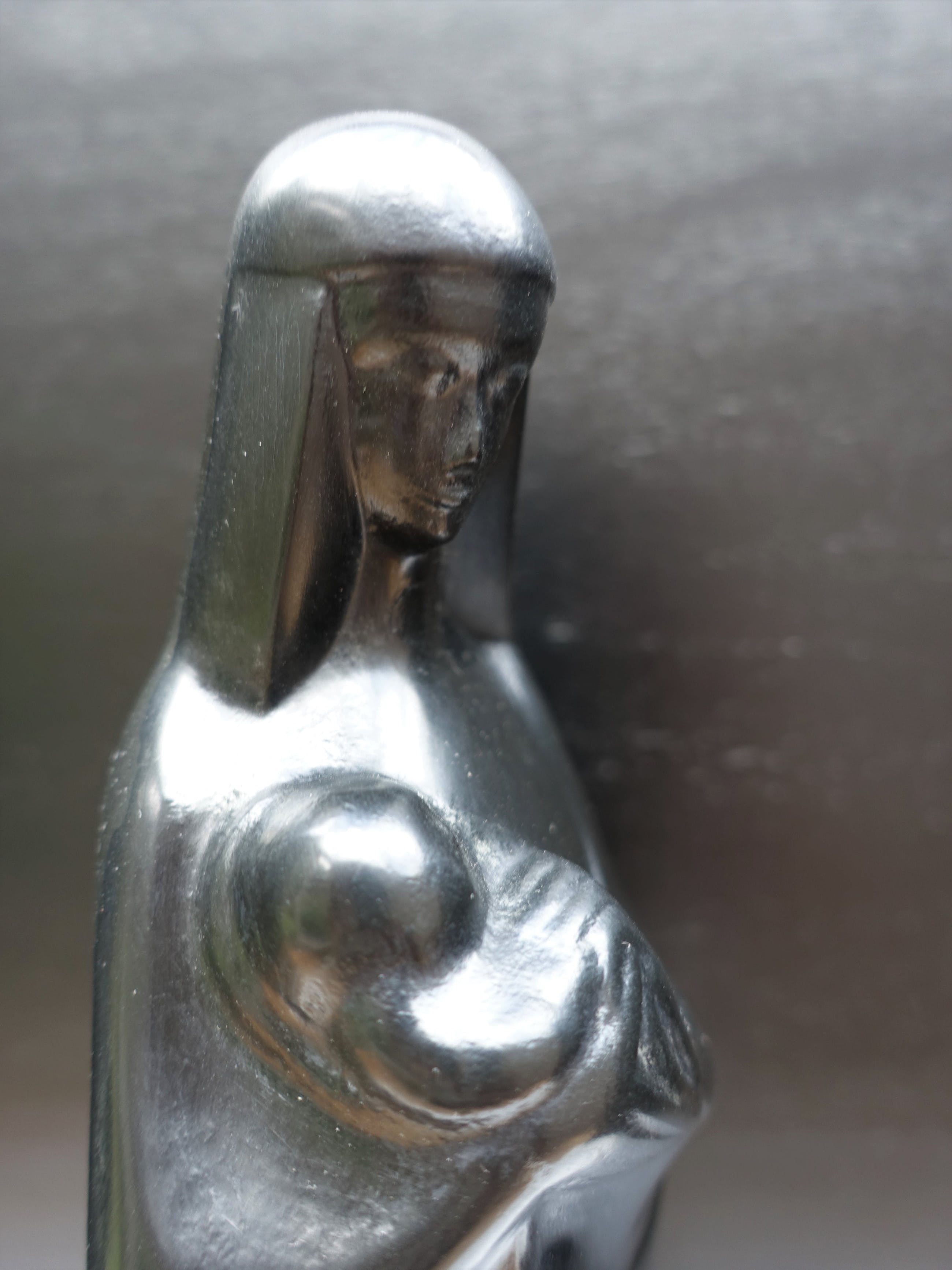 Steph Uiterwaal (1889-1960) Een bakelieten madonna met kind, ontworpen 1925-1928. Voorstelling is vooral bekend van de persglazen uitvoering door Glasfabriek Leerdam. Van het beeld zijn naast glazen ook bronzen en gietijzeren uitvoering bekend, deze bakelieten(niet gesigneerde) uitvoering zult u niet snel elders tegenkomen. Op de eerste foto komt de kleur het best tot zijn recht.