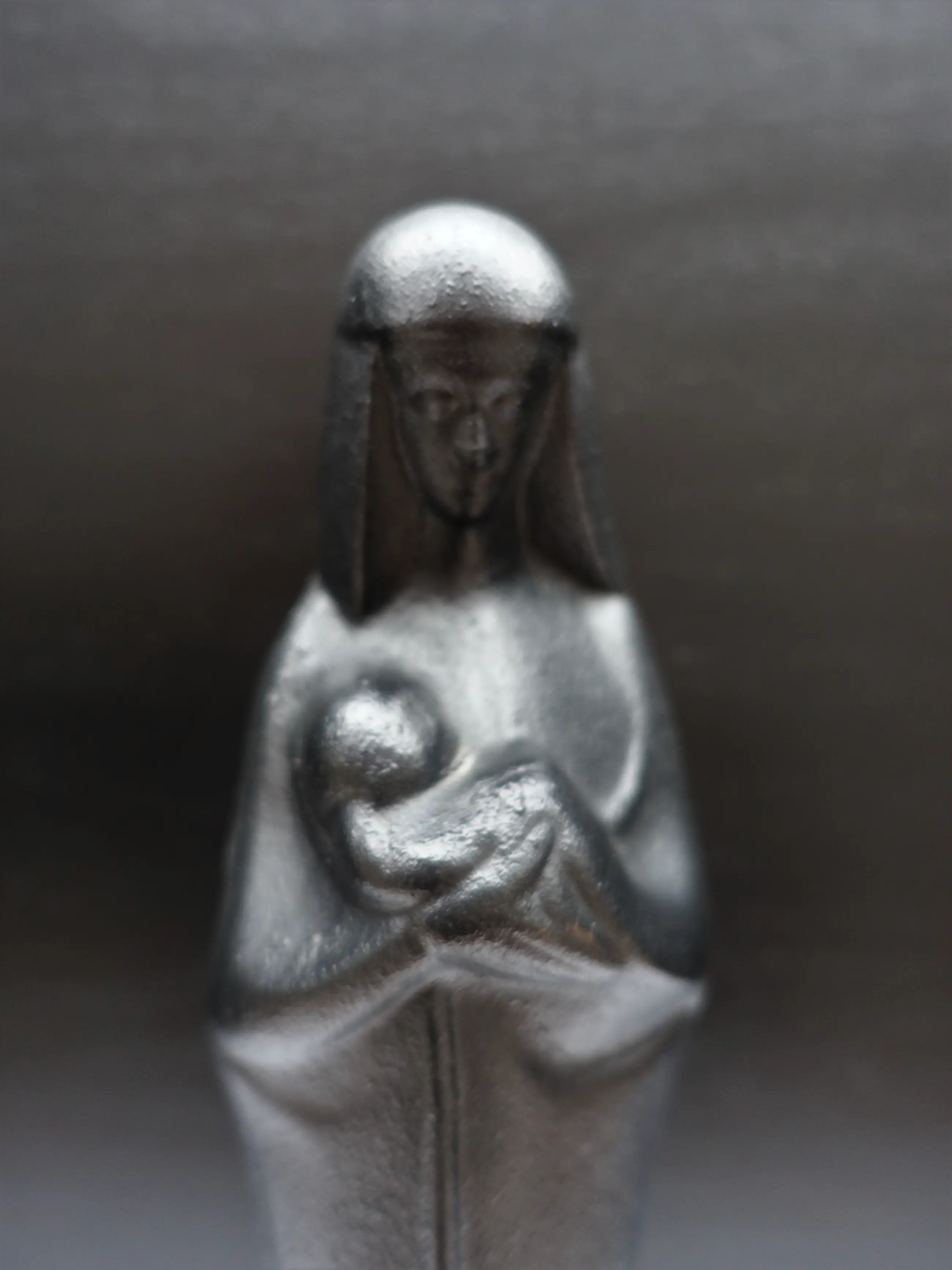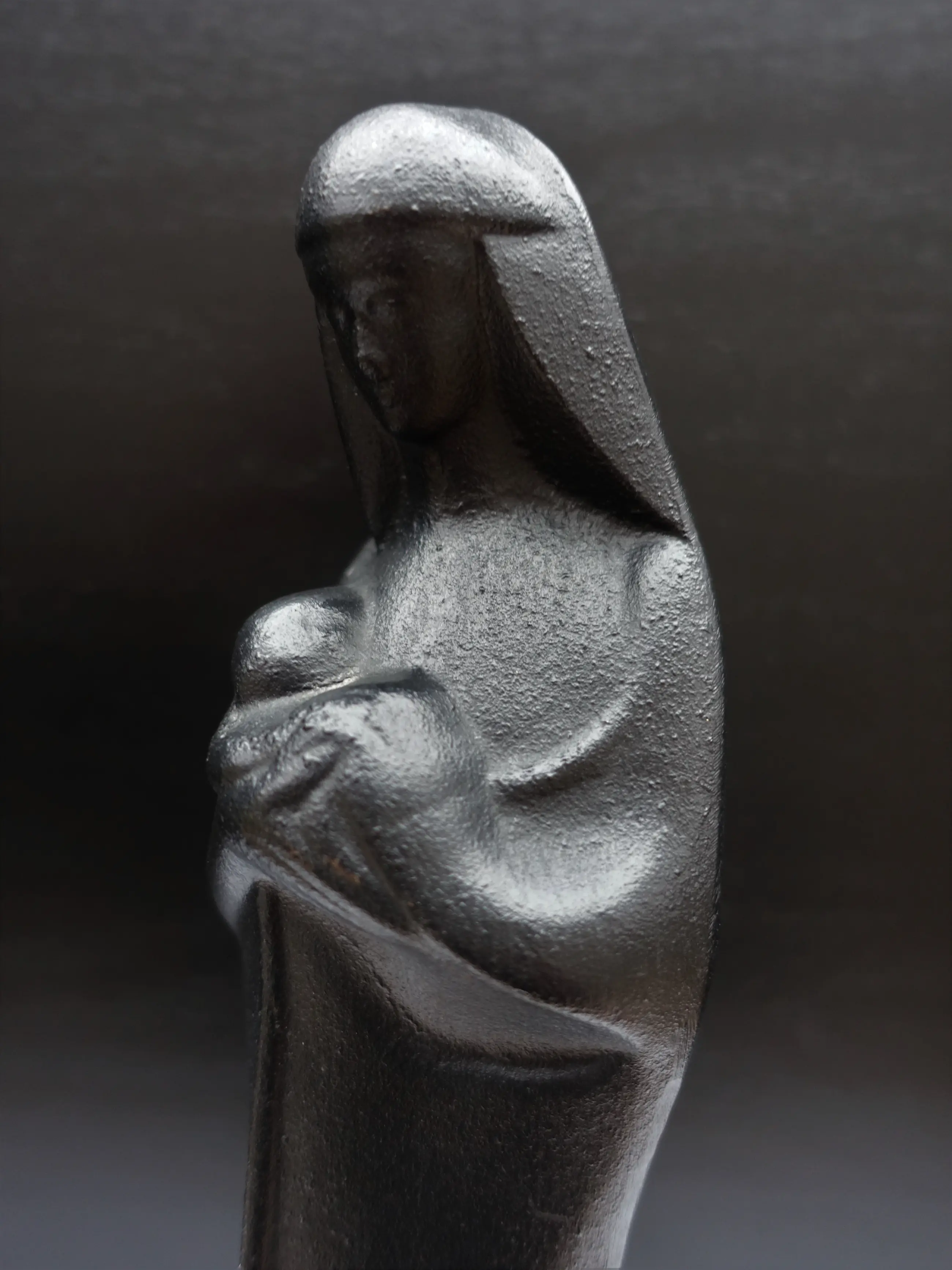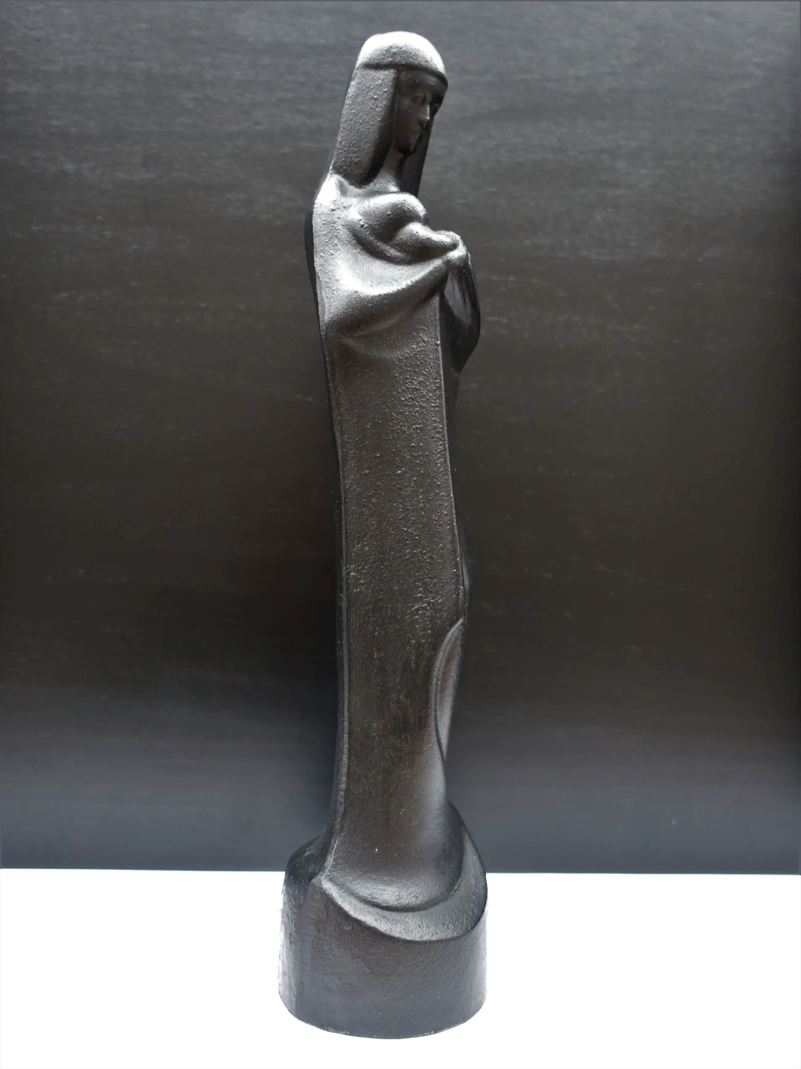 Een gietijzeren uitvoering van de madonna met kind, ontworpen 1925-1928. Voorstelling is vooral bekend van de persglazen uitvoering door Glasfabriek Leerdam. Van het beeld zijn naast glazen ook bronzen en zelfs bakelieten uitvoeringen bekend, deze gietijzeren (niet gesigneerde) uitvoering komt minder voor dan de uitvoering in glas. Mooi scherp gietsel.