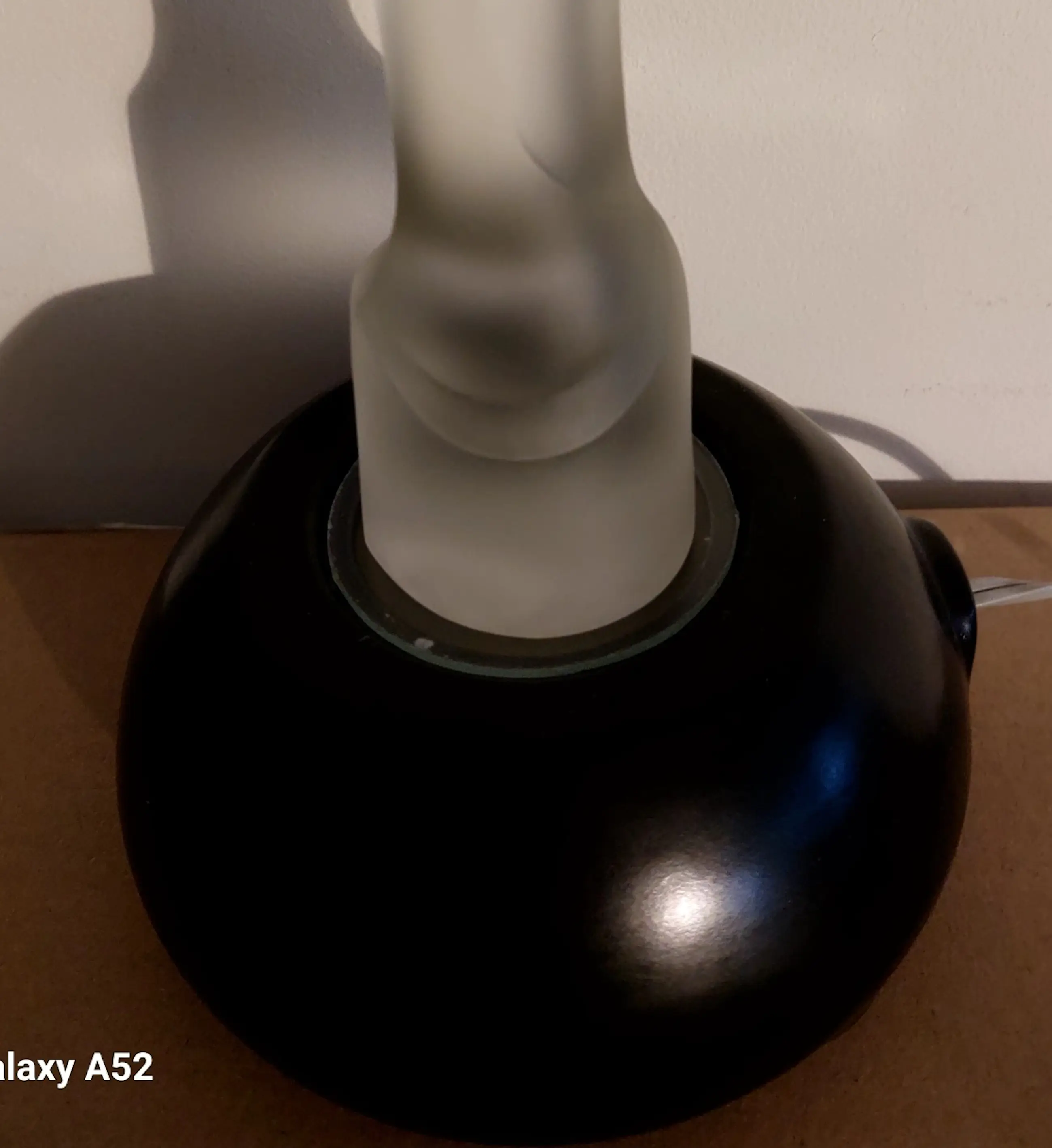 In matglas uitgevoerde madonna met keramische voet waarin een lampje. Eerste uitgave was in 1928. Het geheel in top conditie. De opgegeven breedte en dieptematen zij die van de keramische sokkel.