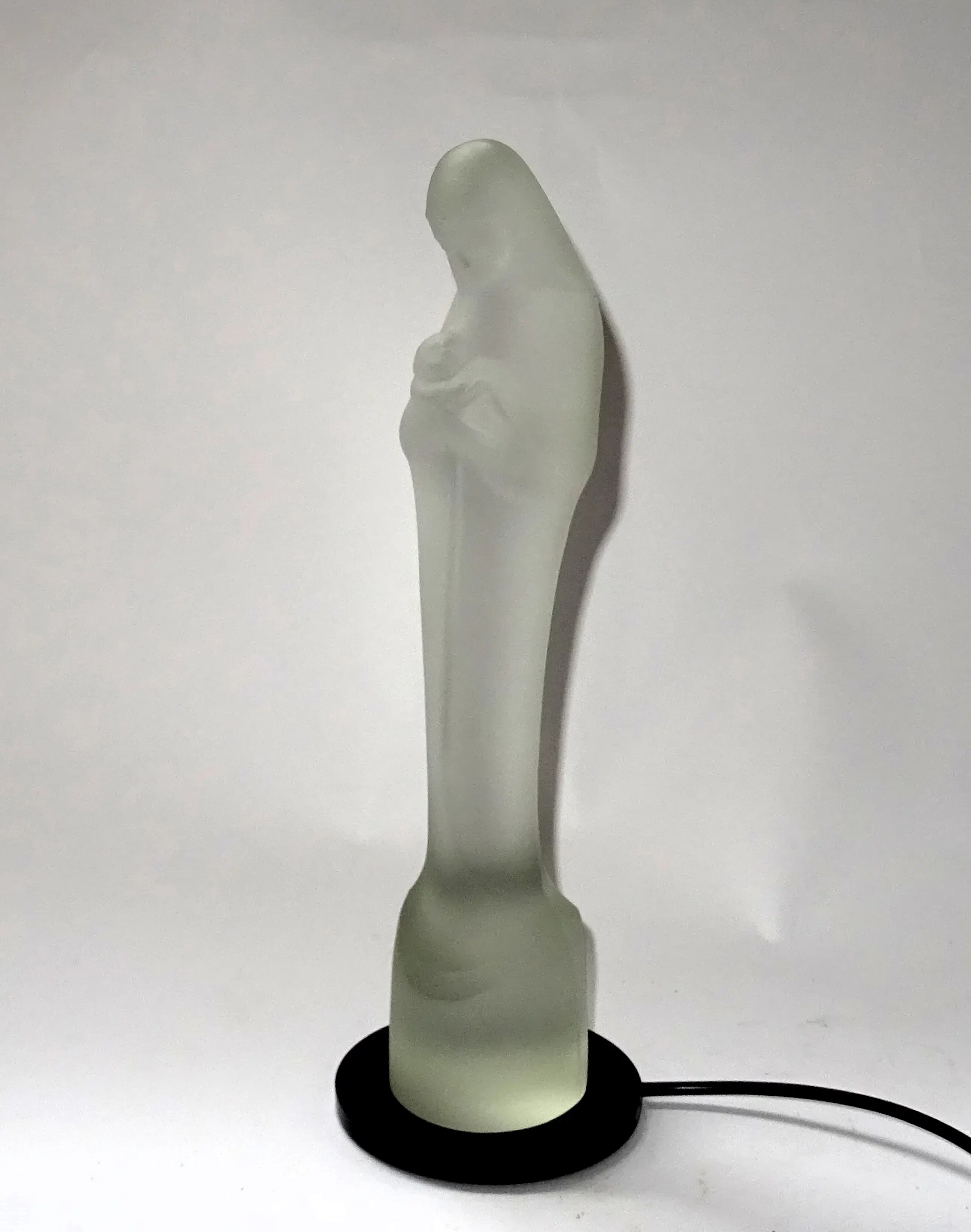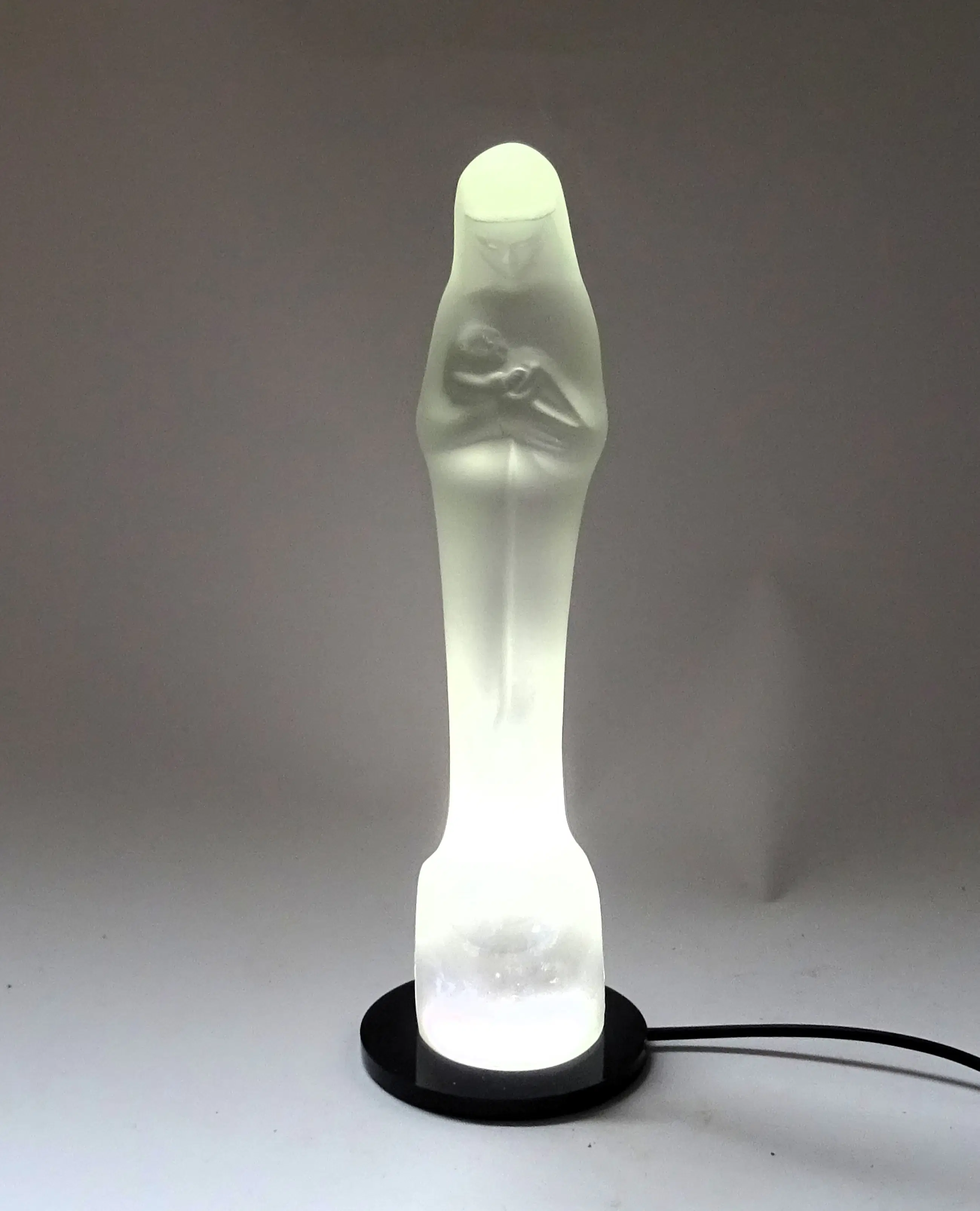 Originele Madonna met kind, ontwerp Stef Uiterwaal voor Glasfabriek Leerdam 1929. Oude uitvoering, gesatineerd en massief . Met nieuwe warm wit led verlichting.