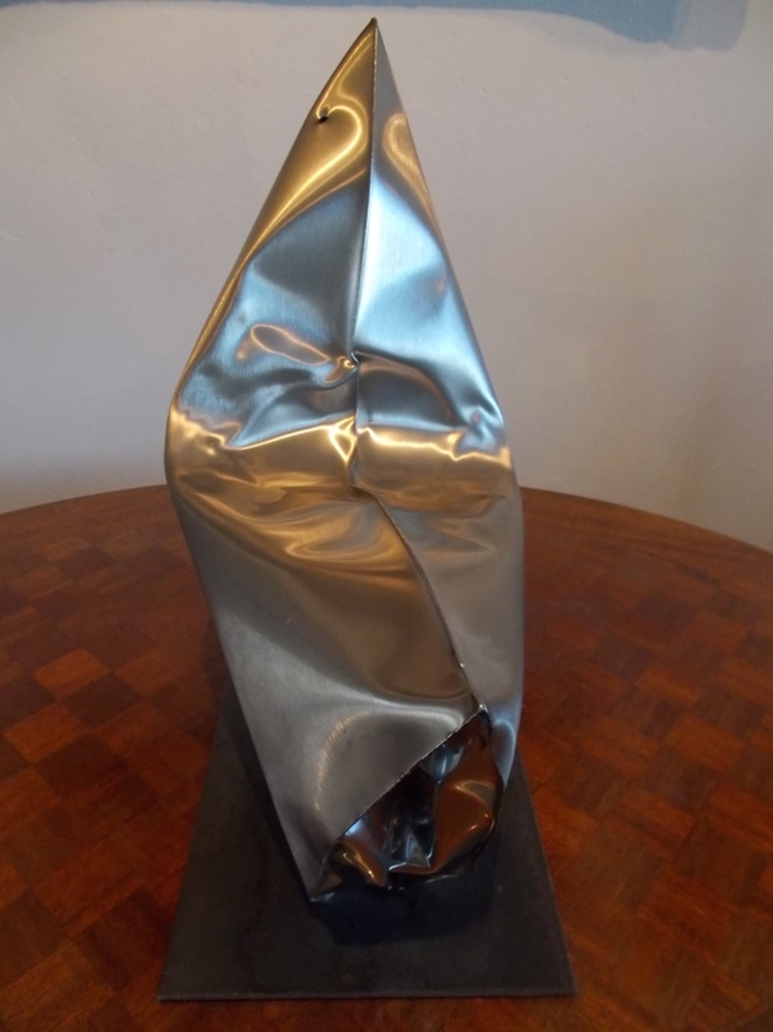 Geborsteld roestvrij stalen sculptuur van de britse beeldend kunstenaar Stephen Newby,gebruikt de techniek van het opblazen van stalen "Kussens".