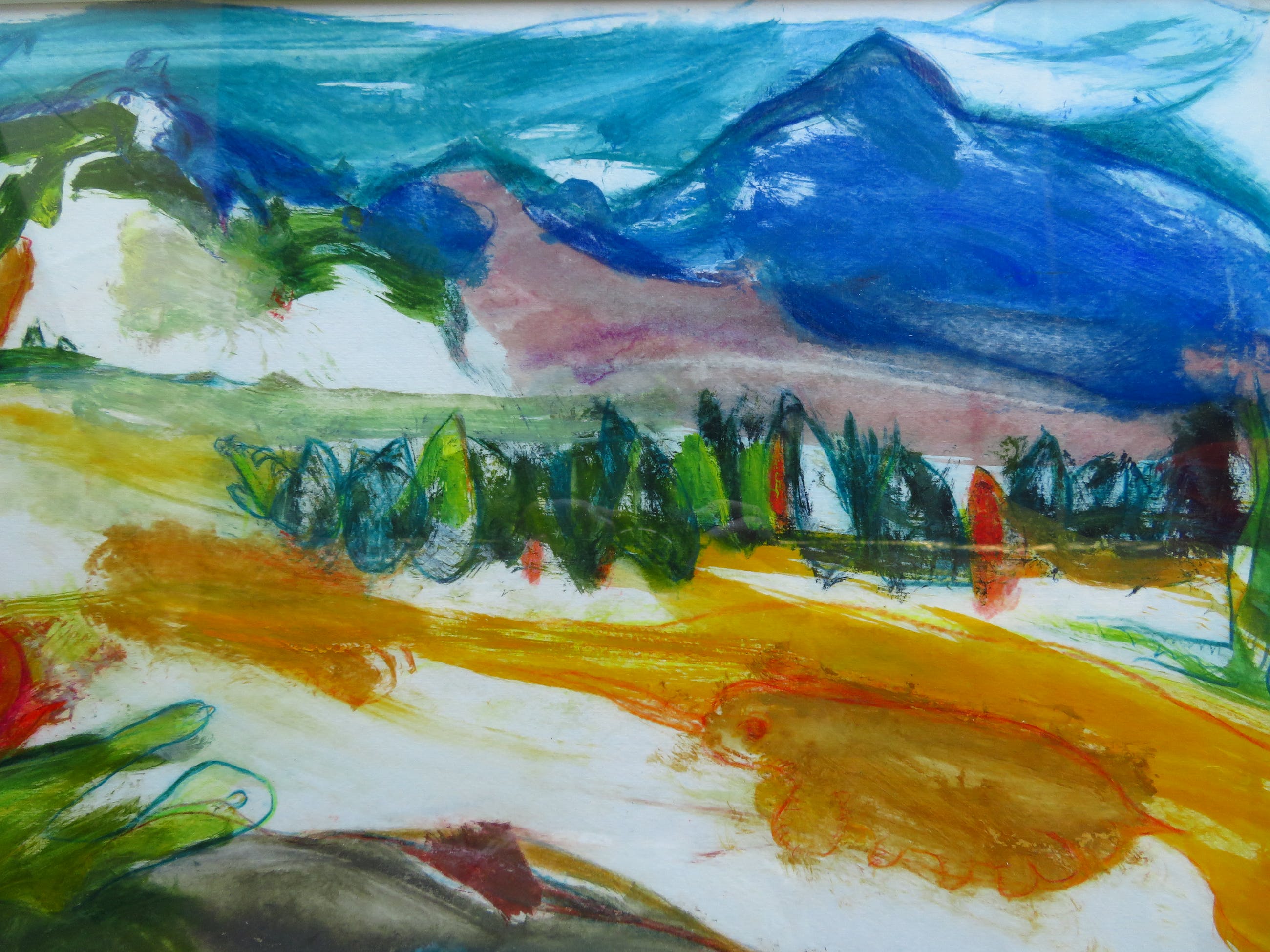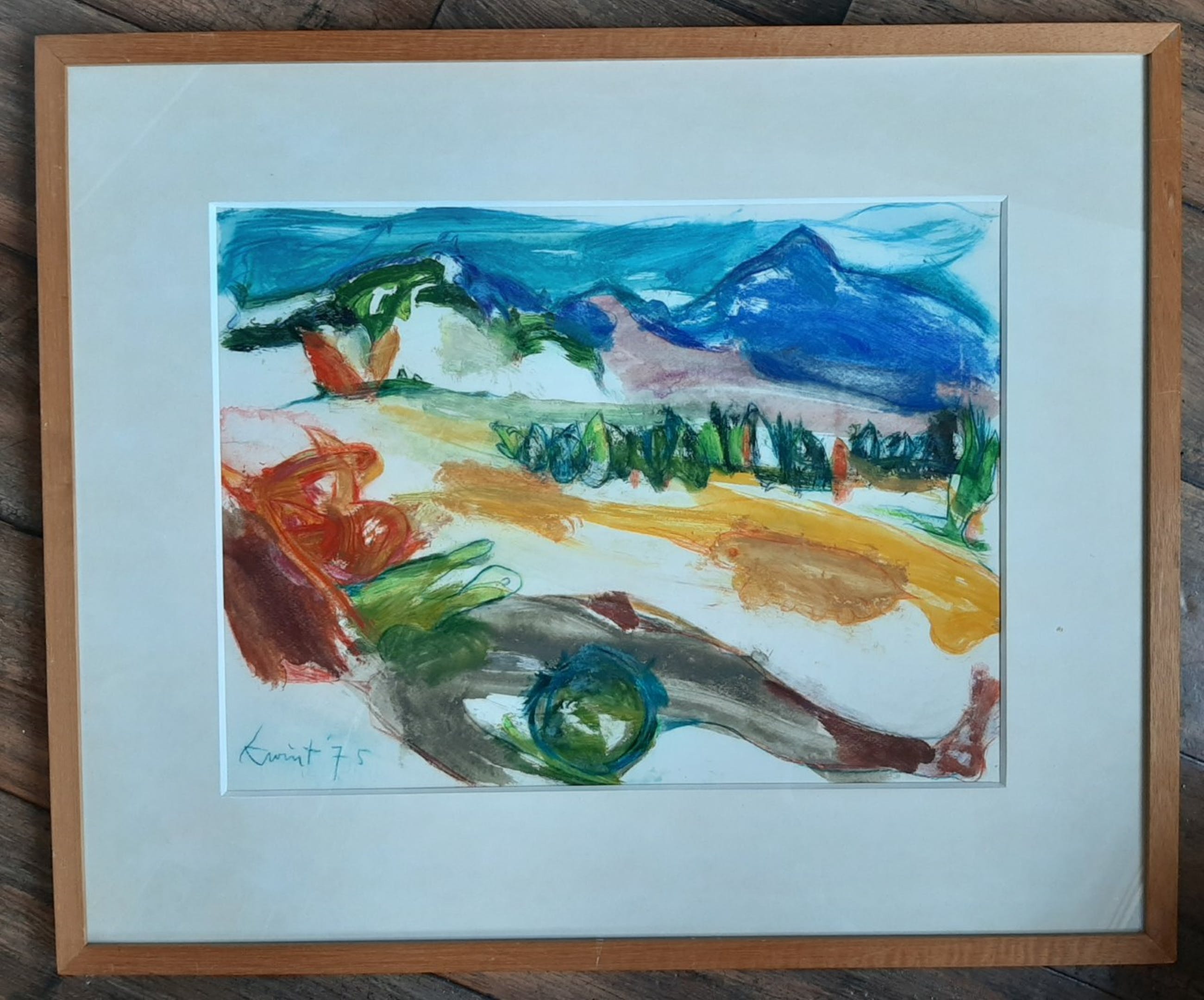 De gouache is met passe-partout achter glas in houten lijst ingelijst.