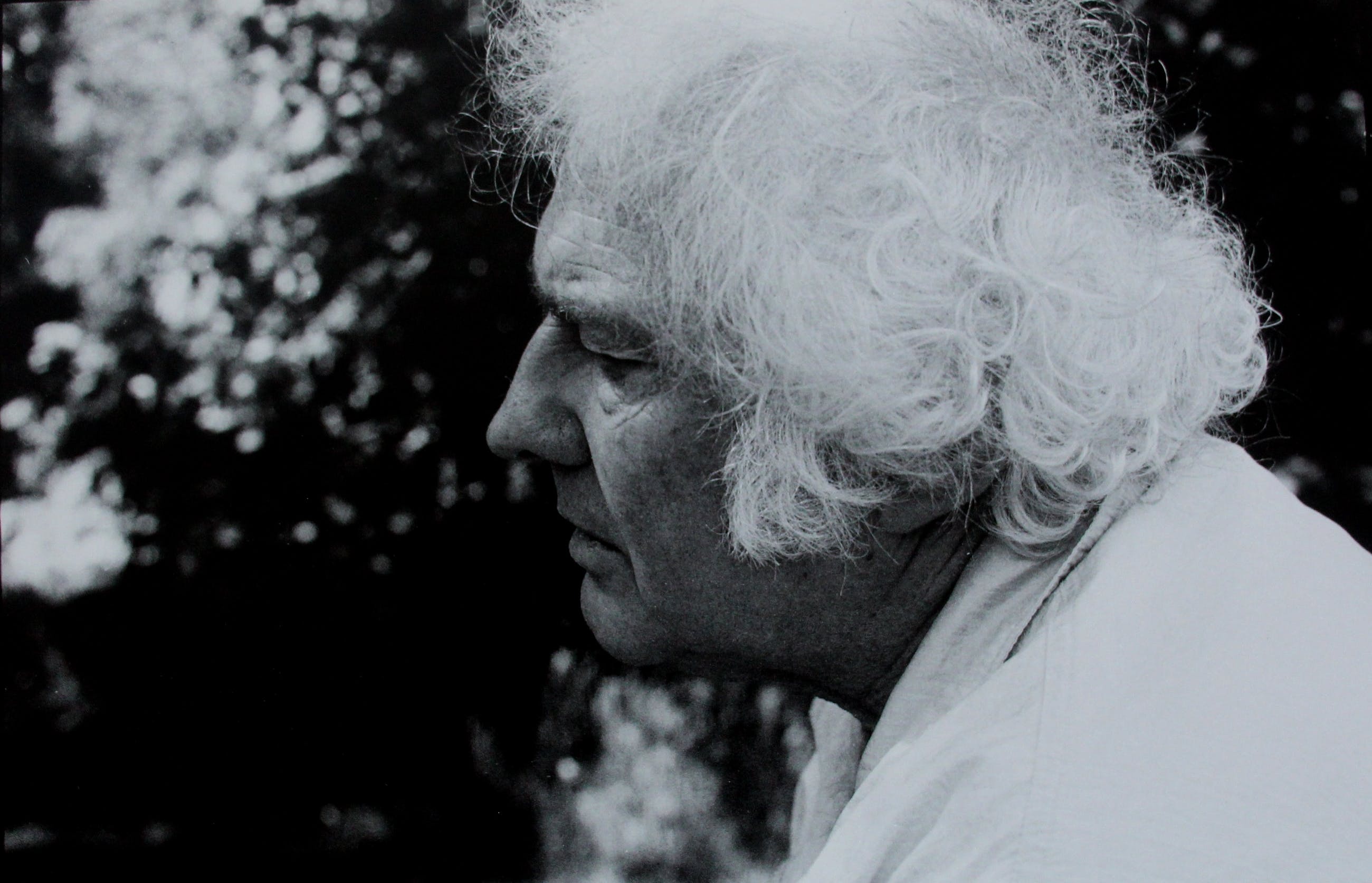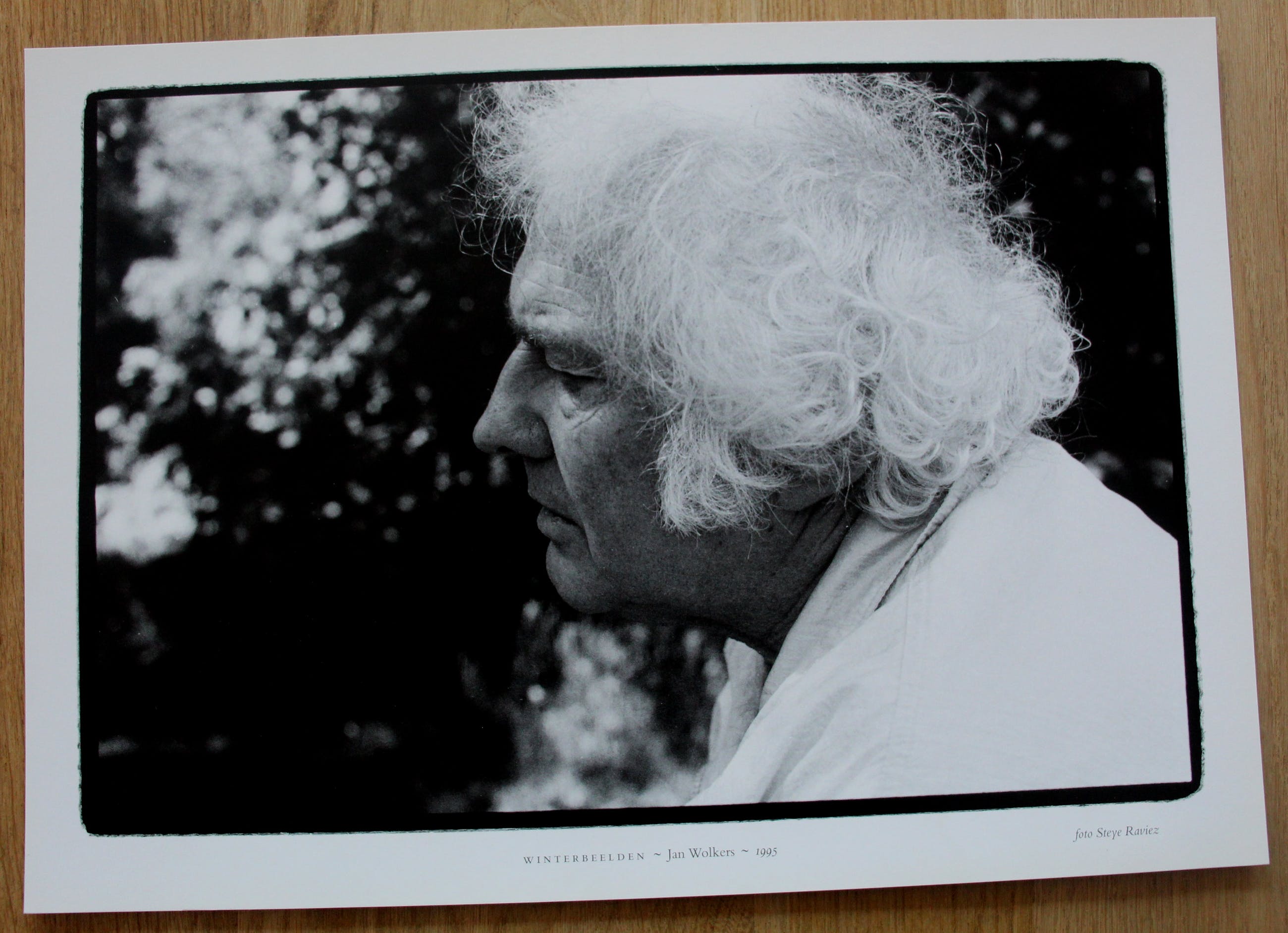 Karakteristieke foto door Steye Raviez (1942-2017). Fotografeerde Jan Wolkers in de natuurlijke omgeving van zijn woning op Texel. Gemaakt voor de serie Winterbeelden in 1995. Afmetingen blad: H31 x b44cm. Afbeeldingen voorstelling: H27 x b40cm.