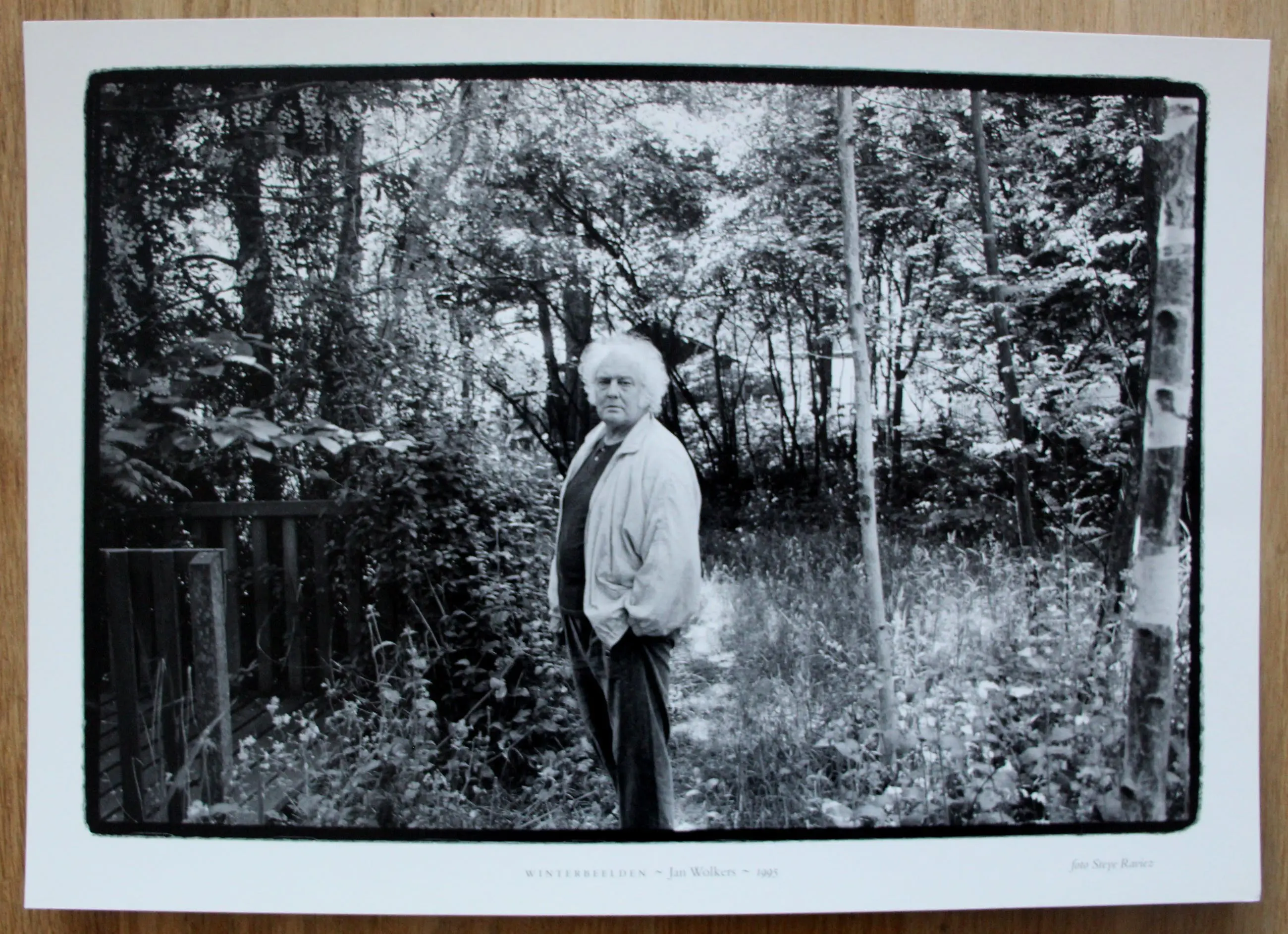 Karakteristieke foto door Steye Raviez (1942-2017). Fotografeerde Jan Wolkers in de natuurlijke omgeving van zijn woning op Texel. Gemaakt voor de serie Winterbeelden in 1995. Afmetingen blad: H31 x b44cm. Afbeeldingen voorstelling: H27 x b40cm.