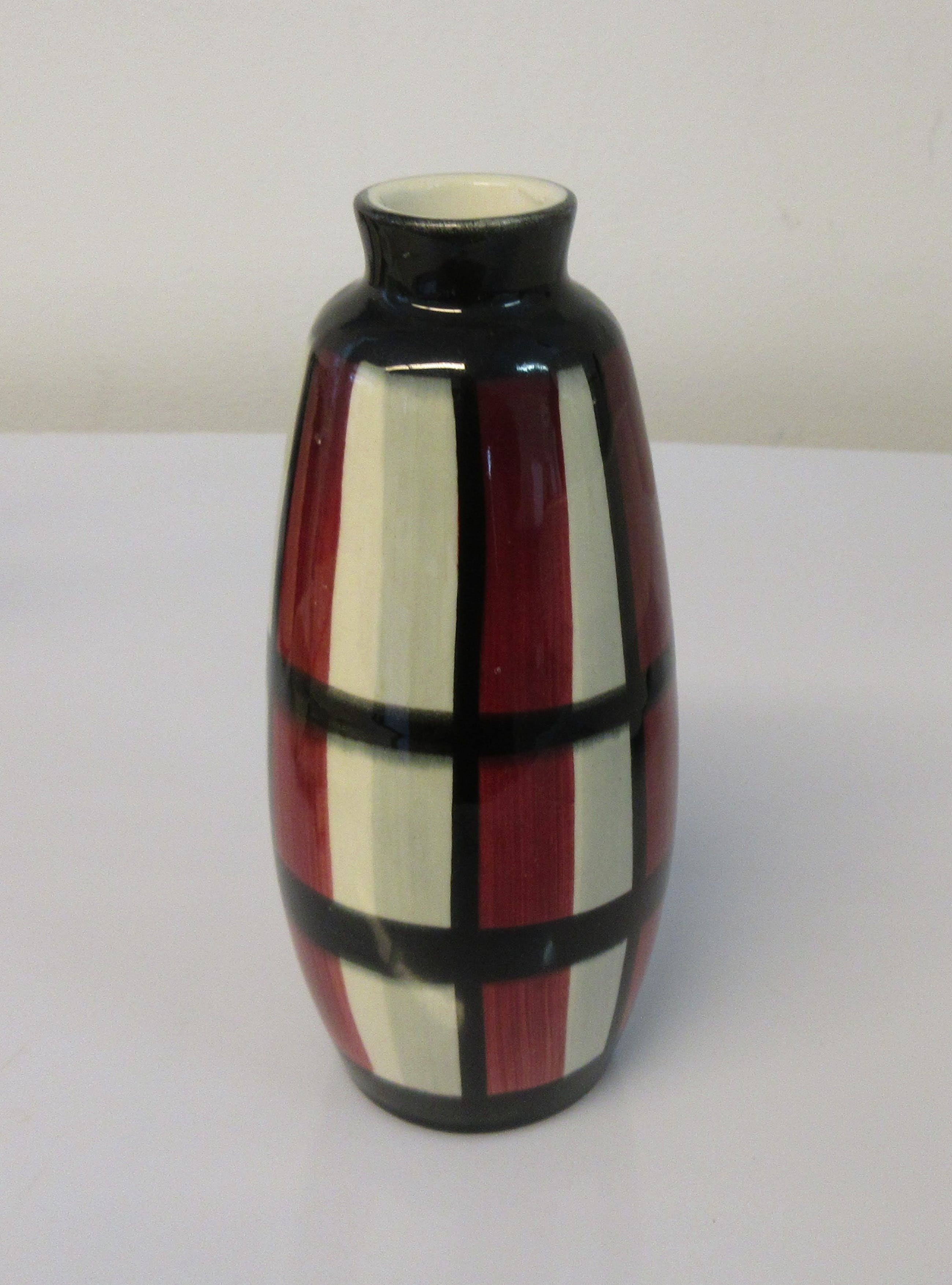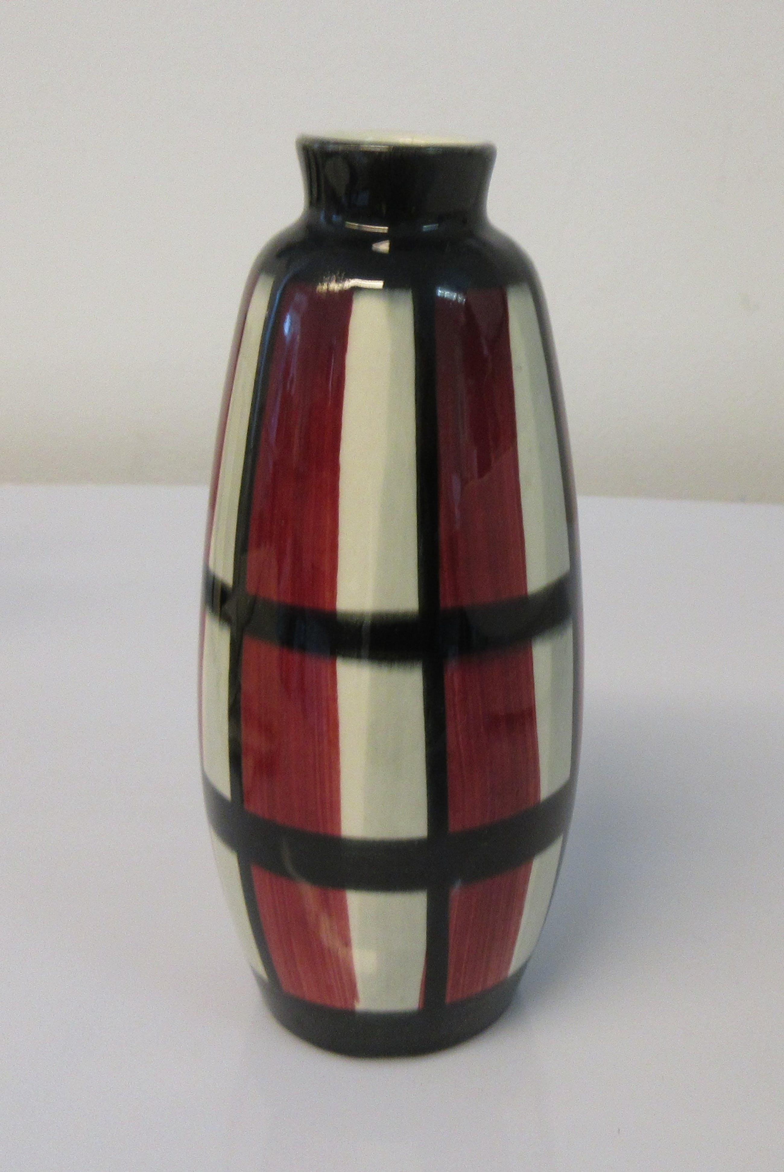 Fifties hand beschilderd vaasje met een rood, zwart witte geometrisch decor. Gemerkt aan de onderzijde.