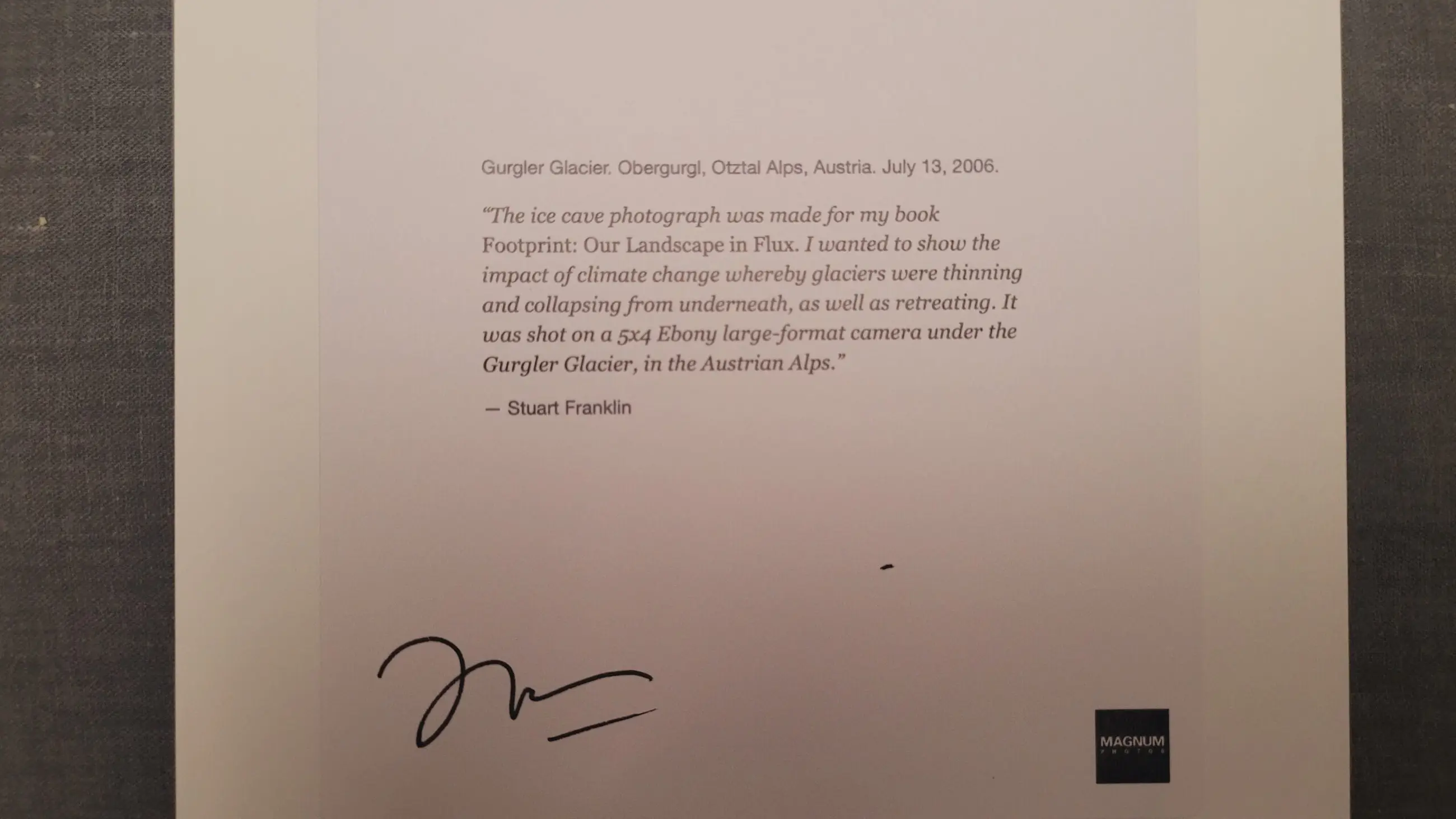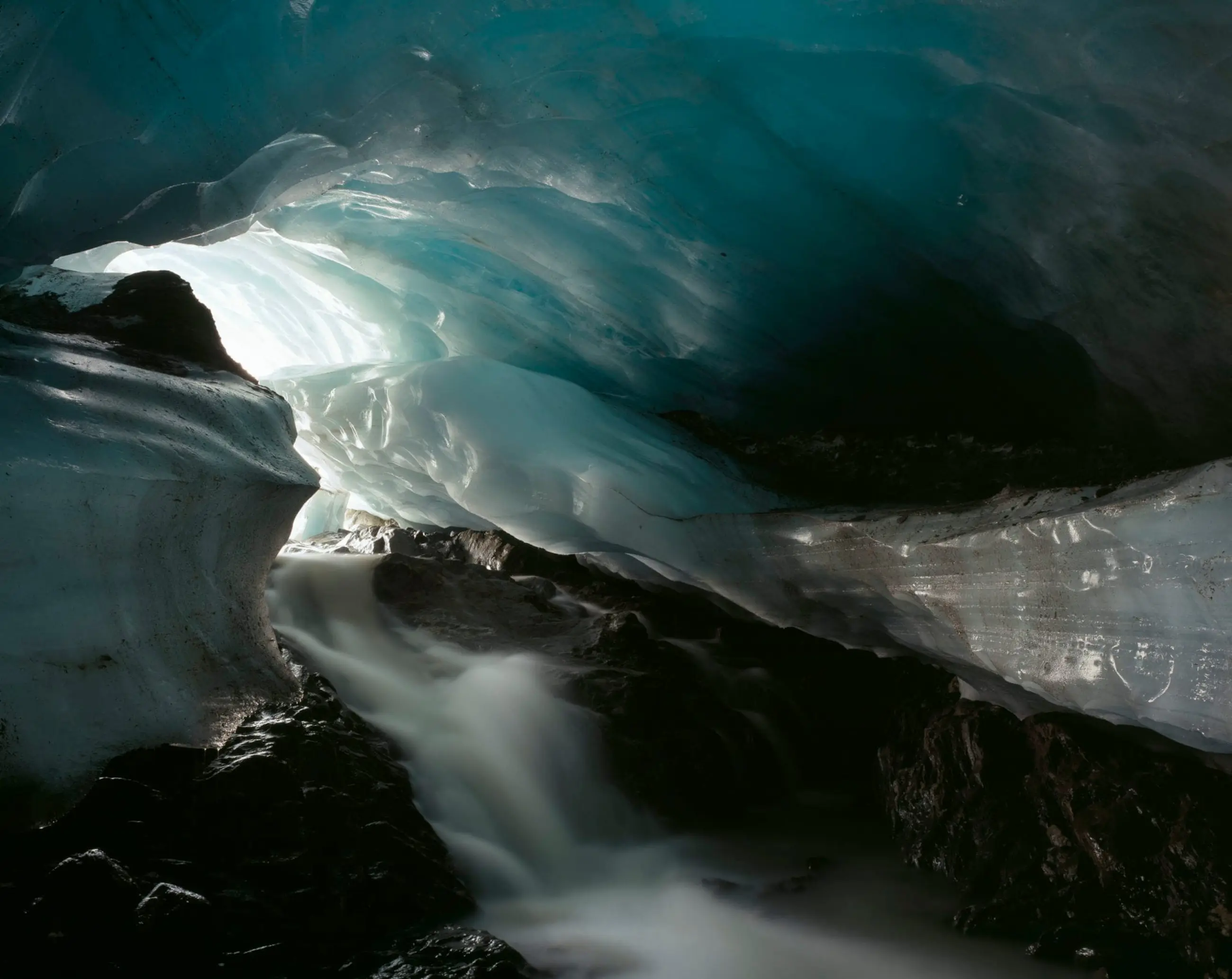 Stuart Franklin staat bekend om fotografie die sterke compositie koppelt aan een documentair geweten - beelden die niet alleen een plek tonen, maar je uitnodigen om langer te kijken en dieper na te denken. In Gurgler Glacier (2006) leidt hij ons onder het oppervlak van de Alpen, een uitgehouwen ijskamer in waar smeltwater door de duisternis stroomt en aan de opening van de grot een koude, blauwgroene gloed samenkomt.