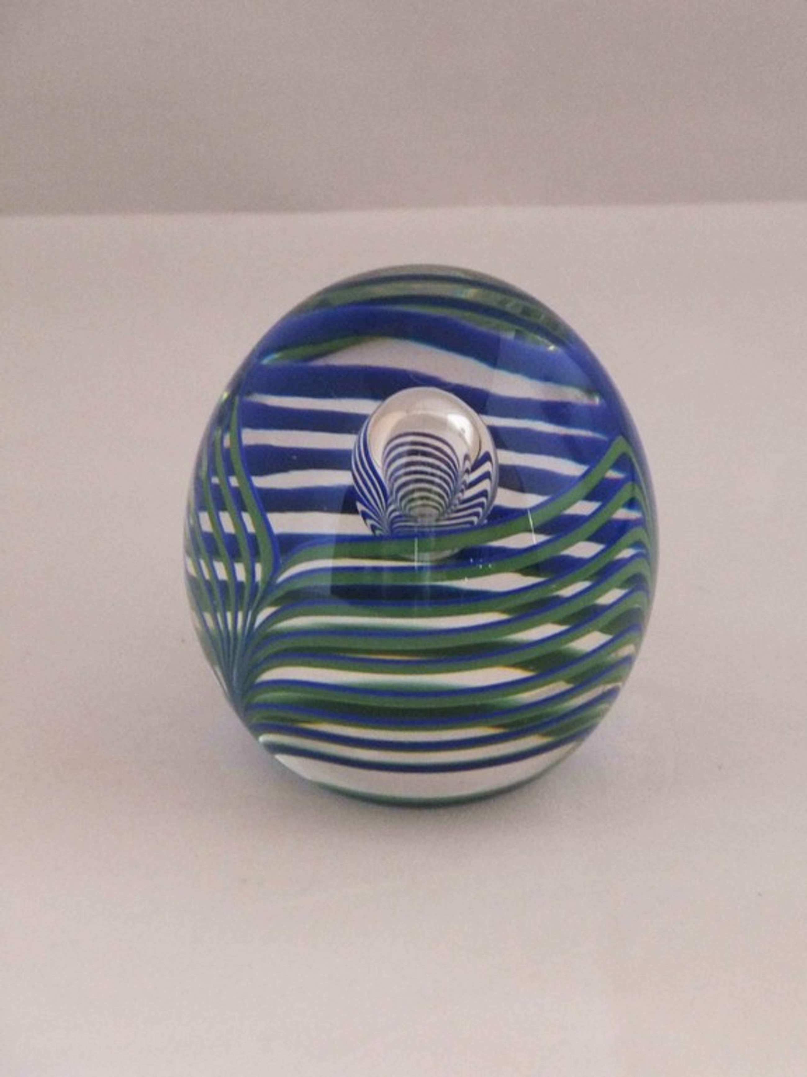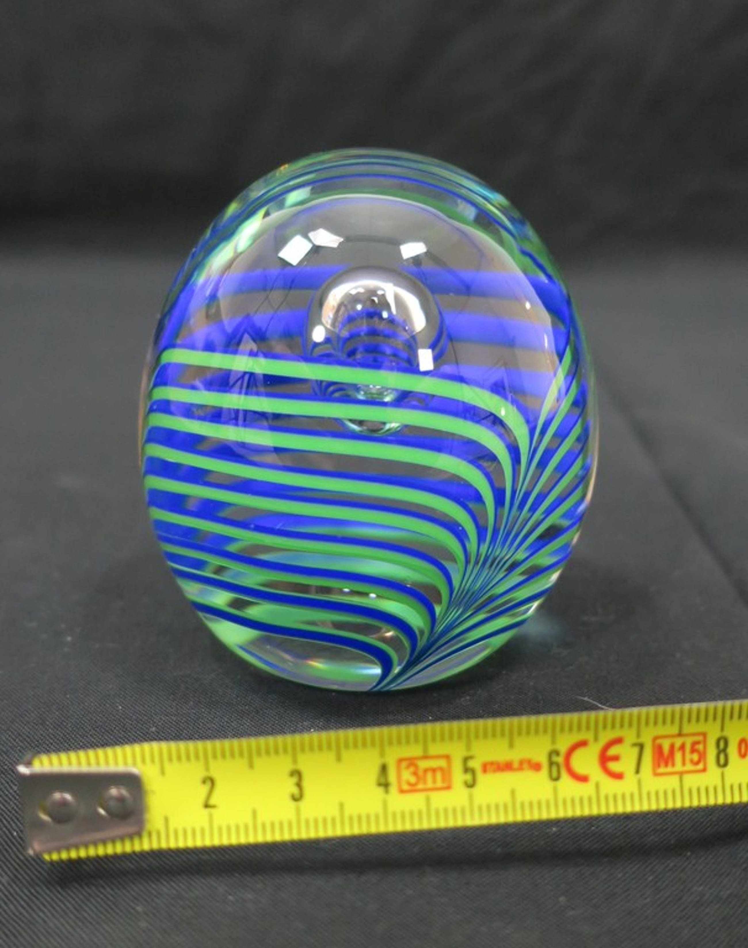 Titel: Glazen ei met groen en blauw patroon van Studio Glashyttan Sweden