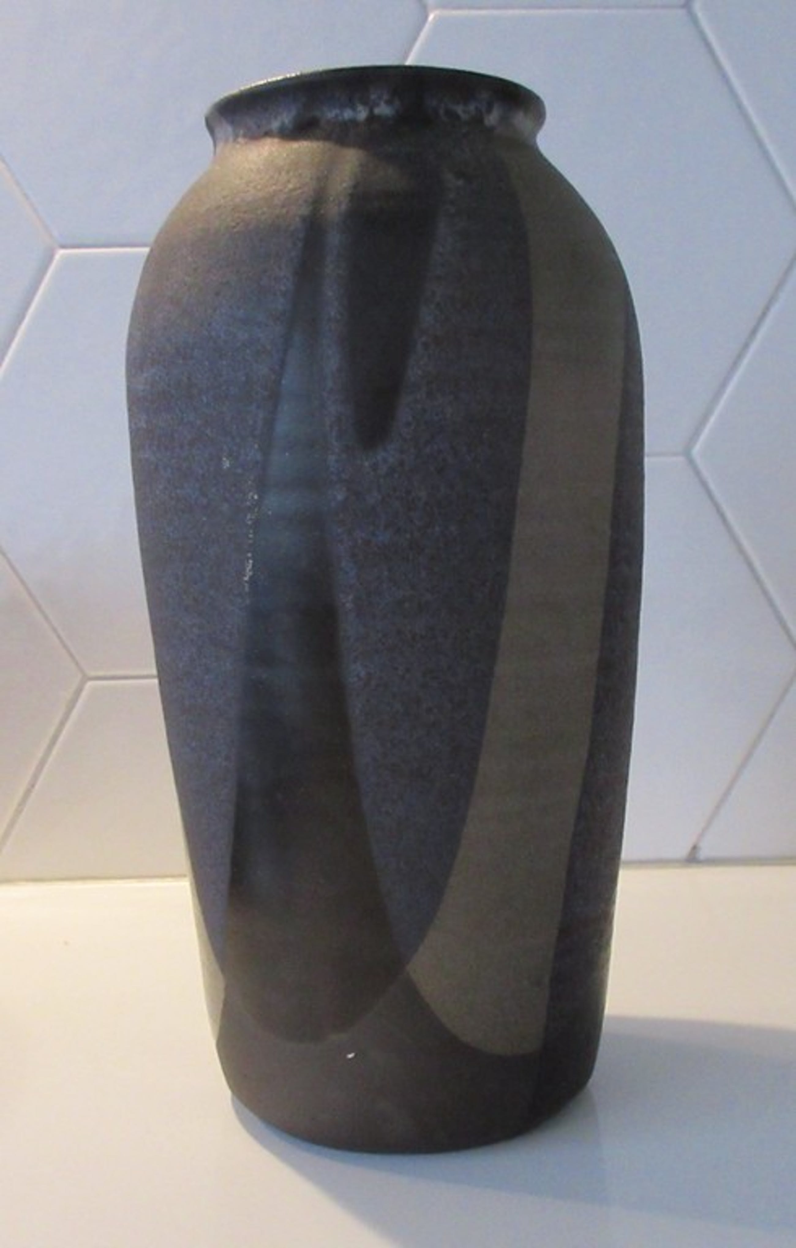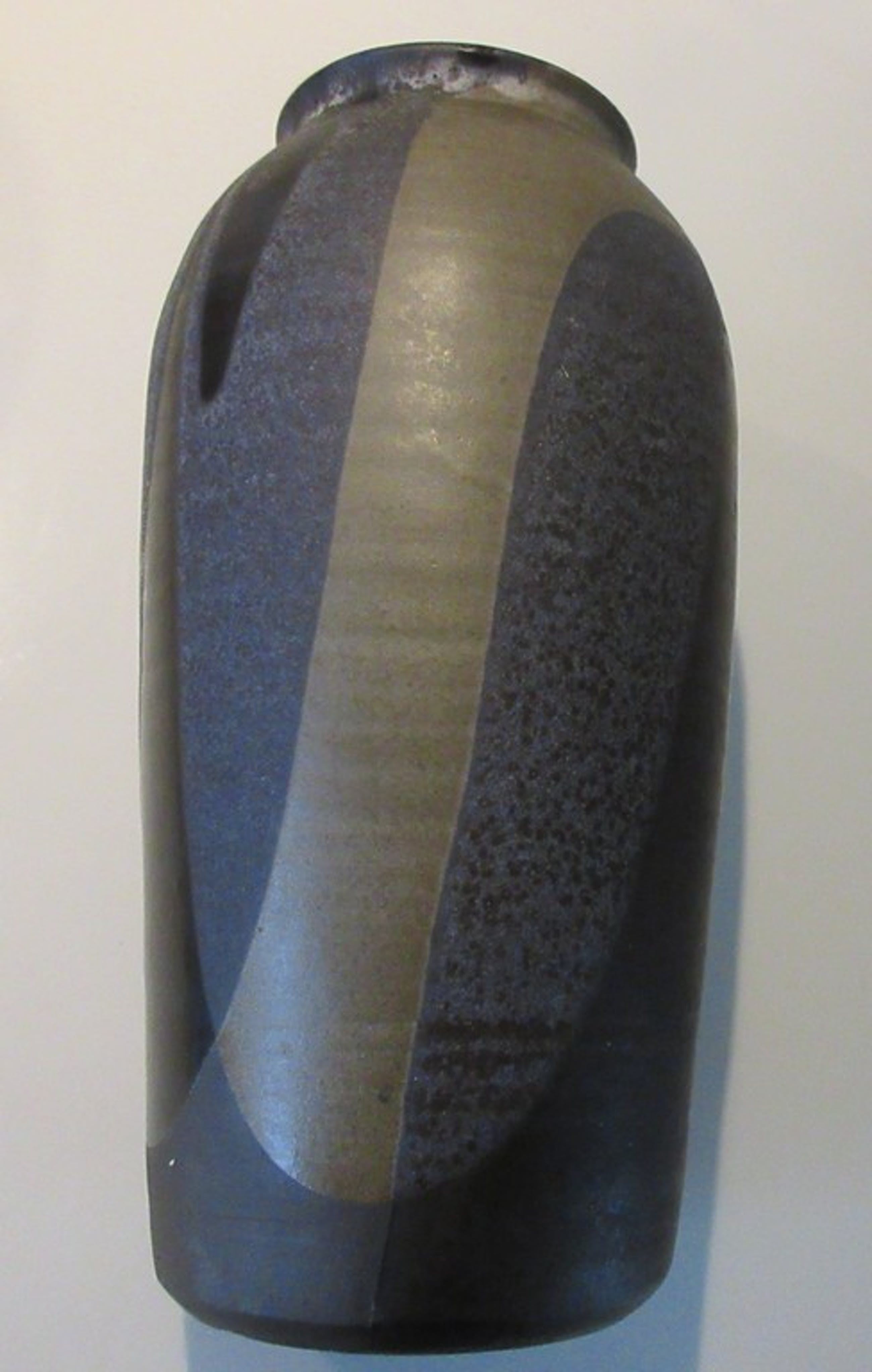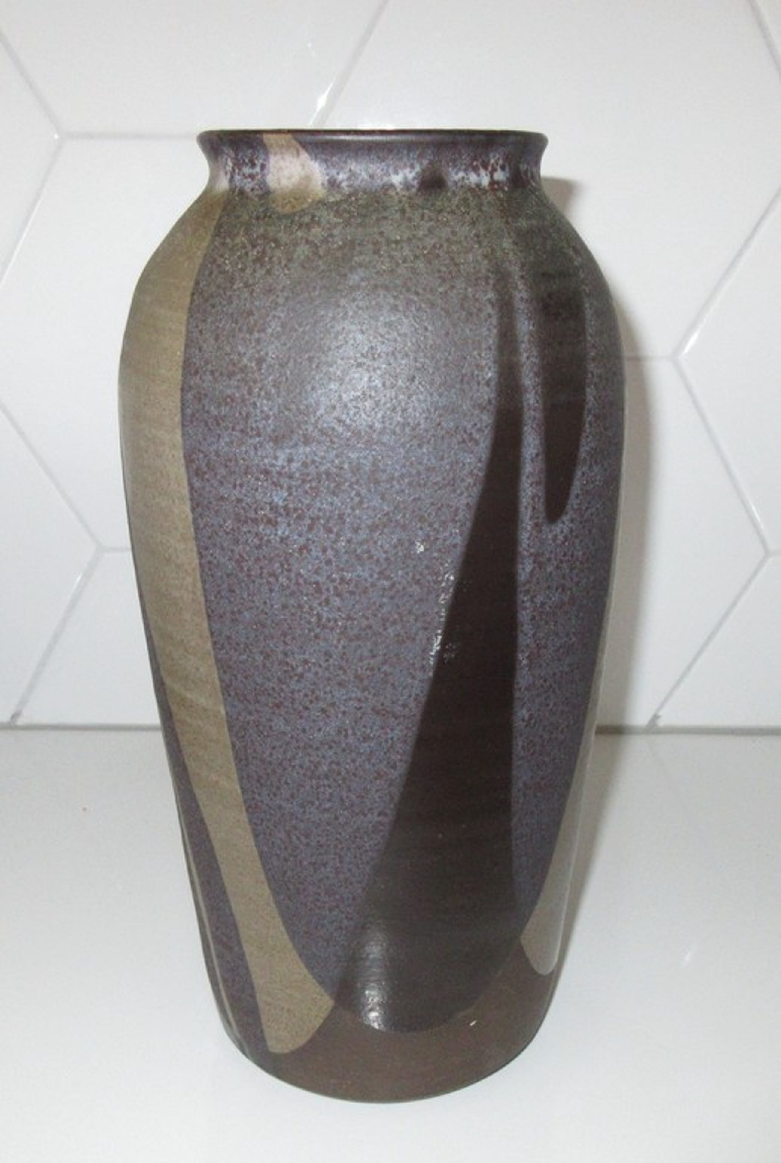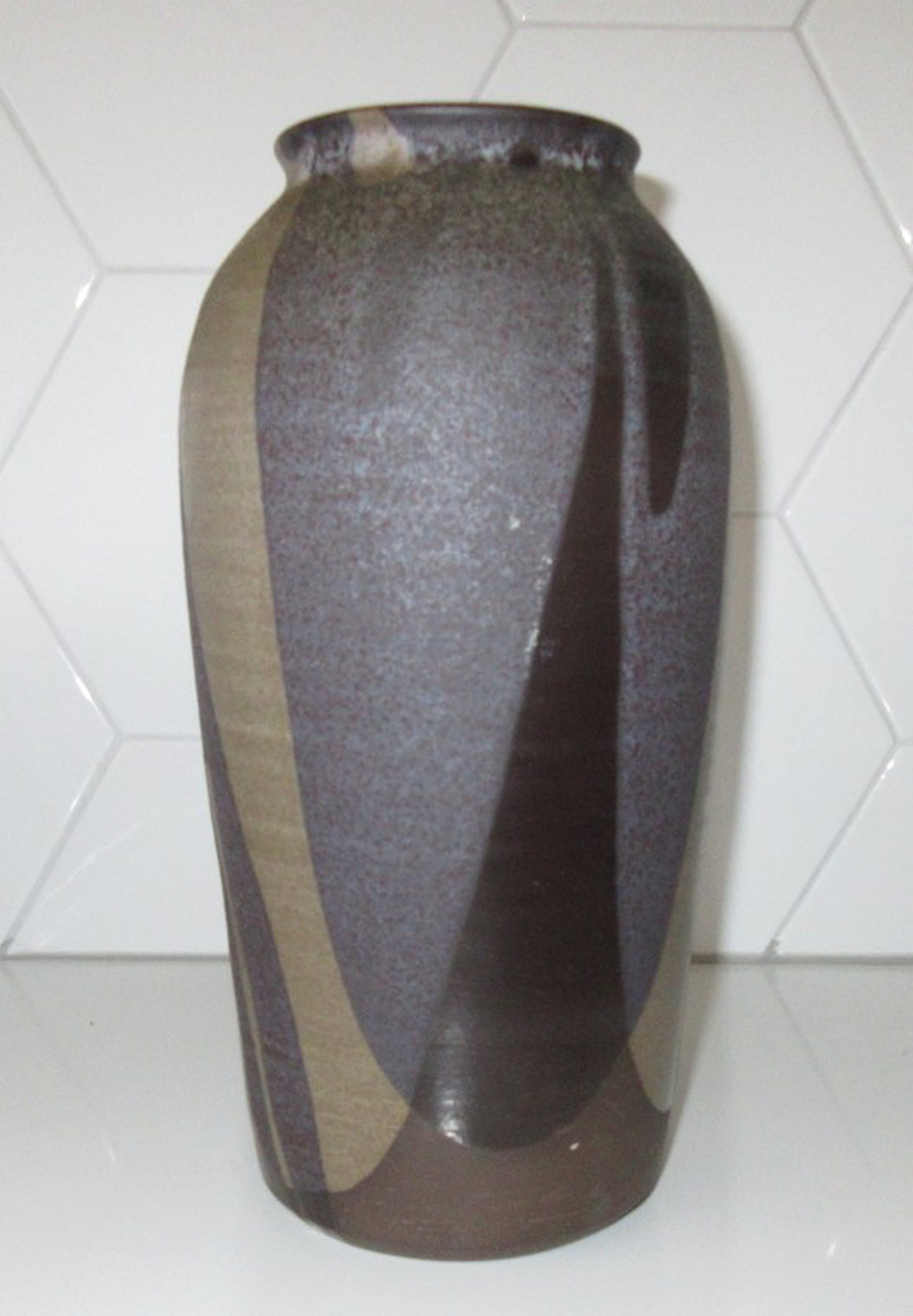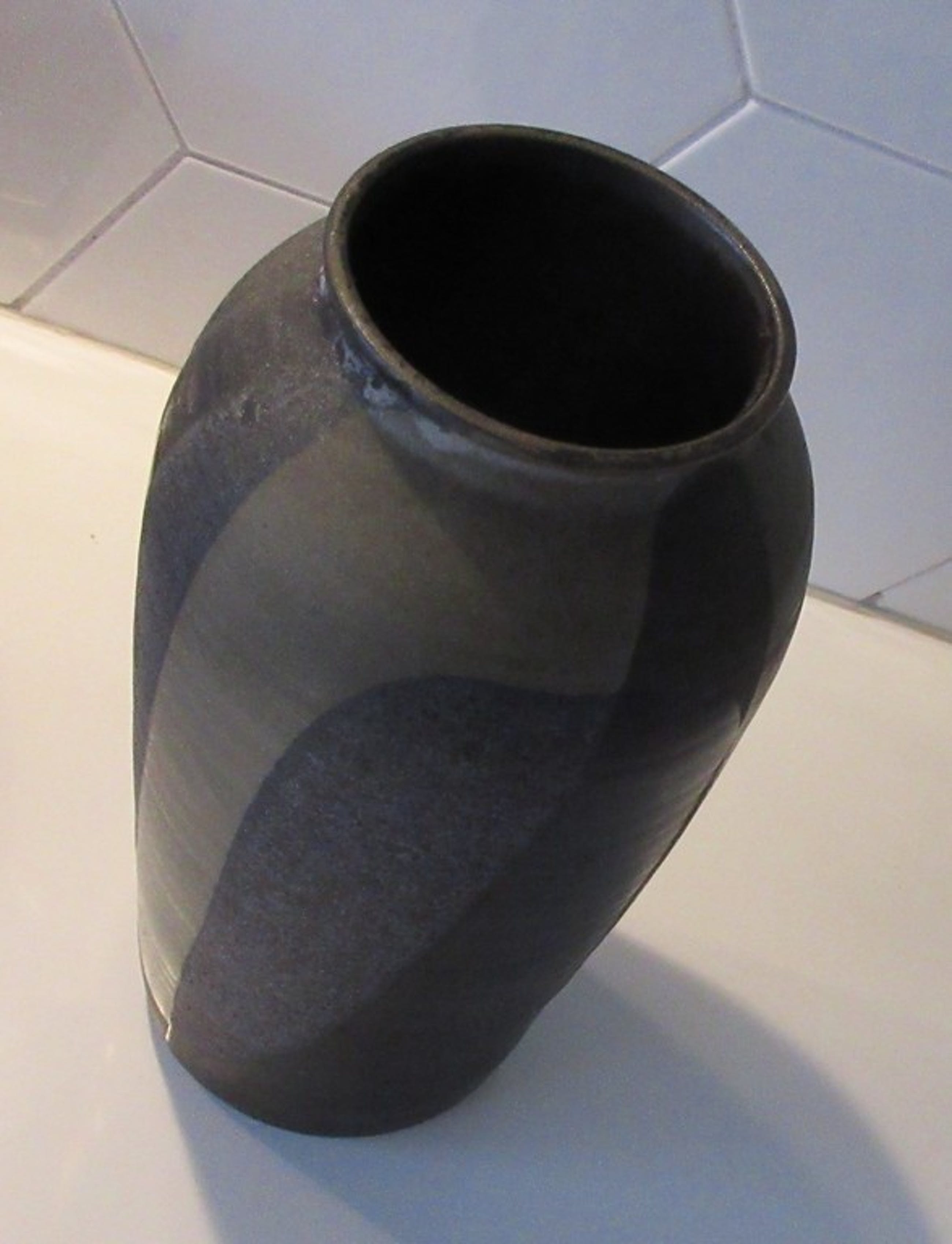 Erg mooie Studio Keramische vaas van bruin steengoed, in verschillende banen voorzien van drie kleuren en soorten glazuur; zwart, lichtbruin en blauwgrijs. Voorzien van signatuur CX. Helaas is de keramist onbekend.
