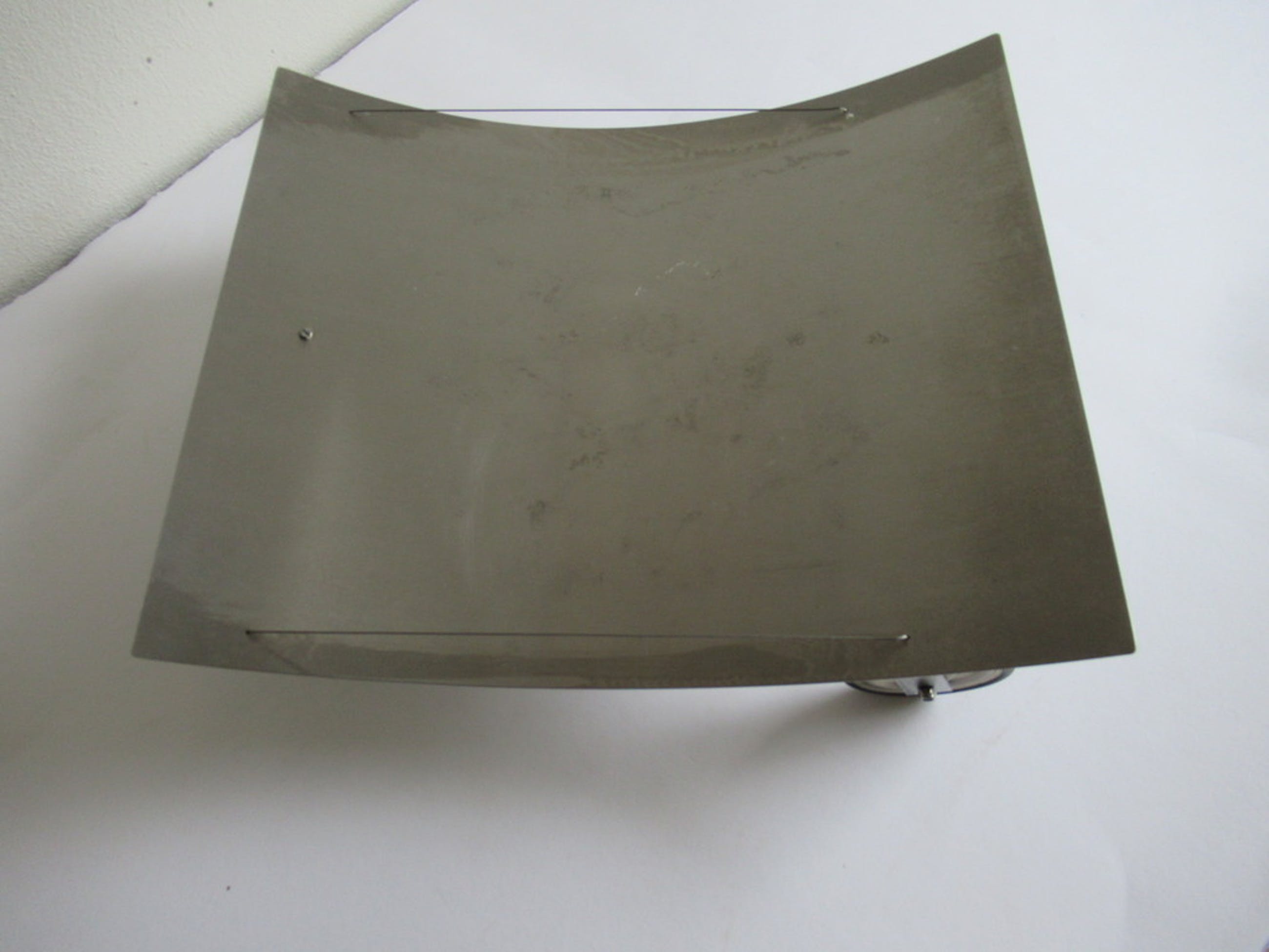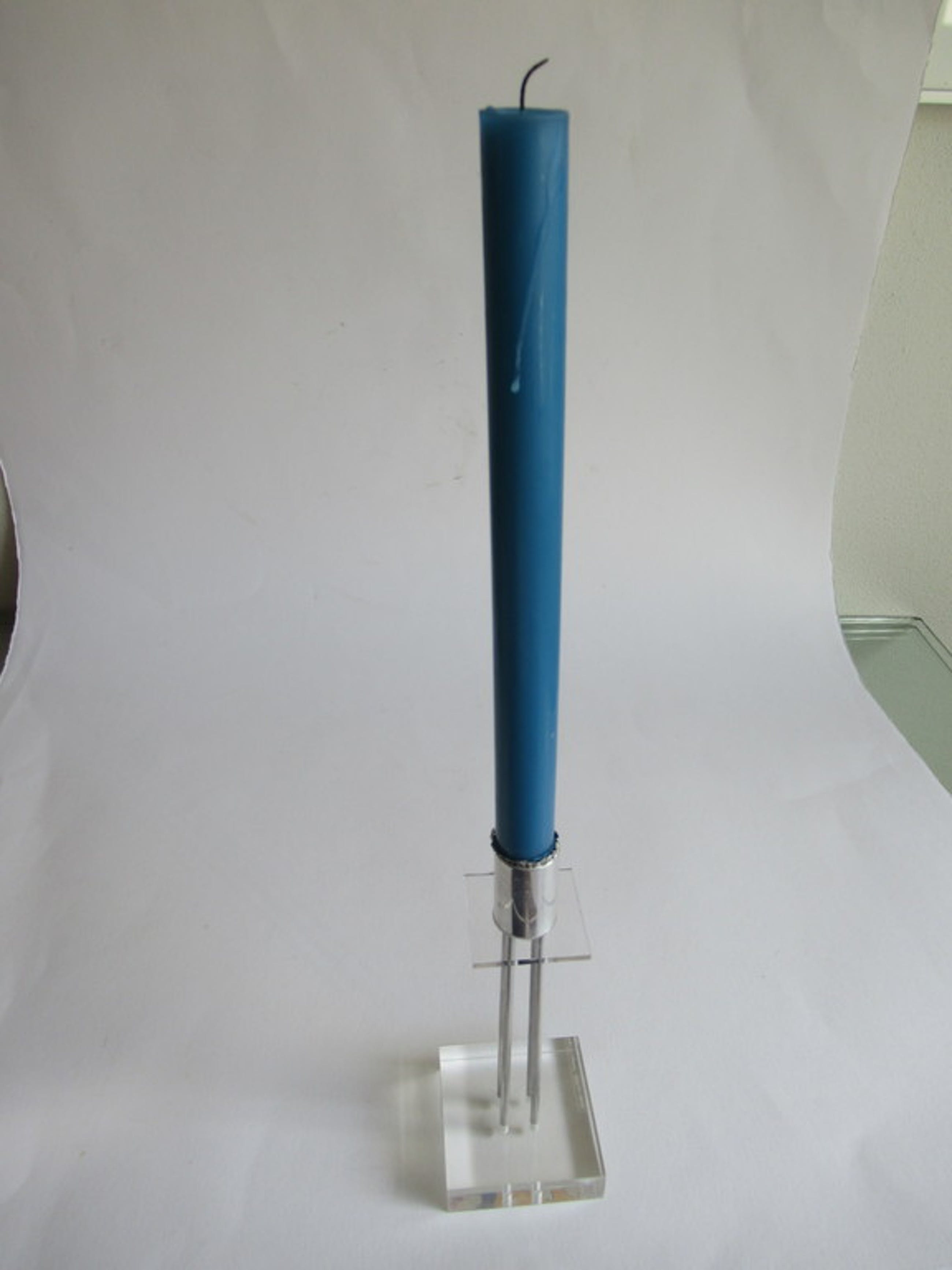 De kaarsenstandaard is in een goede staat. Hij is gemaakt van plexiglas en RVS. Hij is 19,5 cm hoog en heeft een voet van 7x7cm