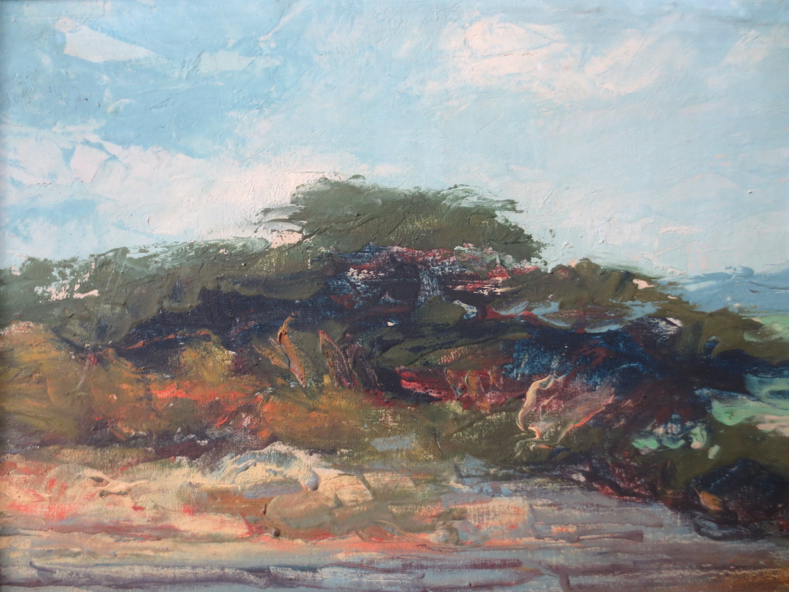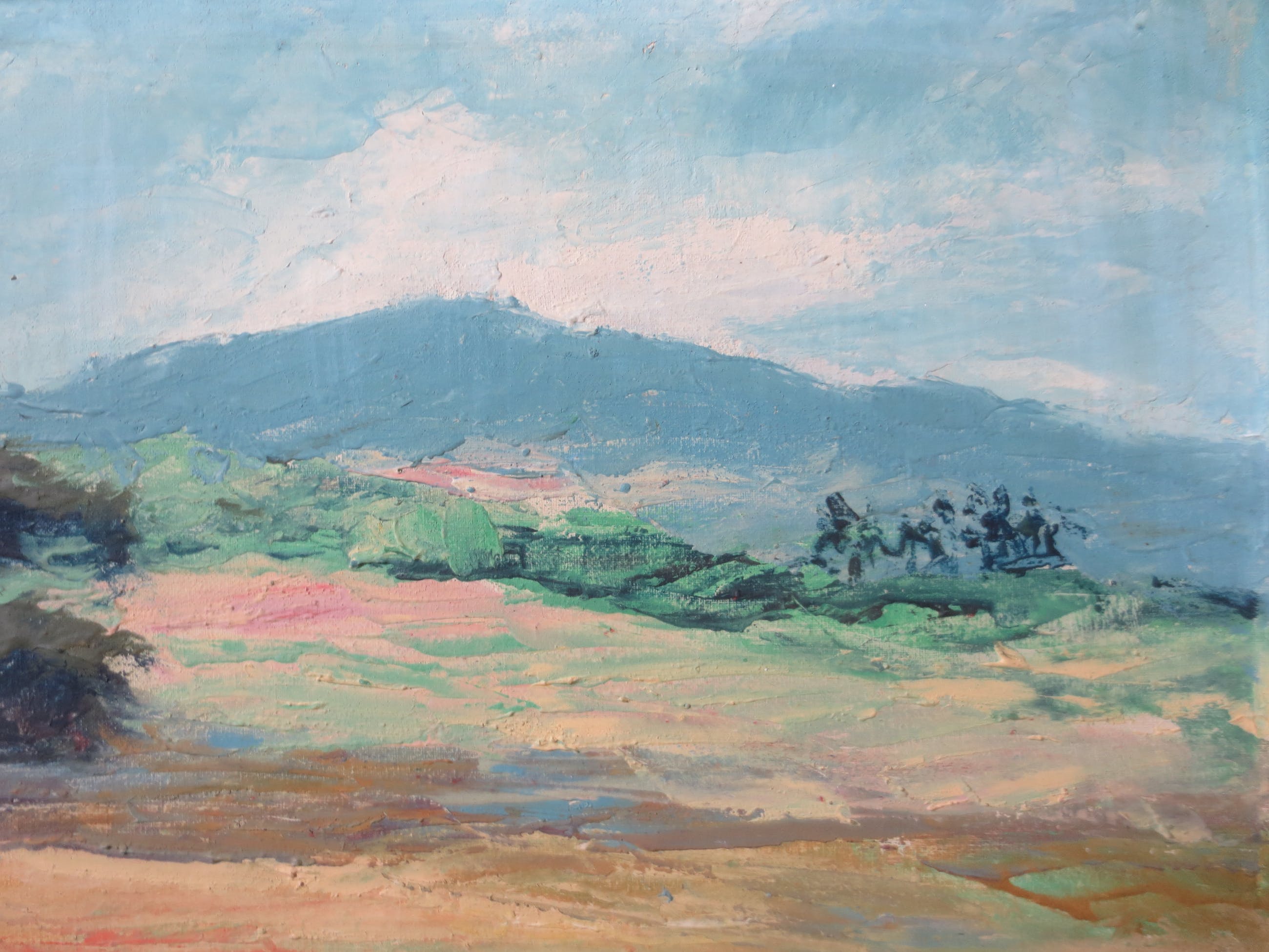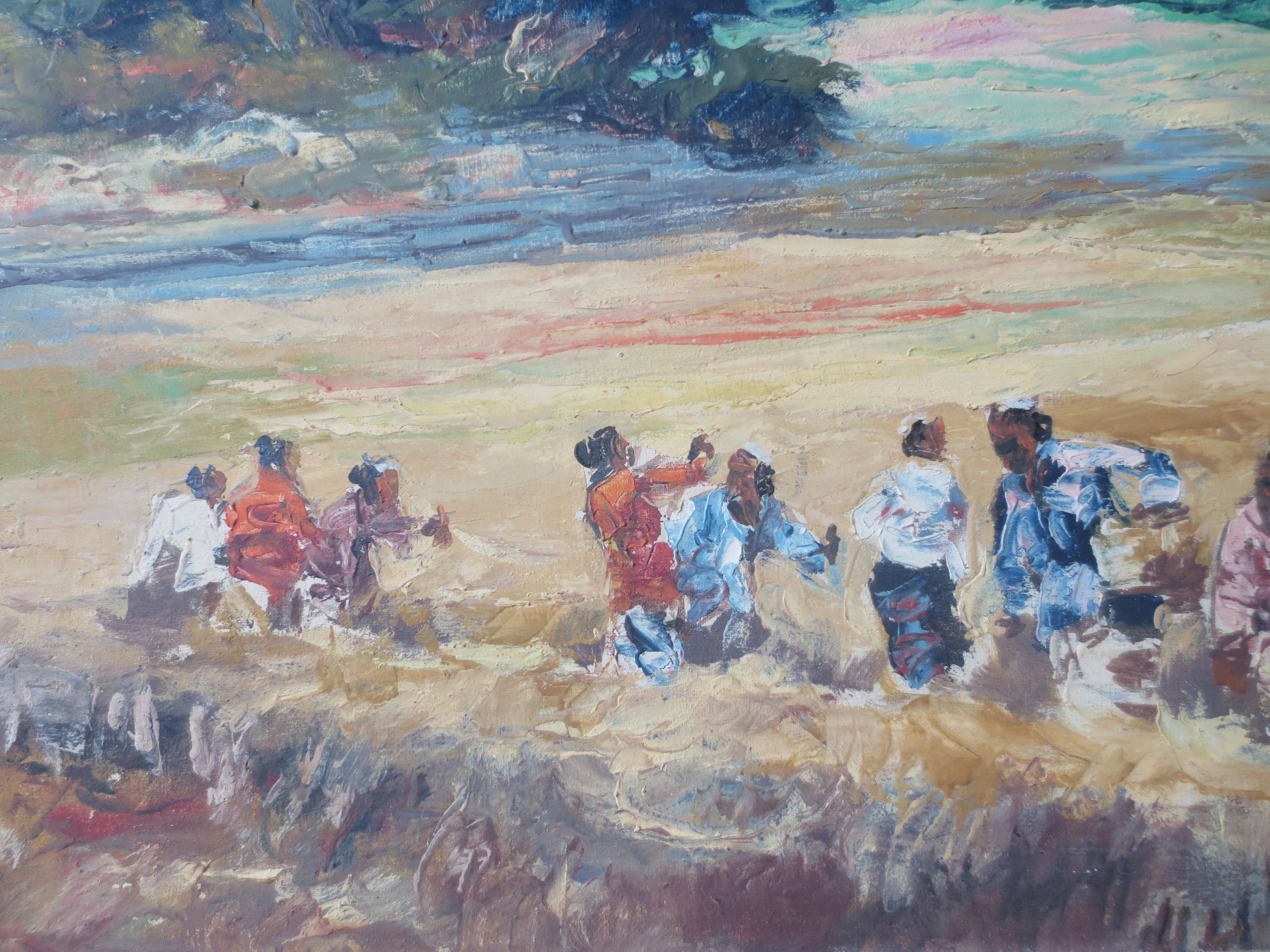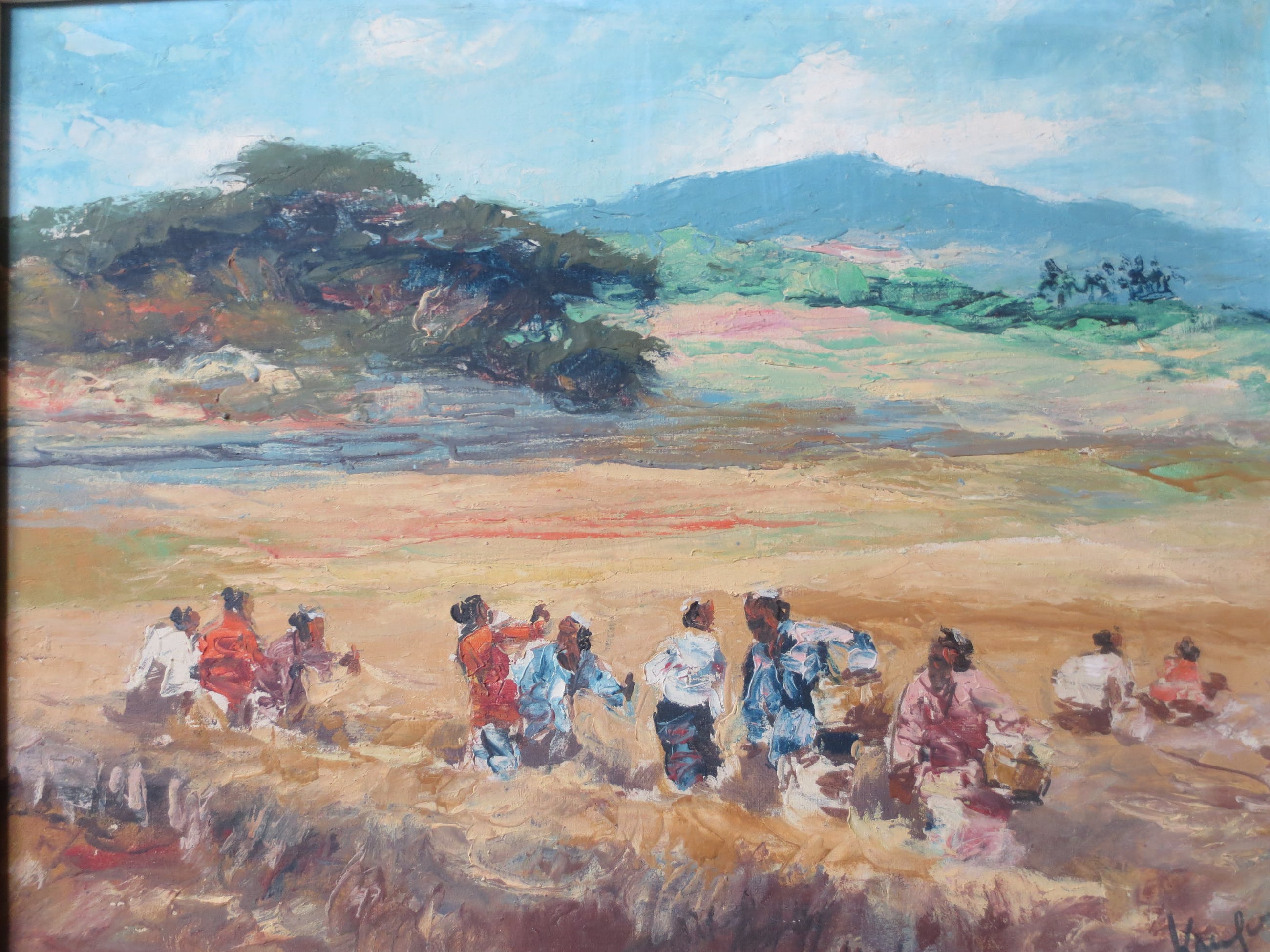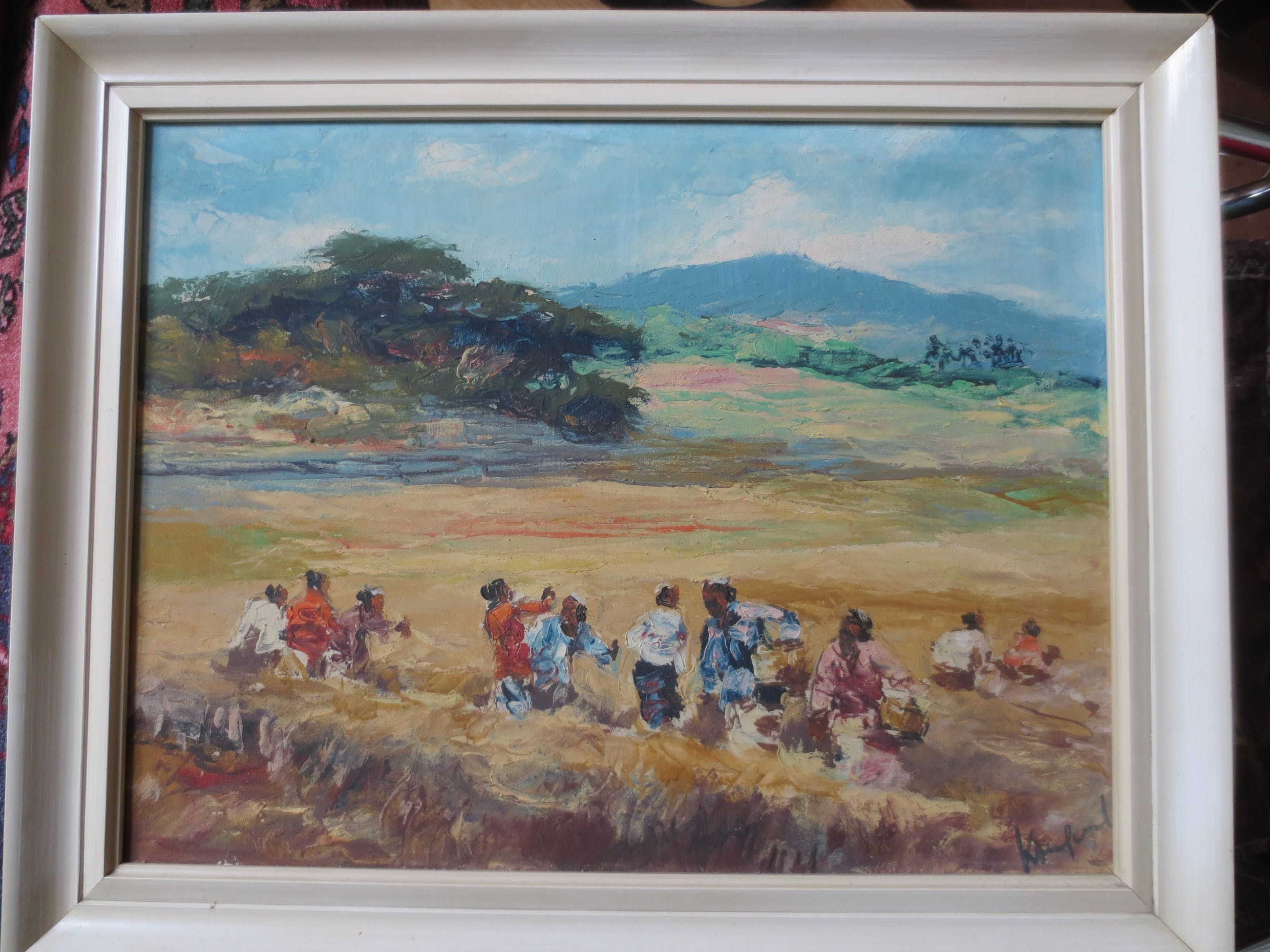 Sutjano Koempoel (1912-1987).Indonesie Landschap Arbeiders in de rijstvelden.Een van zijn beste werken.Les gehad van Gerard Pieter Adolfs en Willem van der Does.