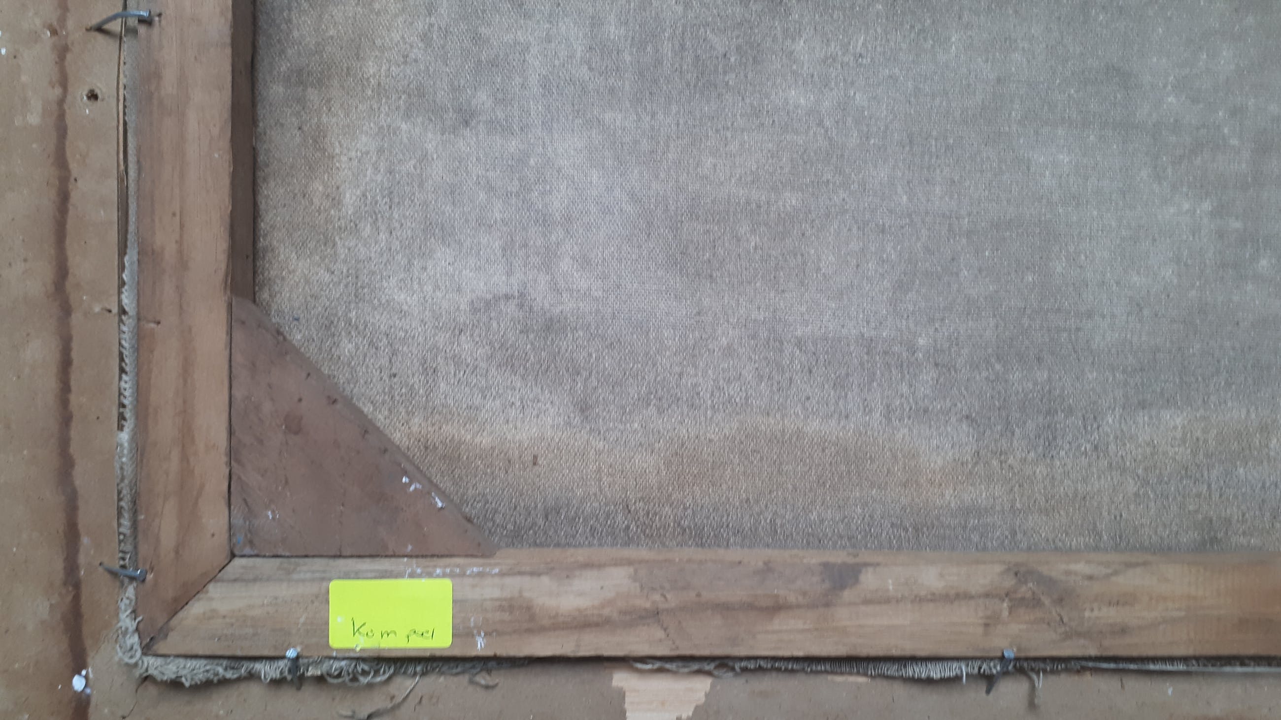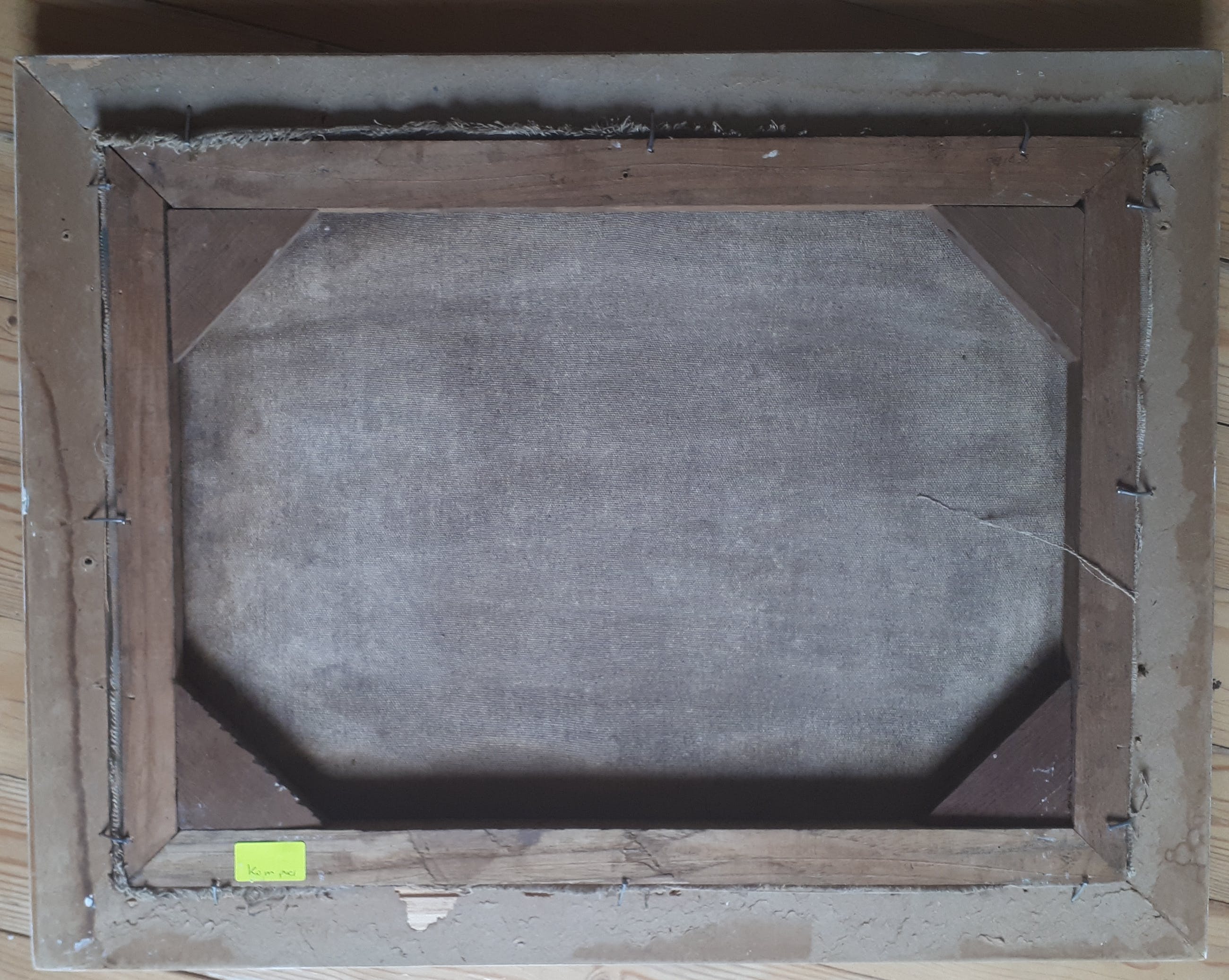 Het werk is schoongemaakt en de lijst is gerestaureerd en gelakt. Enkele lichte beschadigingen aan de rand. De lijst is origineel. Het spieraam is handgemaakt van hardhout.