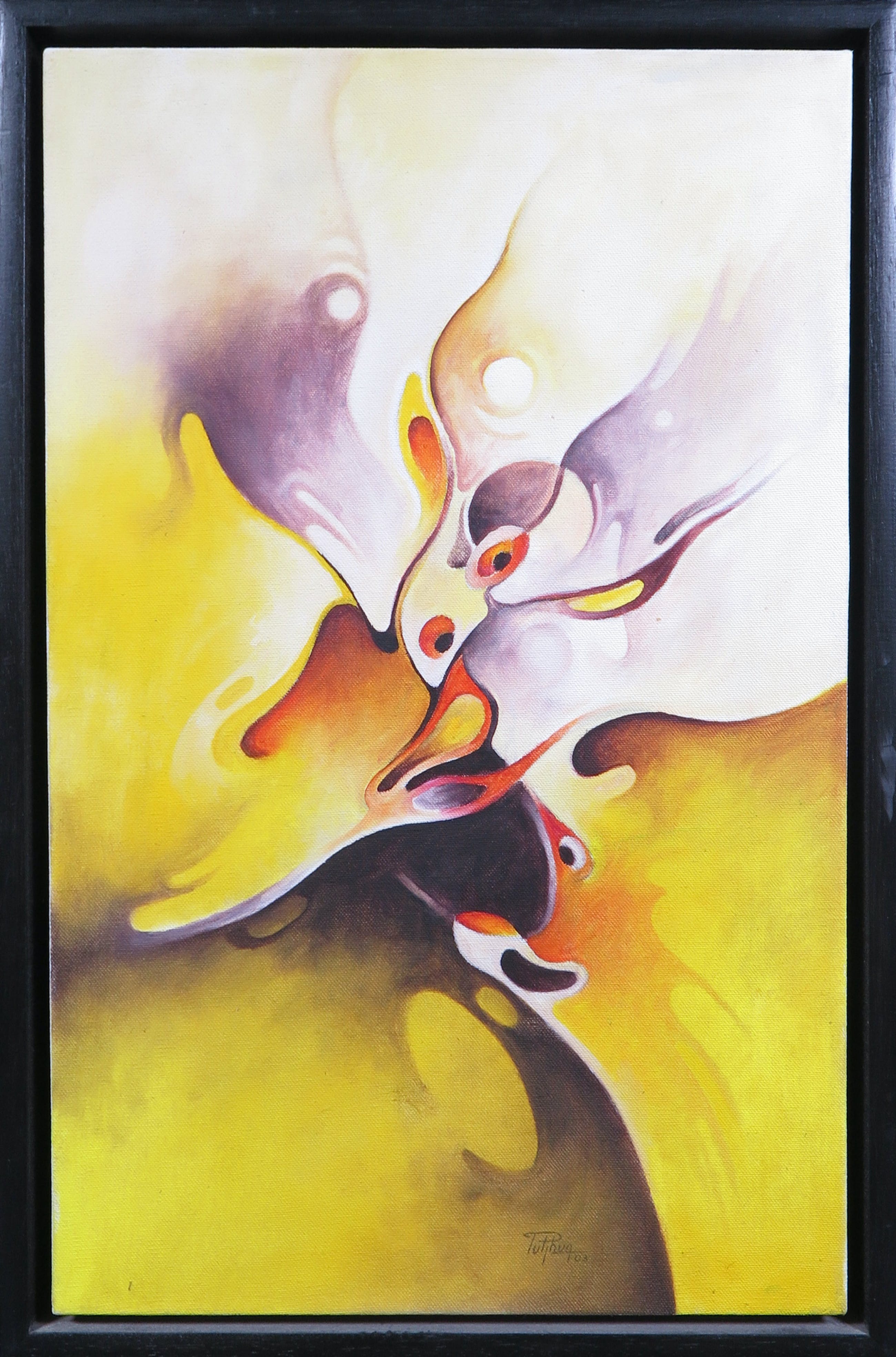Abstracte compositie met organische vormen. Opvallend complementair contrast in geel- en paarstinten.