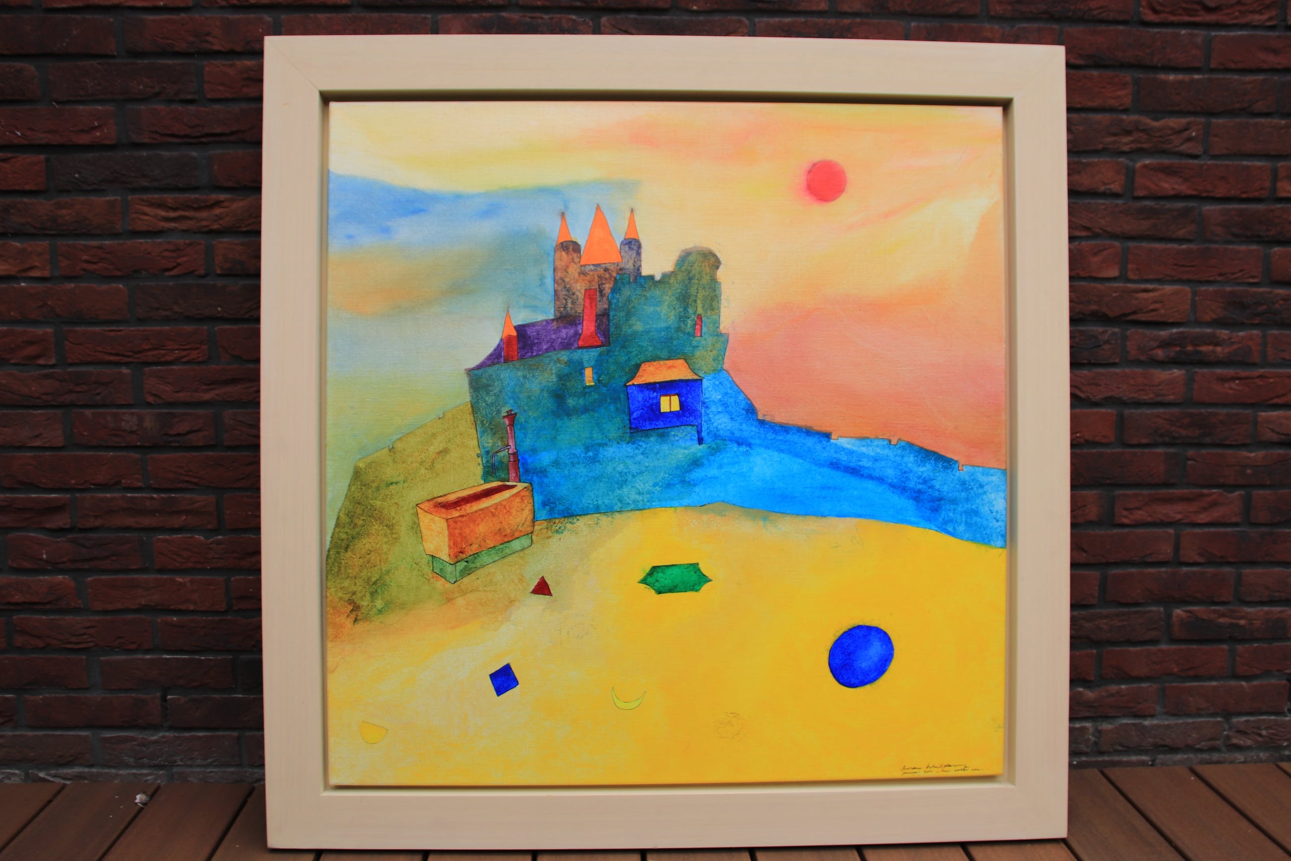 Een vrolijk en kleurrijk werk dat in elk interieur, zowel klassiek als modern, past. In houten baklijst ingelijst.
