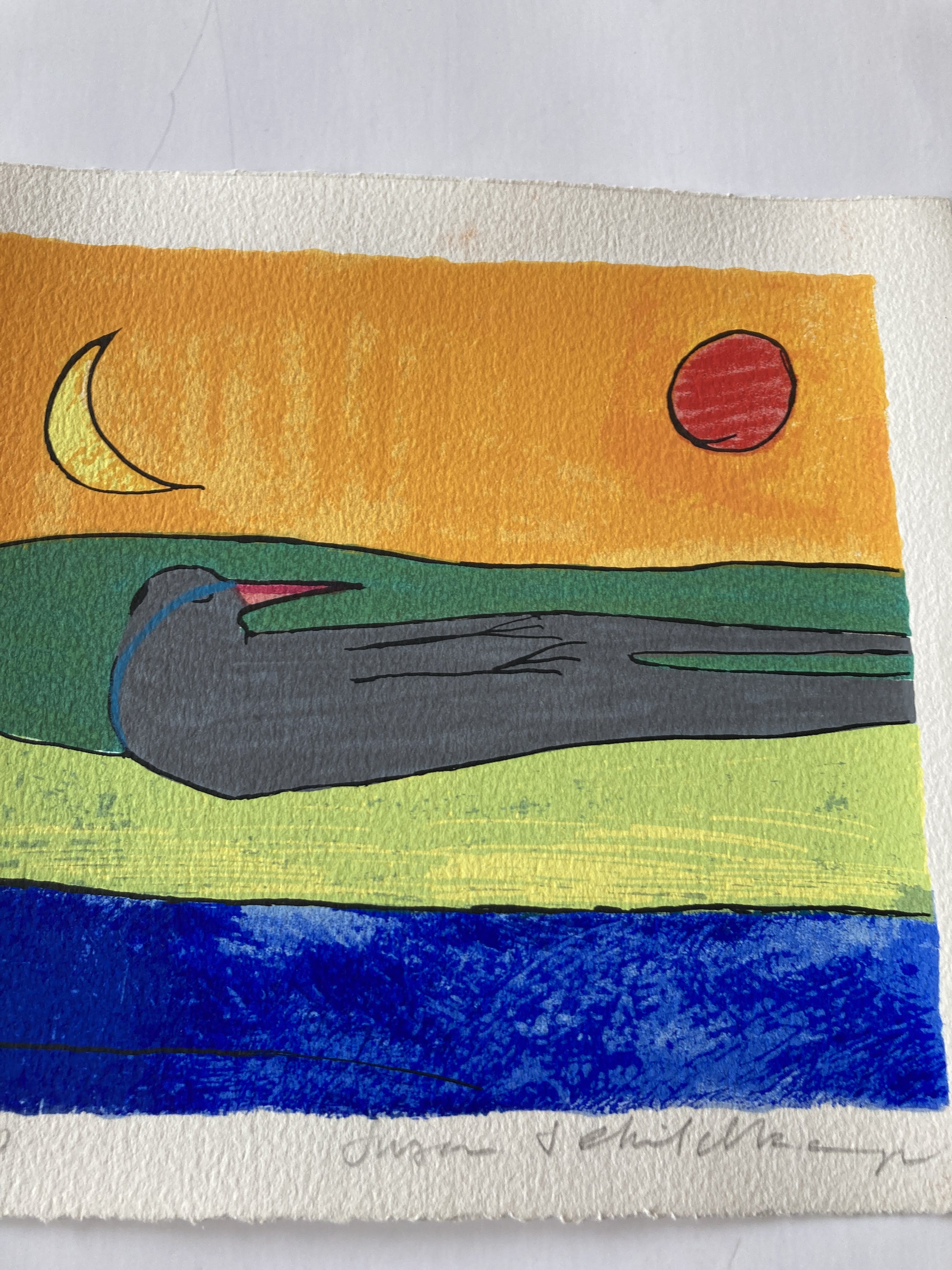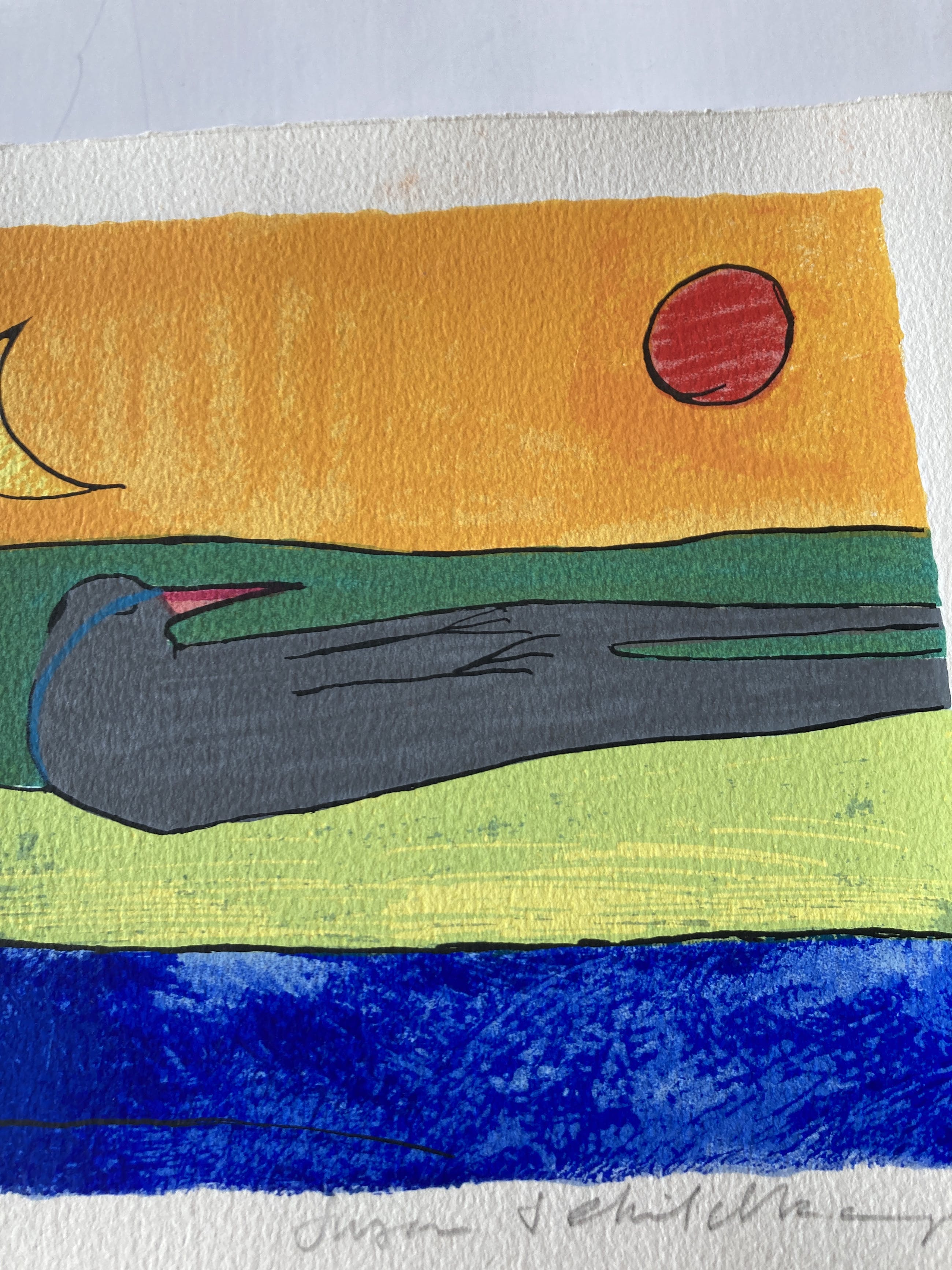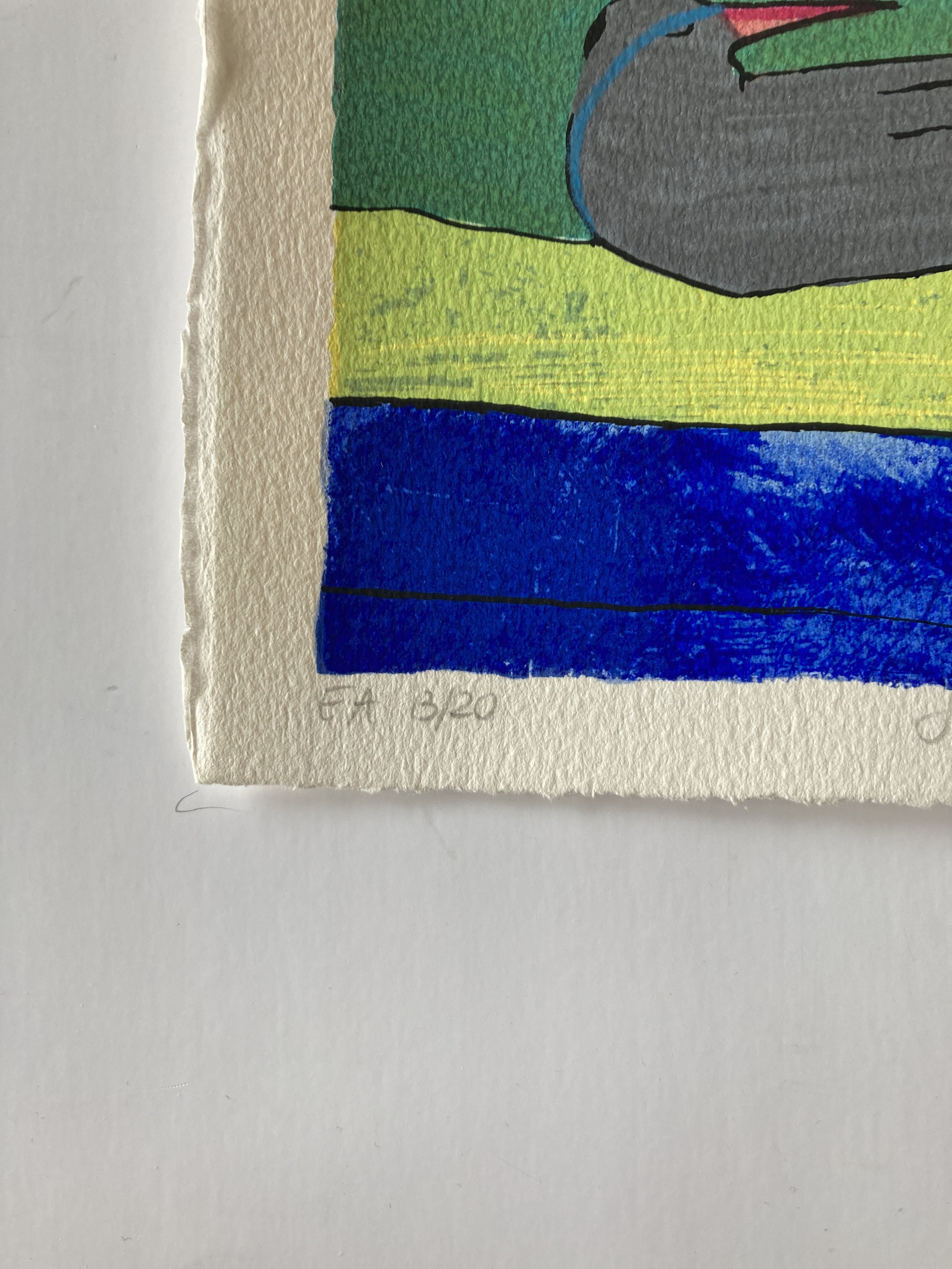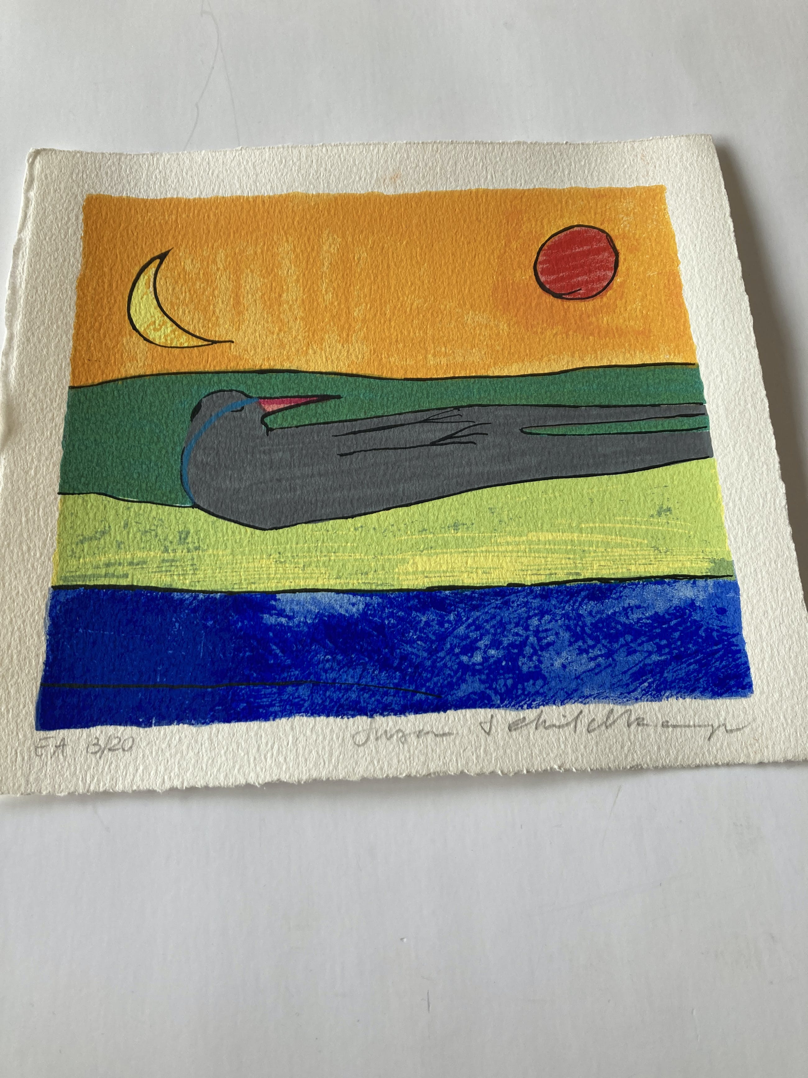 Ter ere van het 25 jarig bestaan van de Nederlandse Brandstichting in 1996 hebben 25 Nederlandse kunstenaars hun interpretatie van een vogel vereeuwigd in een zeefdruk. Susan Schildkamp was één van deze kunstenaars met deze zeefdruk. Met l.o. EA 13/20 met potlood en r.o. Susan Schildkamp met potlood.