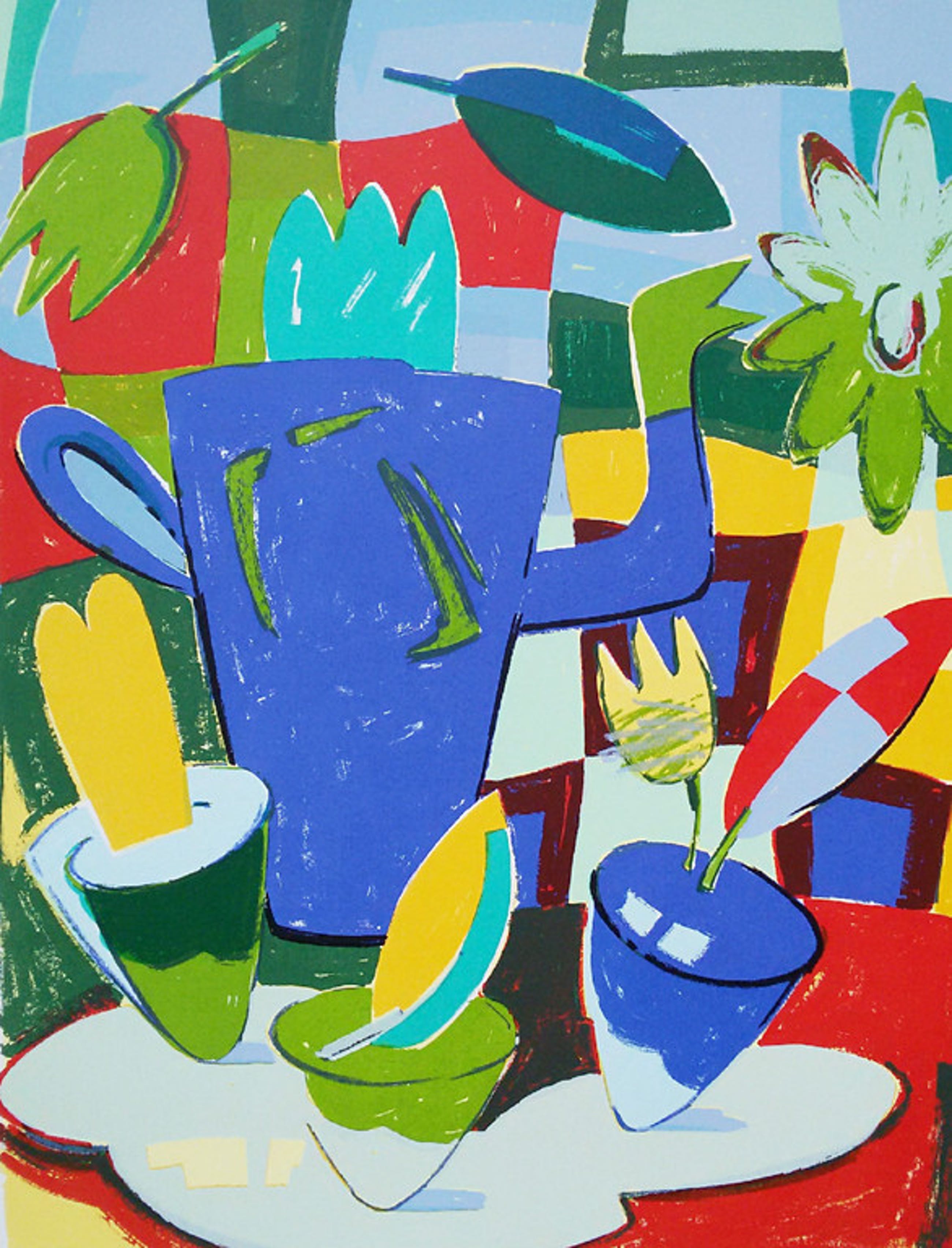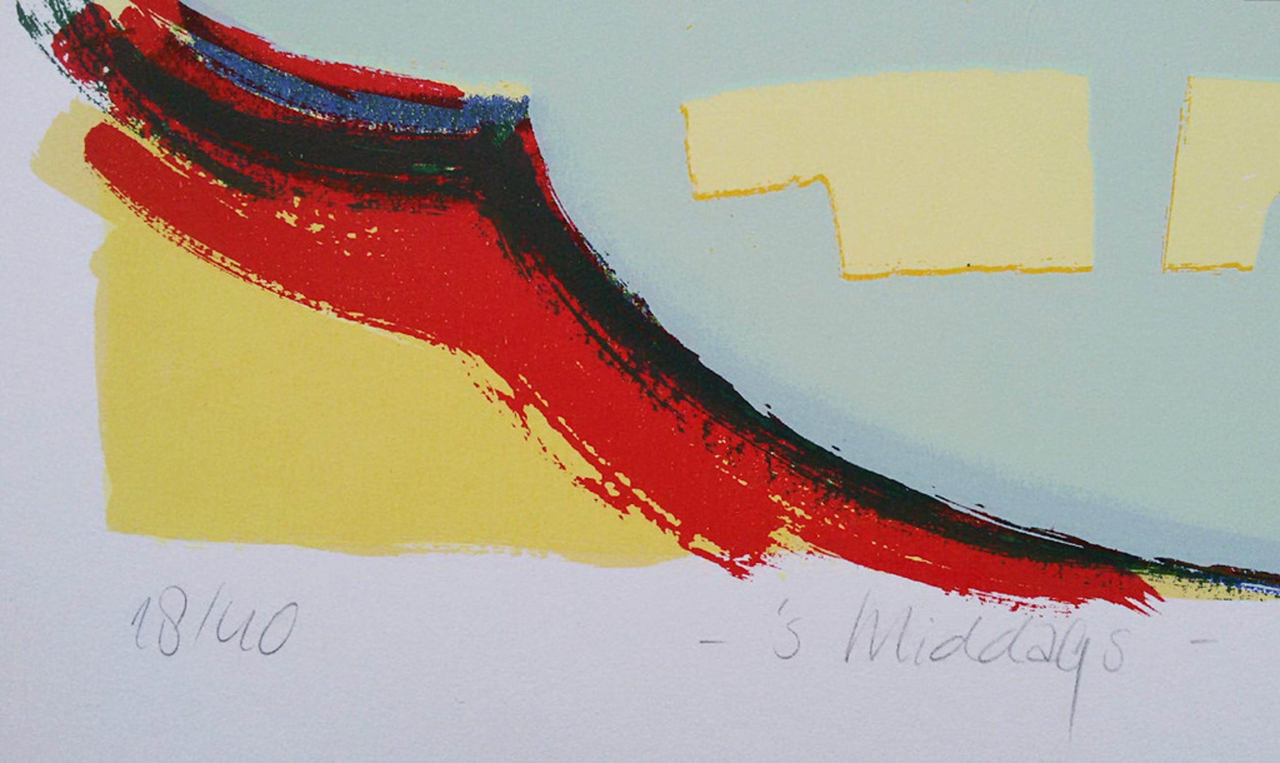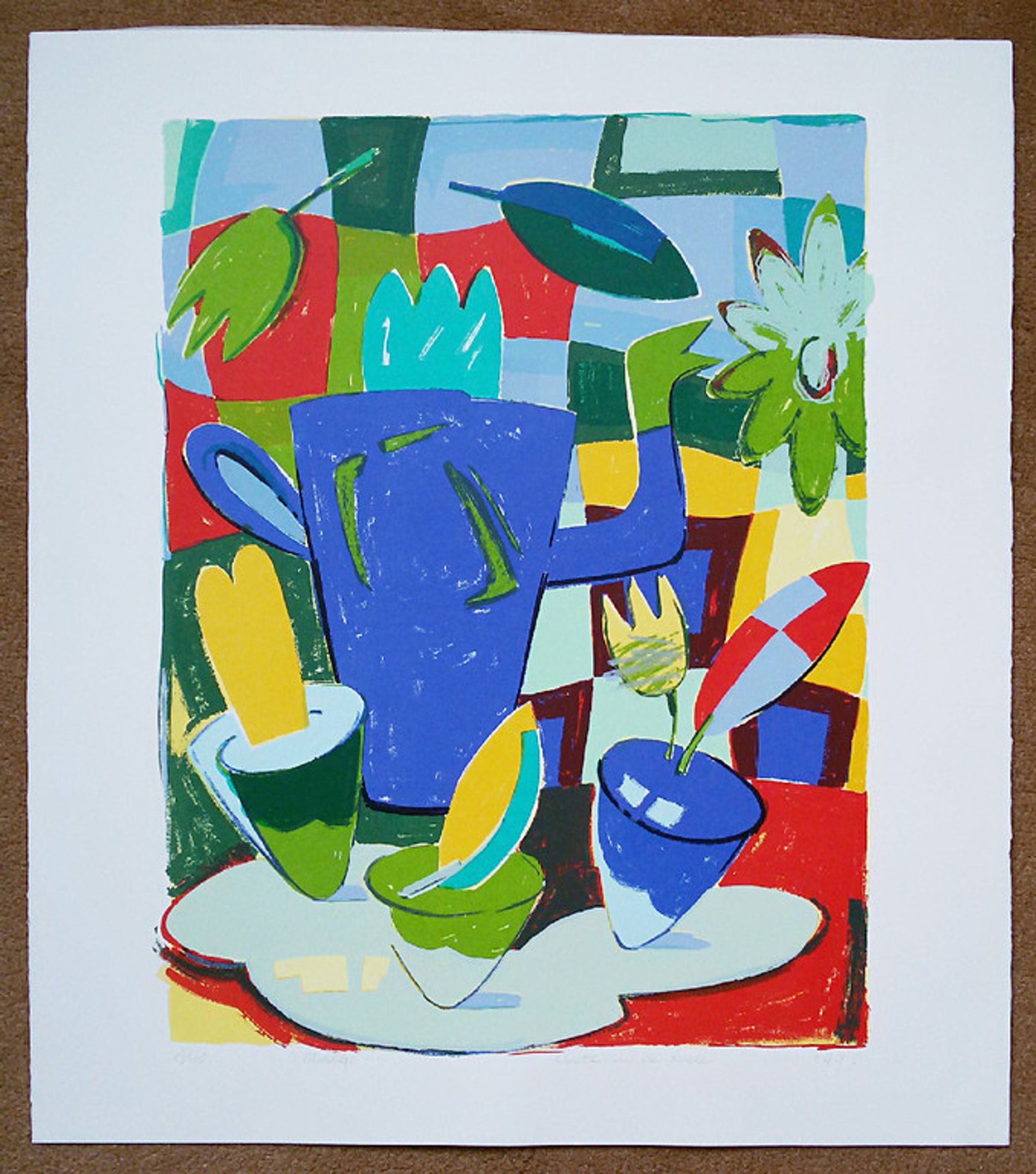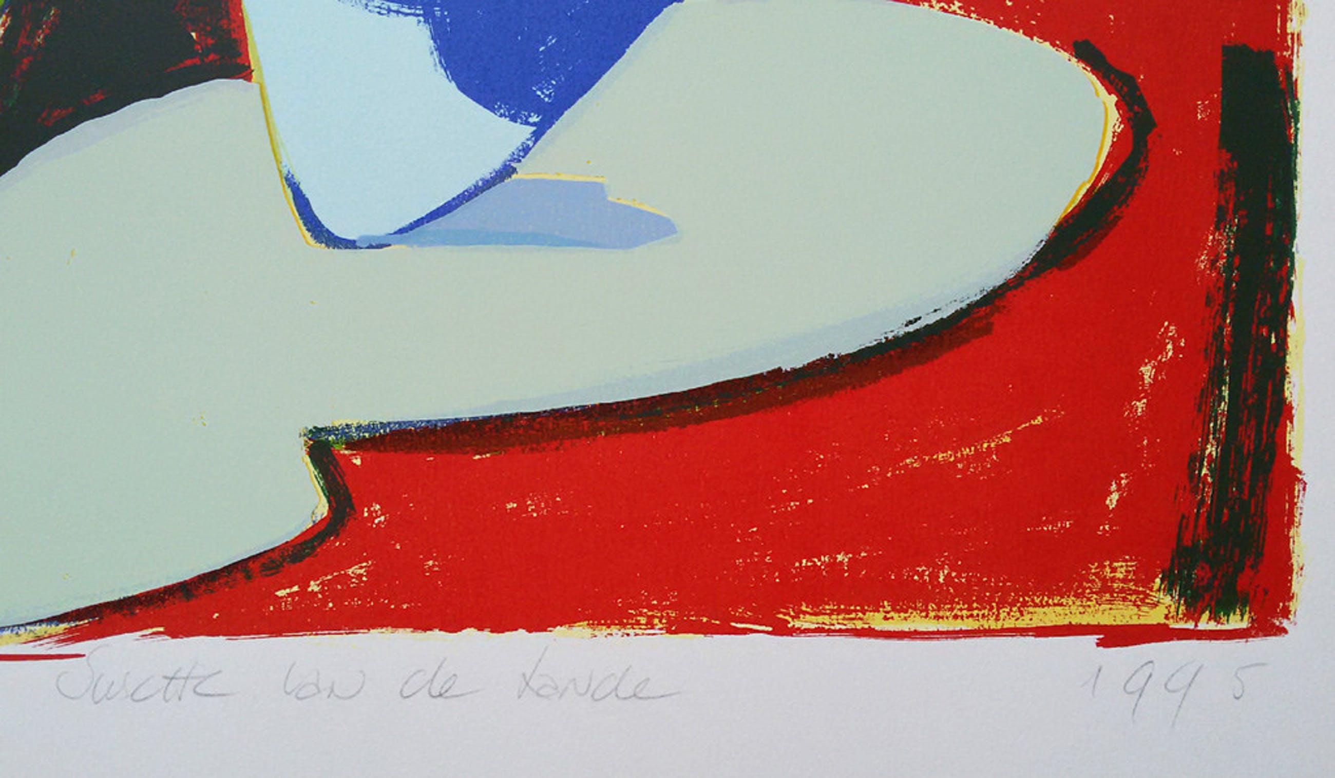Herkenbaar werk van Susette van de Lande. Zeefdruk op papier, met potlood gesigneerd, gedateerd (1995) en genummerd (18/40). Afkomstig uit de kunstcollectie van ABNAMRO, in zeer goede conditie. Blad heeft ingelijst gezeten want het blad is aan de achterkant licht beschadigd en er zitten ook taperesten bovenaan de achterkant. Aan de voorzijde is hiervan niks te zien; ingelijst met nieuw passe-partout is het werk uitstekend. Galerieprijs: 649,- euro, haha… echt waar, het is te hopen dat je er voor die prijs een lijst bij krijgt ;-)