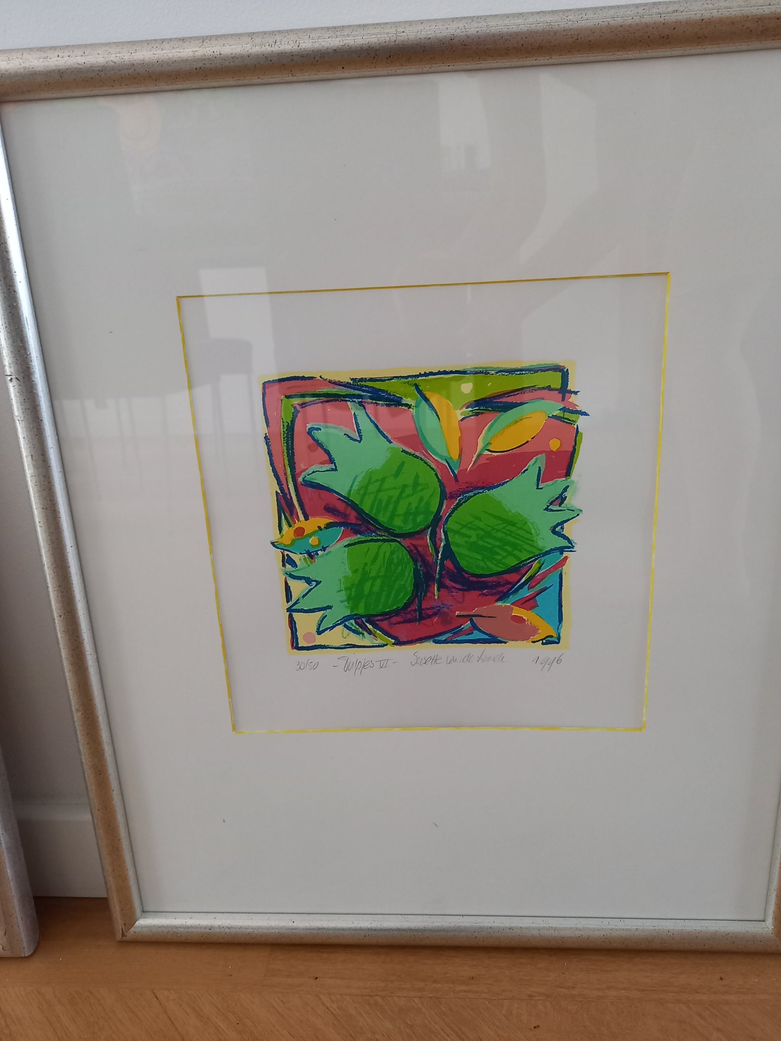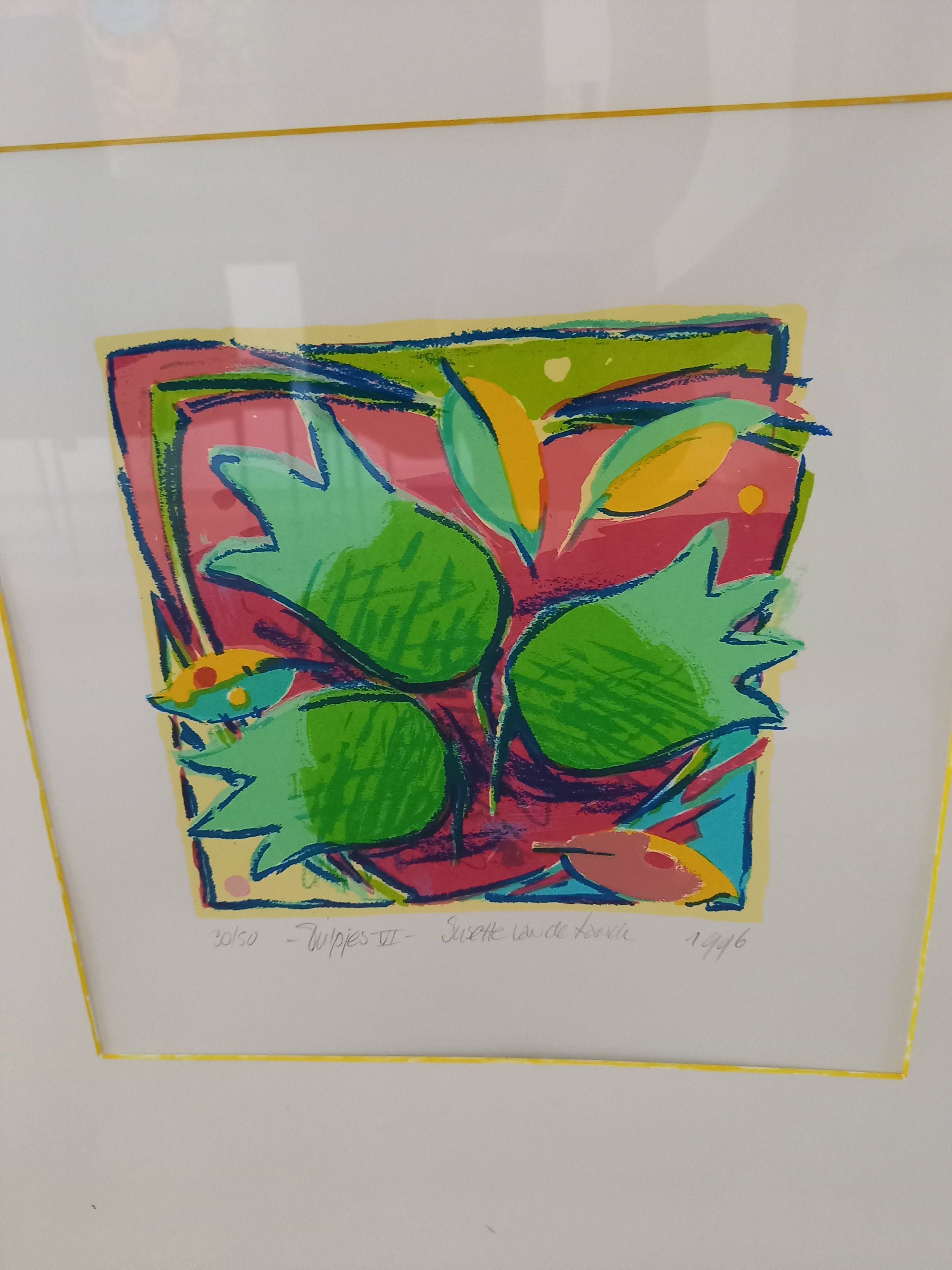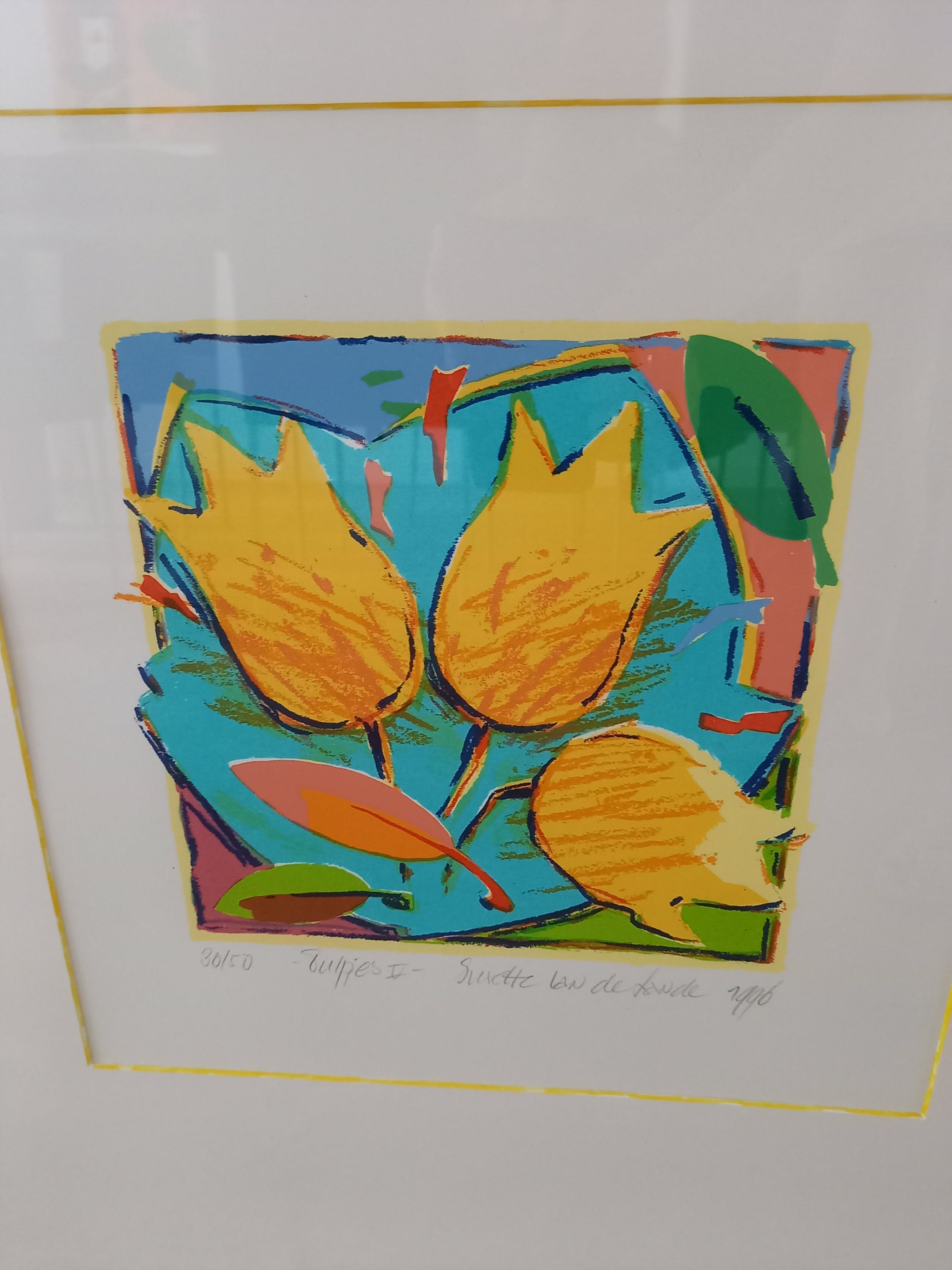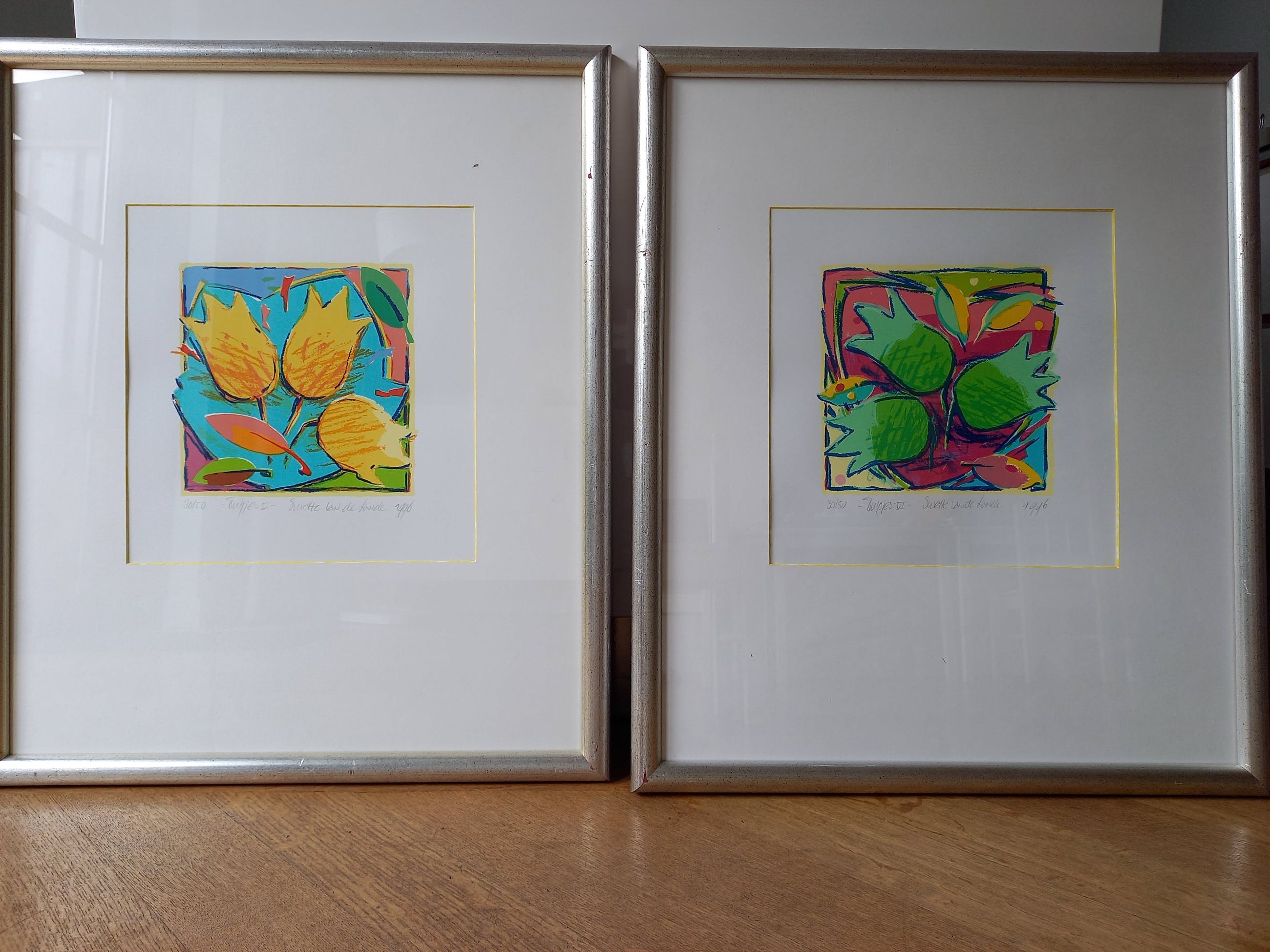 Zeefdruk Susette van de Lande uit 1996. Gele en groen tulpen als set gekocht en graag ook als set nu verkopen.
