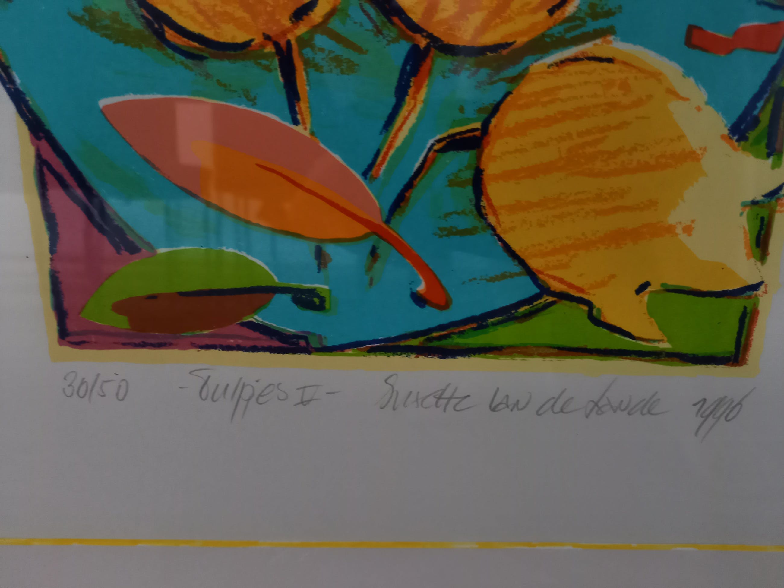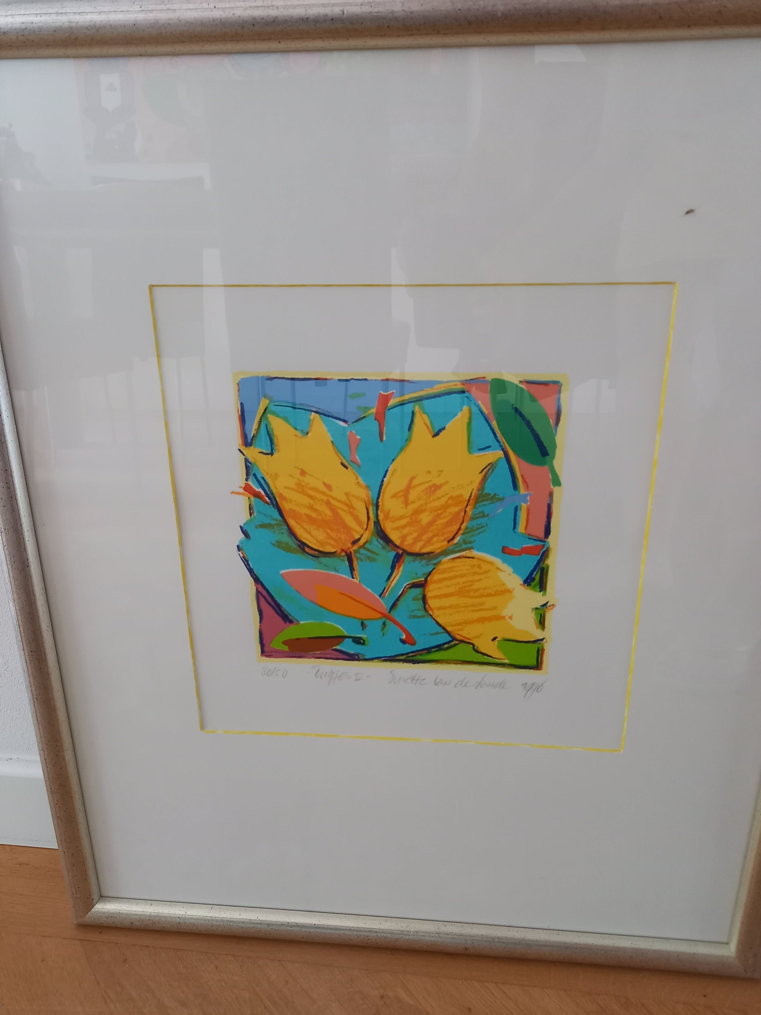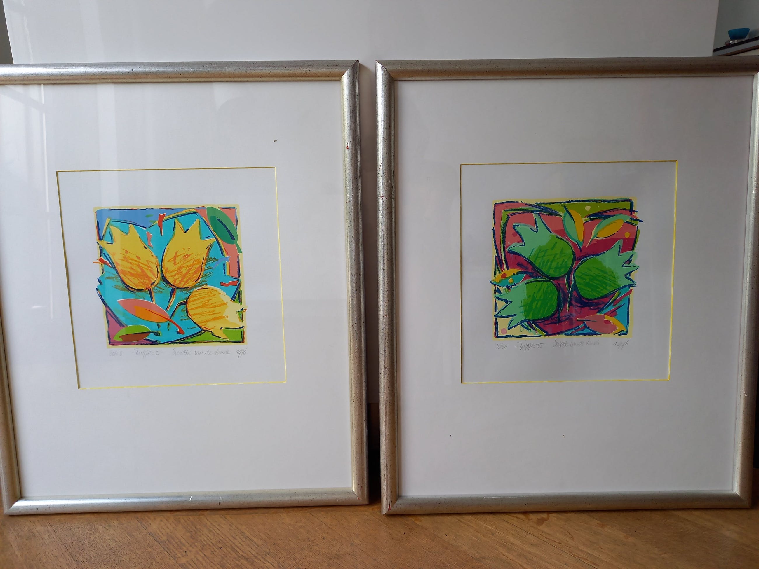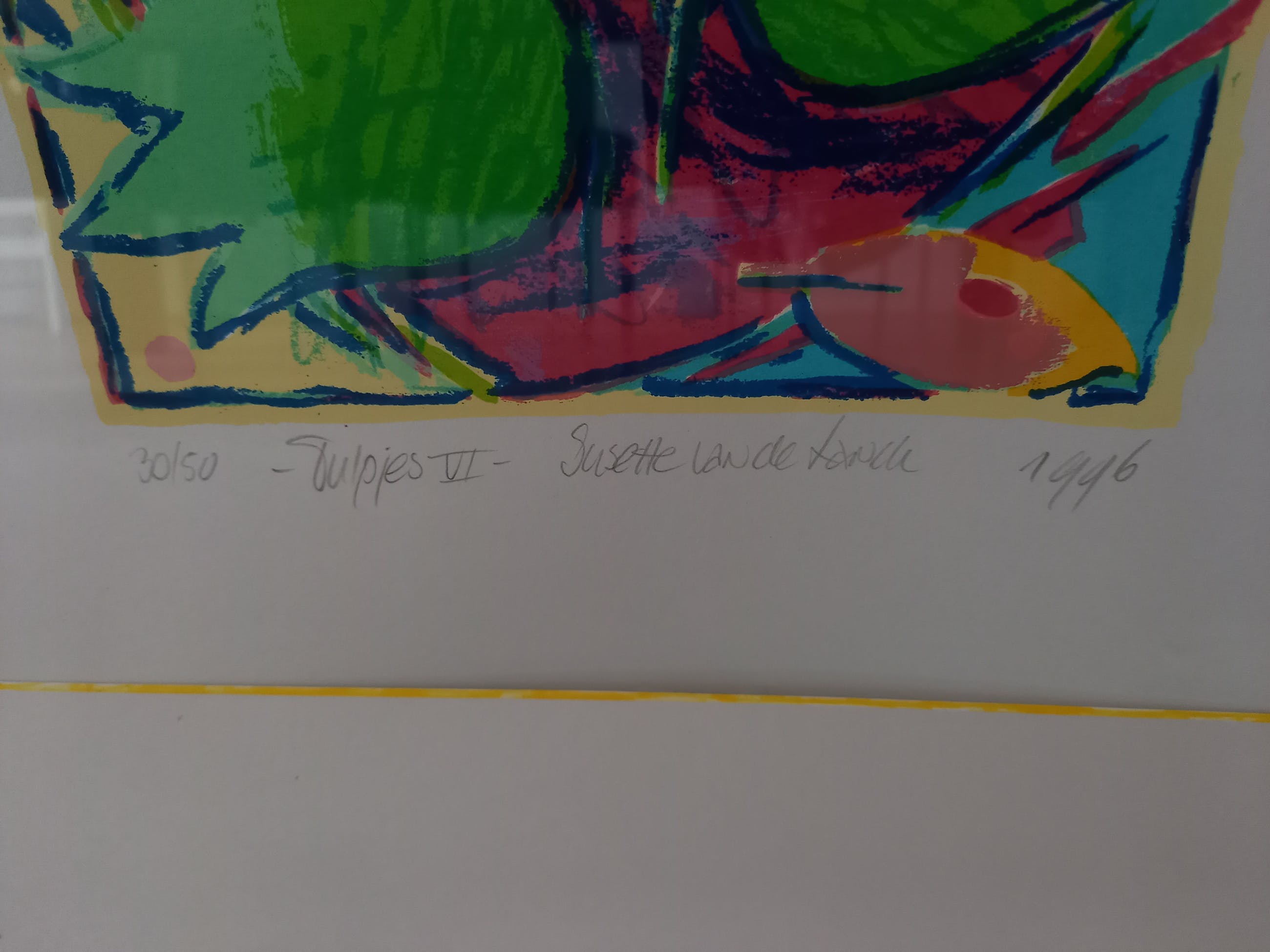 Zeefdruk Susette van de Lande uit 1996. Gele en groen tulpen als set gekocht en graag ook als set nu verkopen.