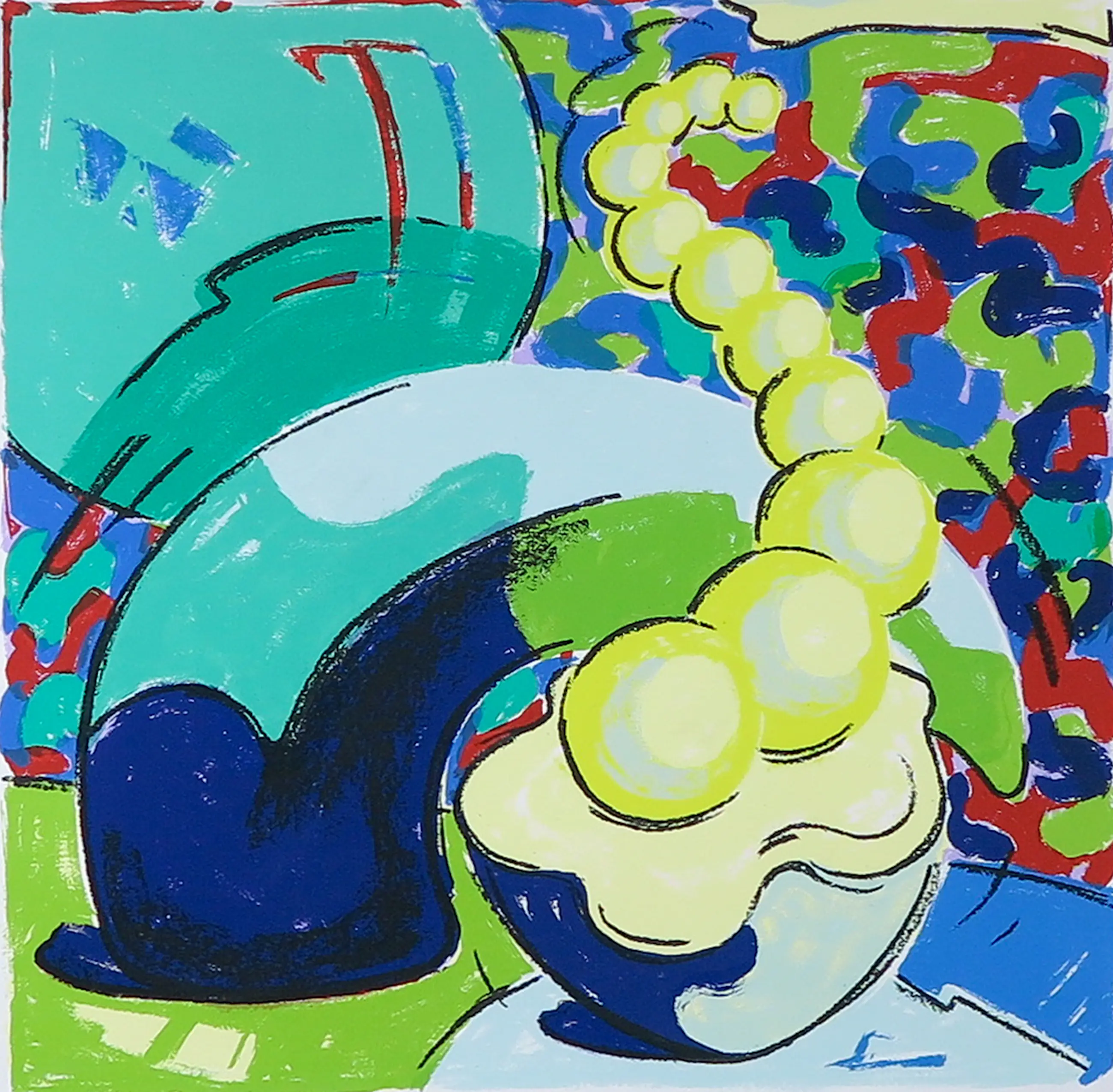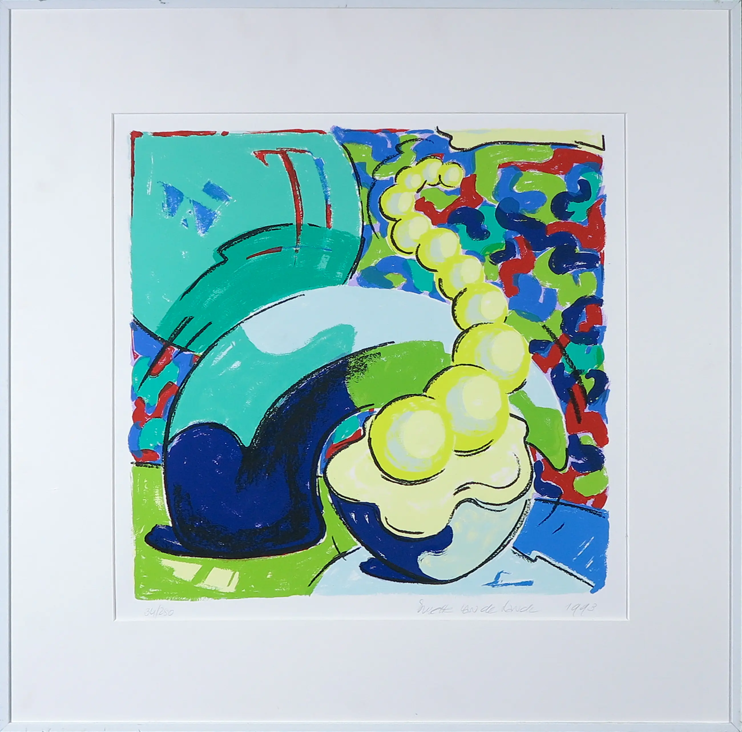 Het passe-partout is wat vlekkerig en de lijst heeft geen glasplaat. De zeefdruk zelf is in zeer goede conditie.