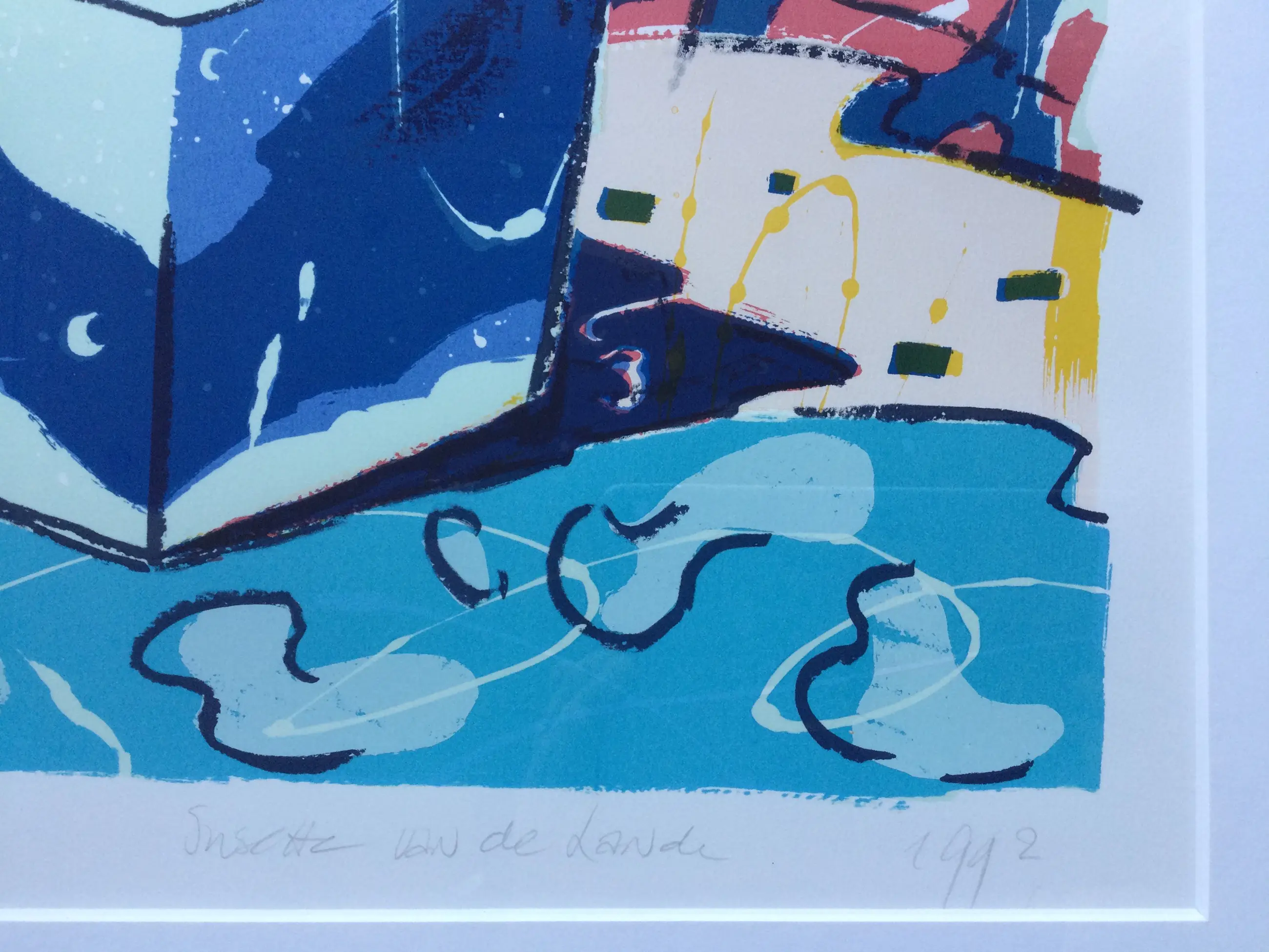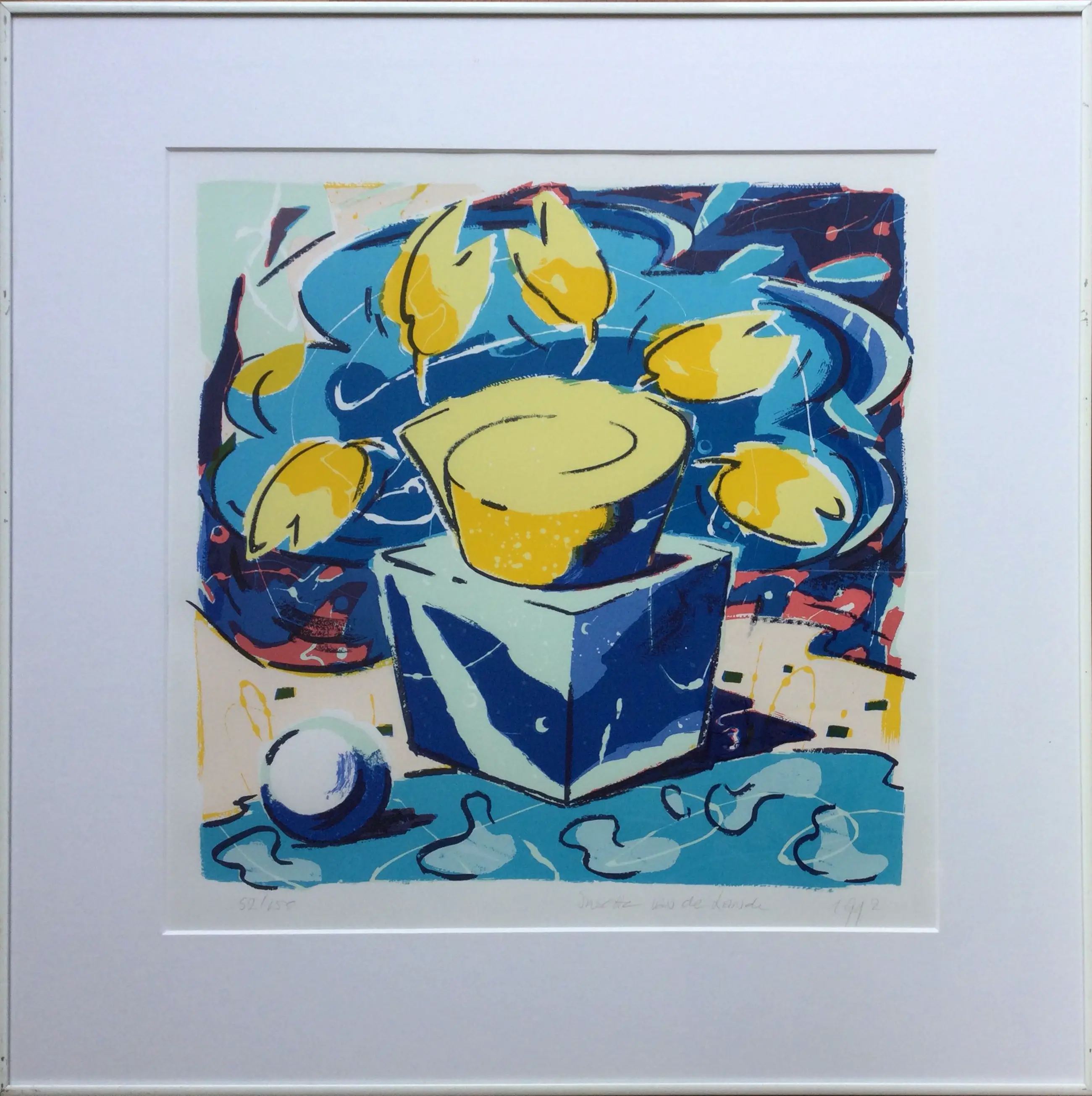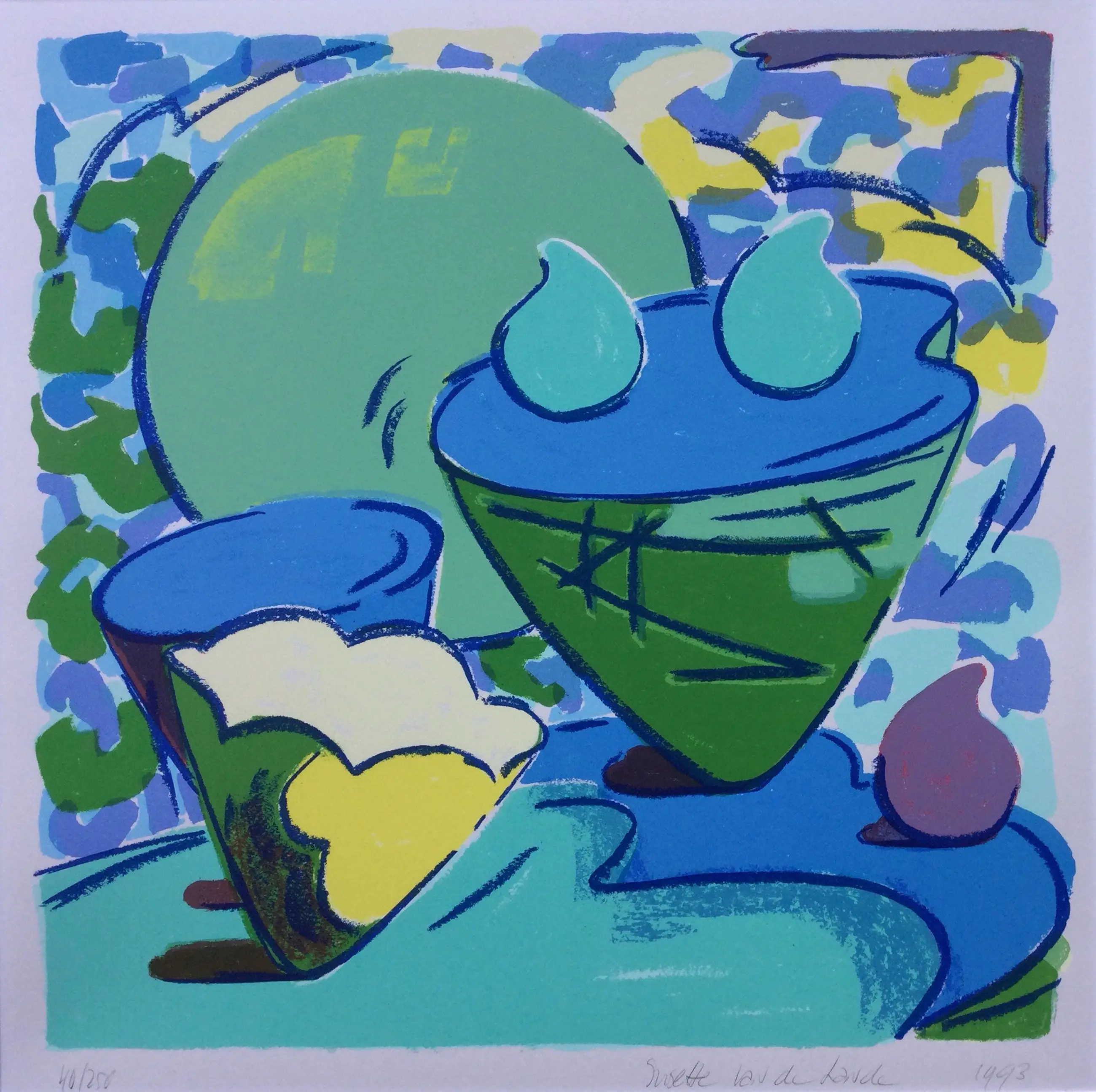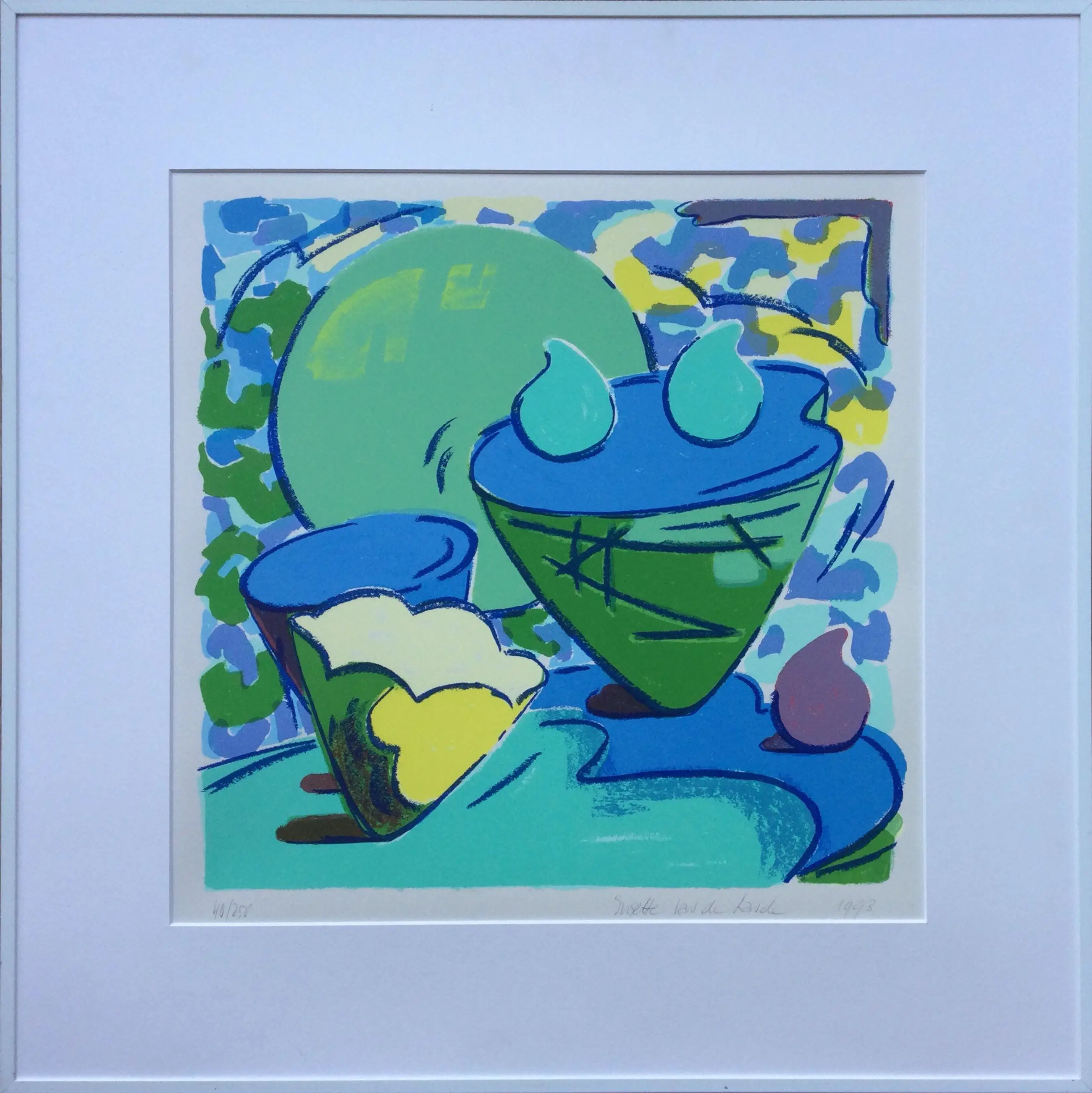 2 kleurrijke zeefdrukken van Susette van de Lande (1959). Typerend voor haar werk.