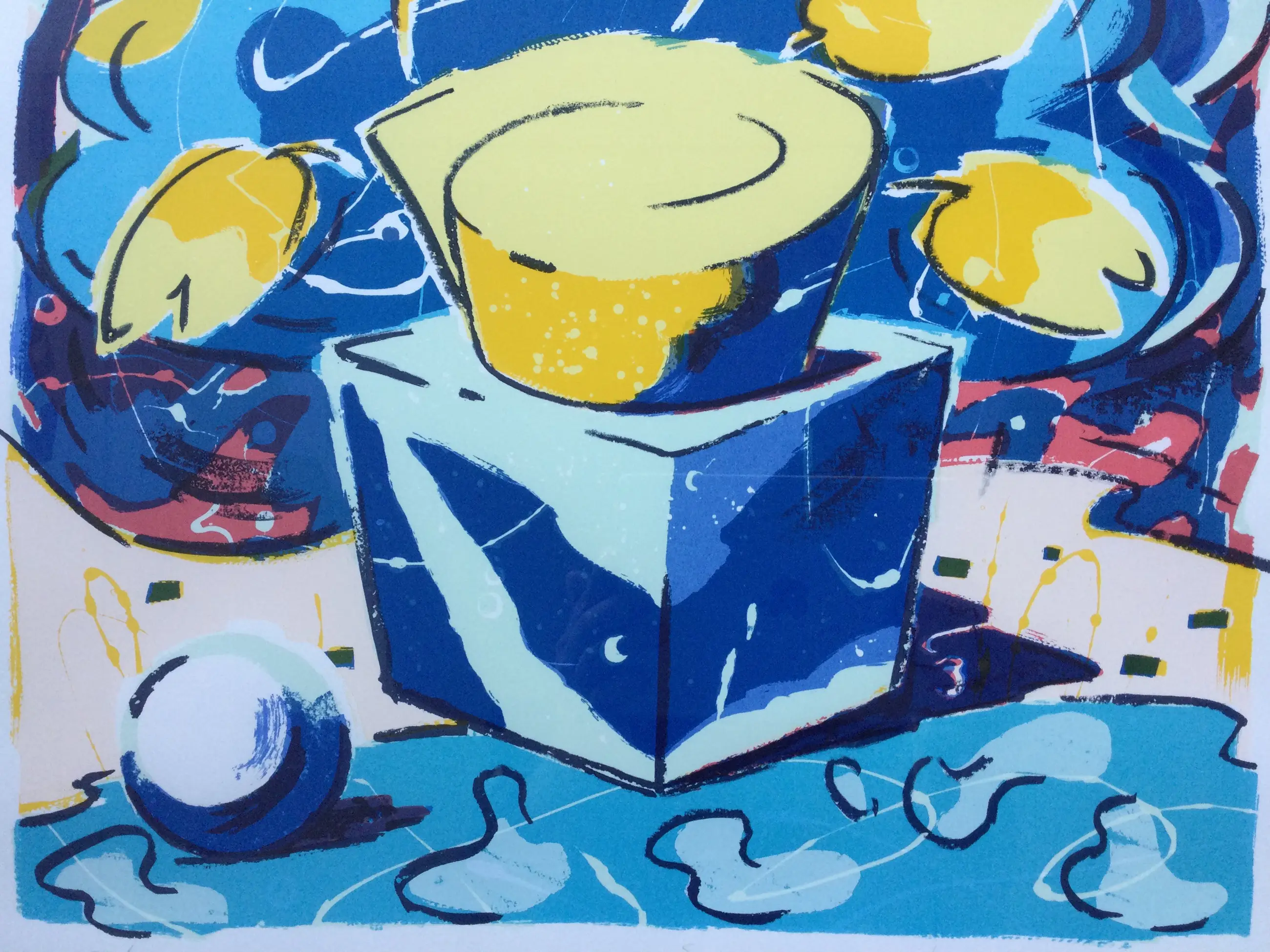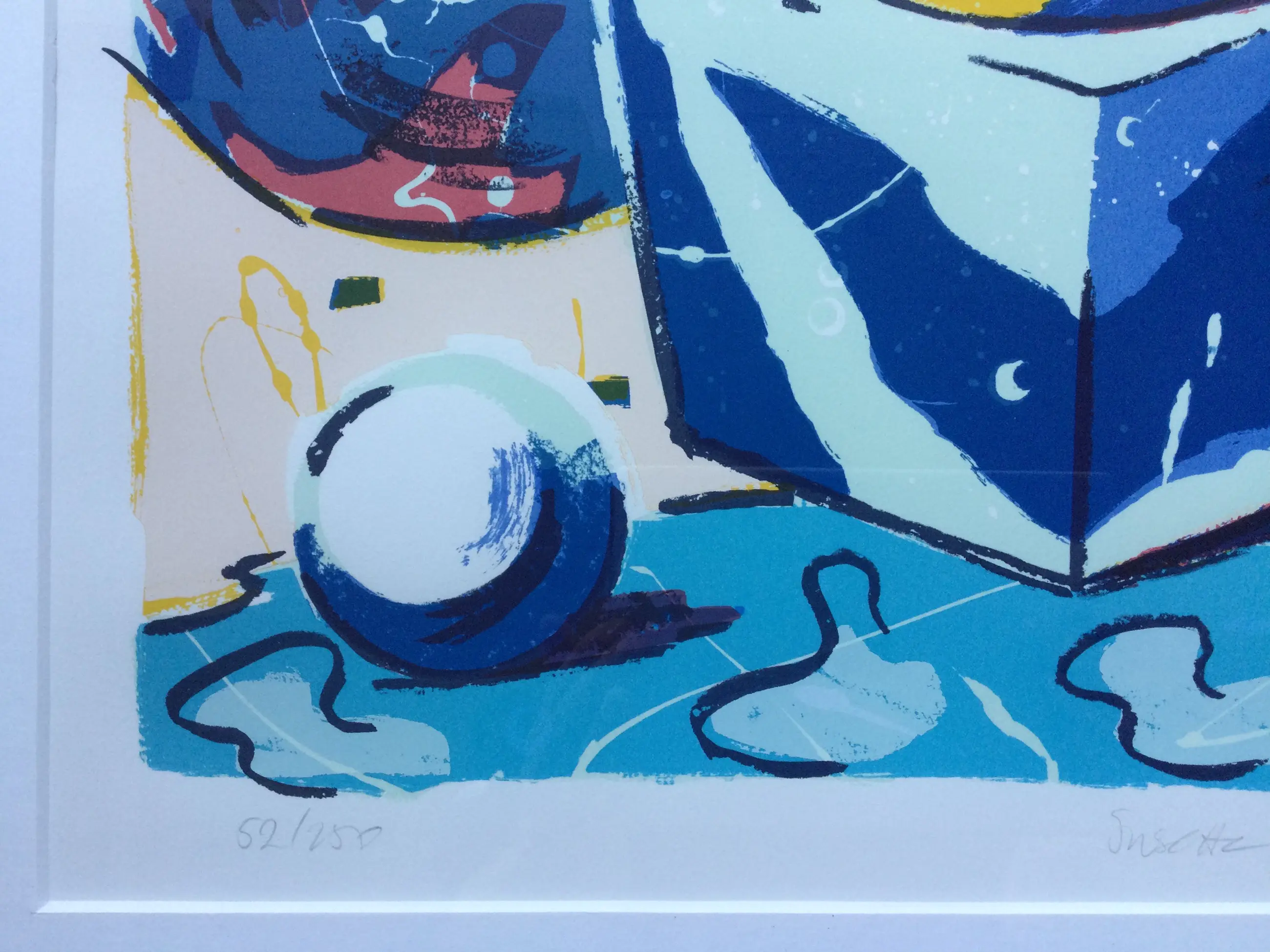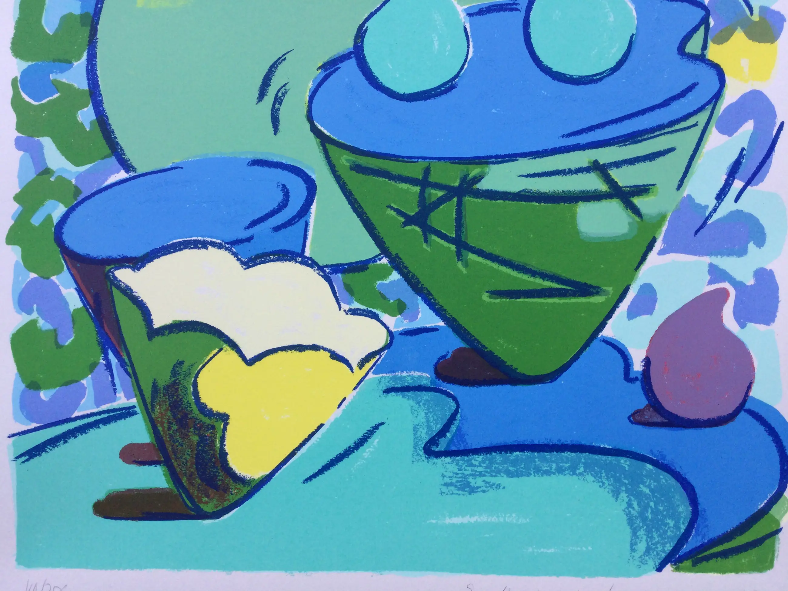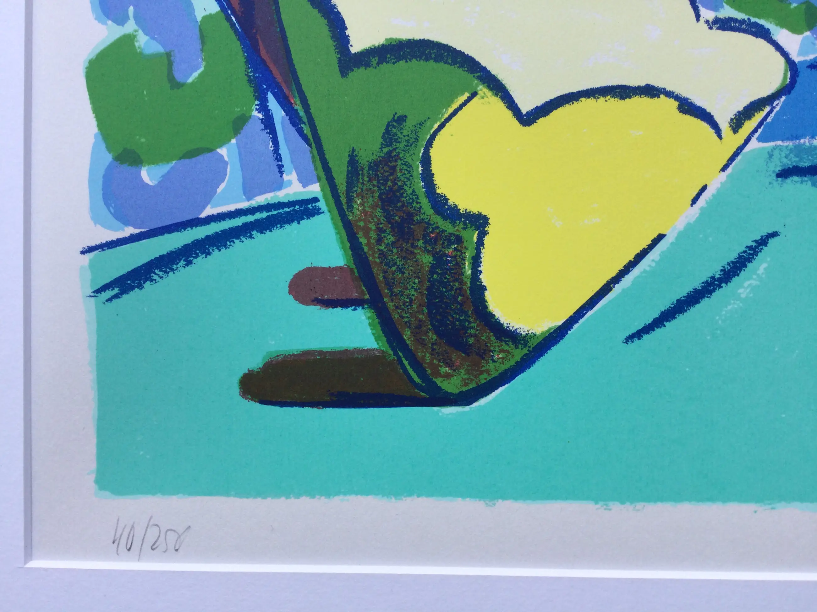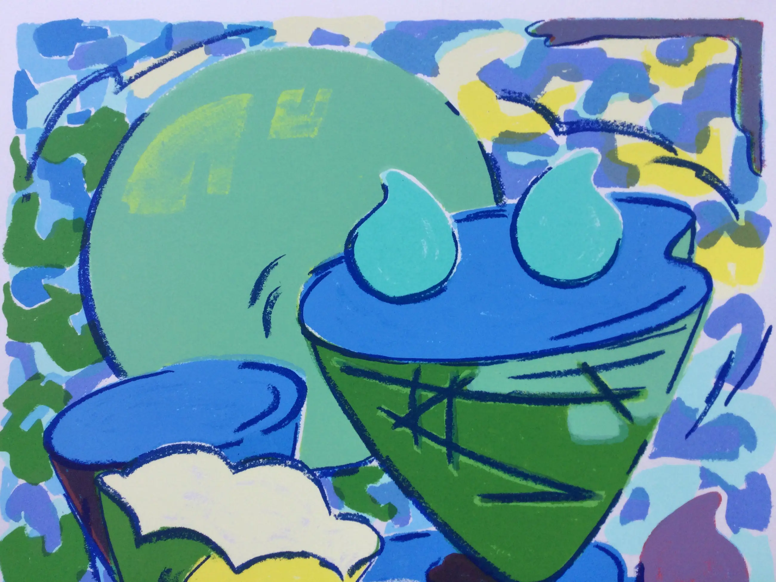 2 kleurrijke zeefdrukken van Susette van de Lande (1959). Typerend voor haar werk.