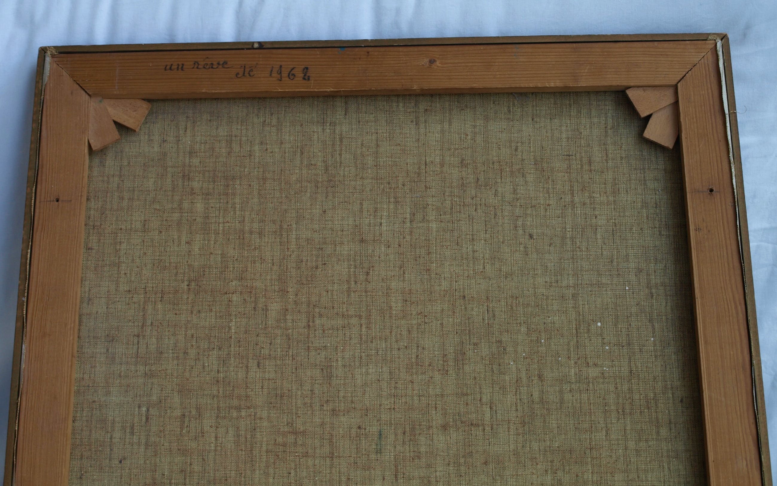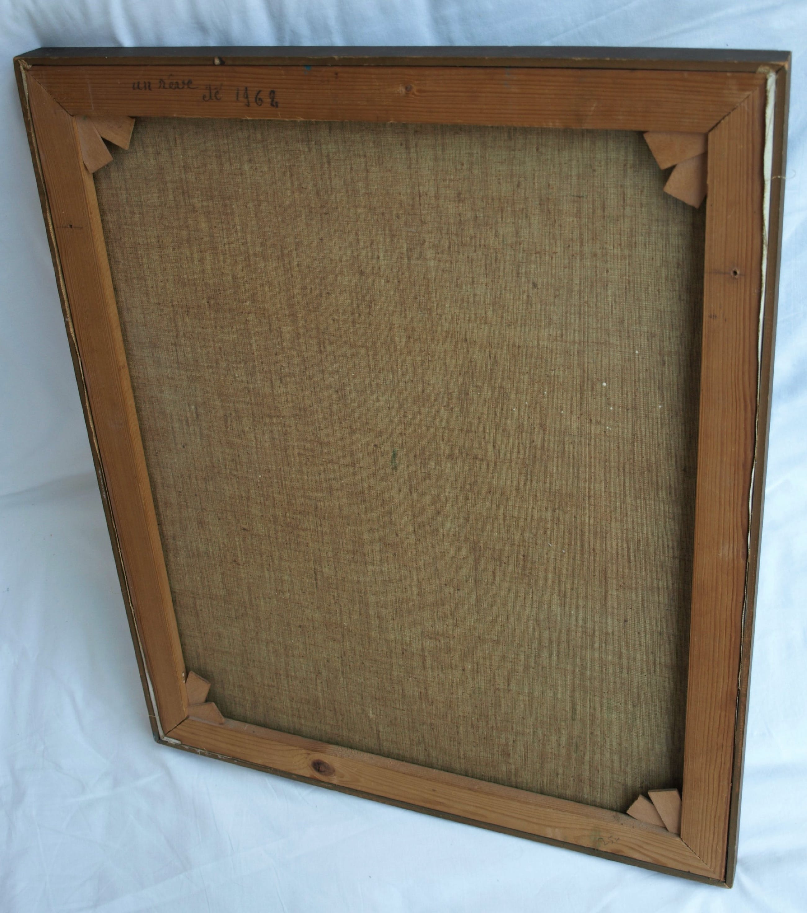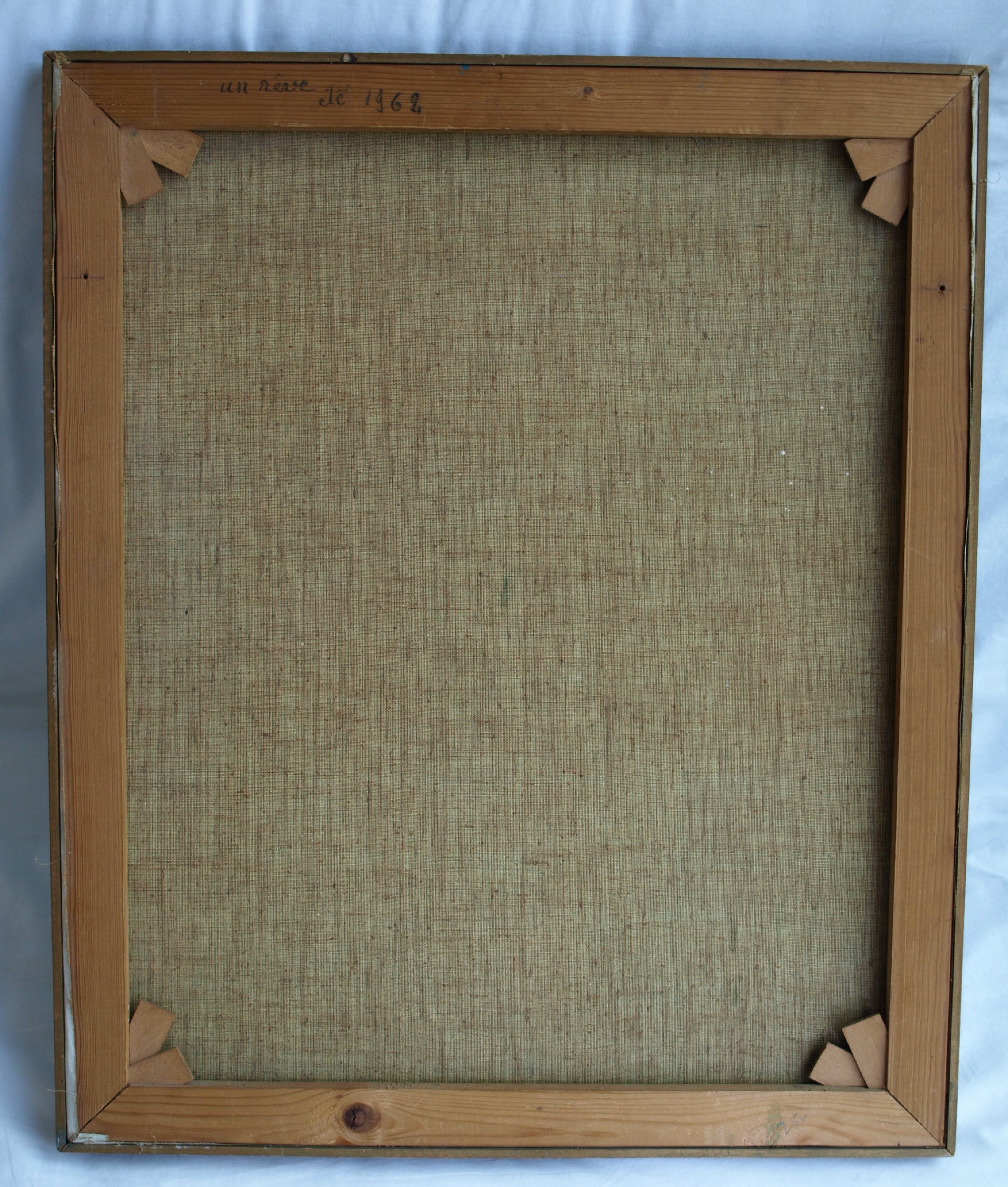 -Olieverf op doek, gespannen op een houten spieraam en ingelijst met de originele expositie-latjes.