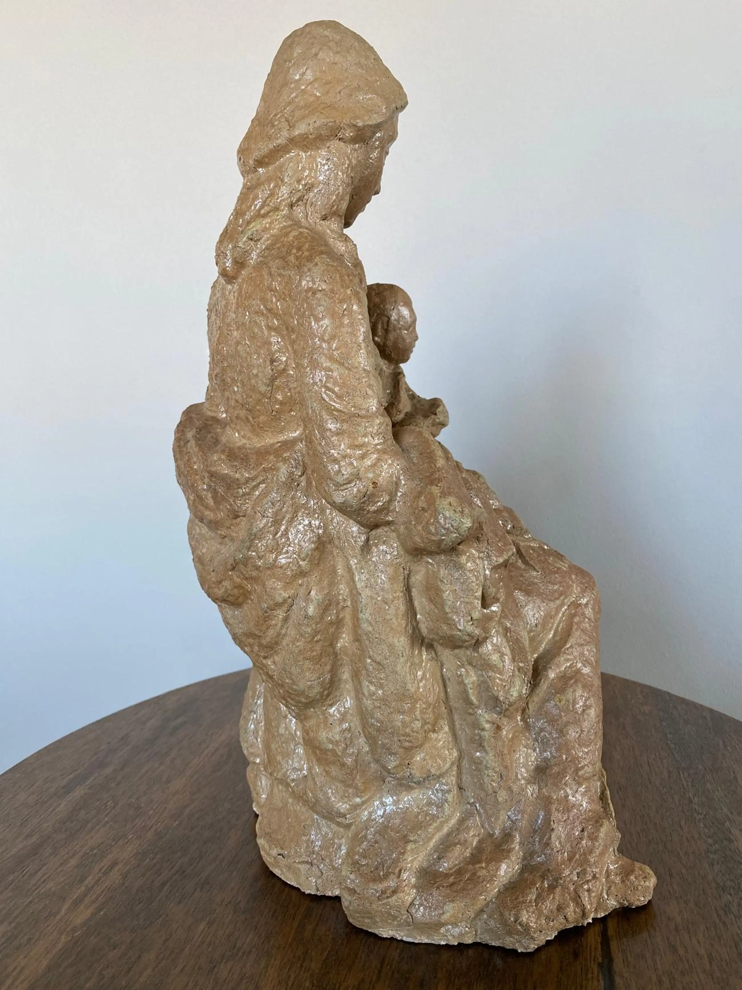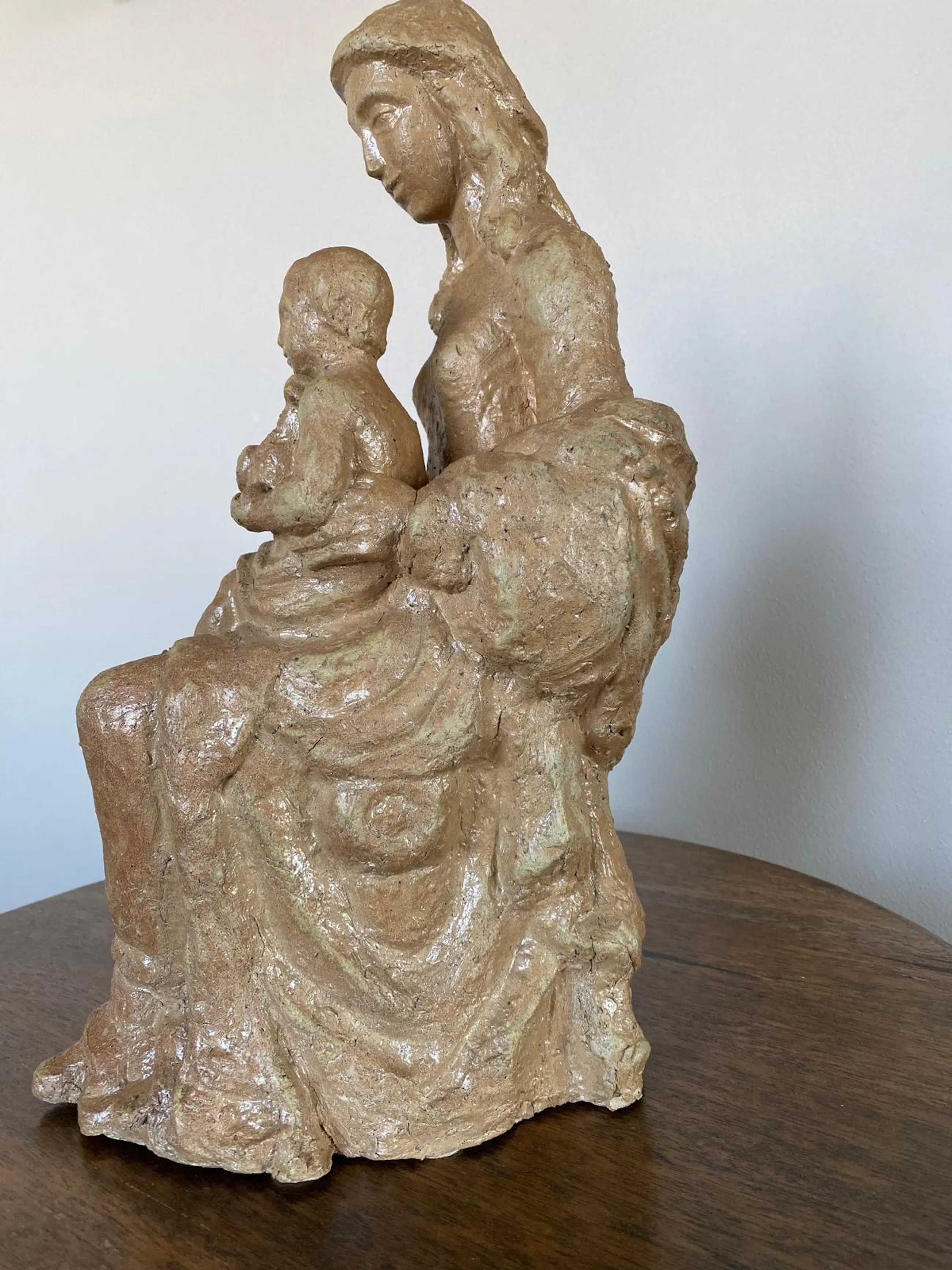 Origineel Keramiek beeld van Suzanne Nicolas Nijs. Hand gesigneerd. Suzanne Nicolas oorspronkelijk Belgisch was getrouwd met de Beroemde Glazenier Joep Nicolas. Zij werkte vaak samen met het Atelier voor Fijn Keramiek Russel Tiglia, te Tegelen waar ze vaak ontwerpen voor maakte. De beelden dier ze maakte waren meestal impressionistisch van aard, waarmee ze de achtergrond en de boodschap van het beeld op de voorgrond zet. Vele beelden die ze maakte waren van echte lokale Maasklei, waarmee al sedert de Romeinse tijd in Tegelen allerlei Keramiek werd geproduceerd. Zij overleed in 1985 te Steyl nabij Roermond.