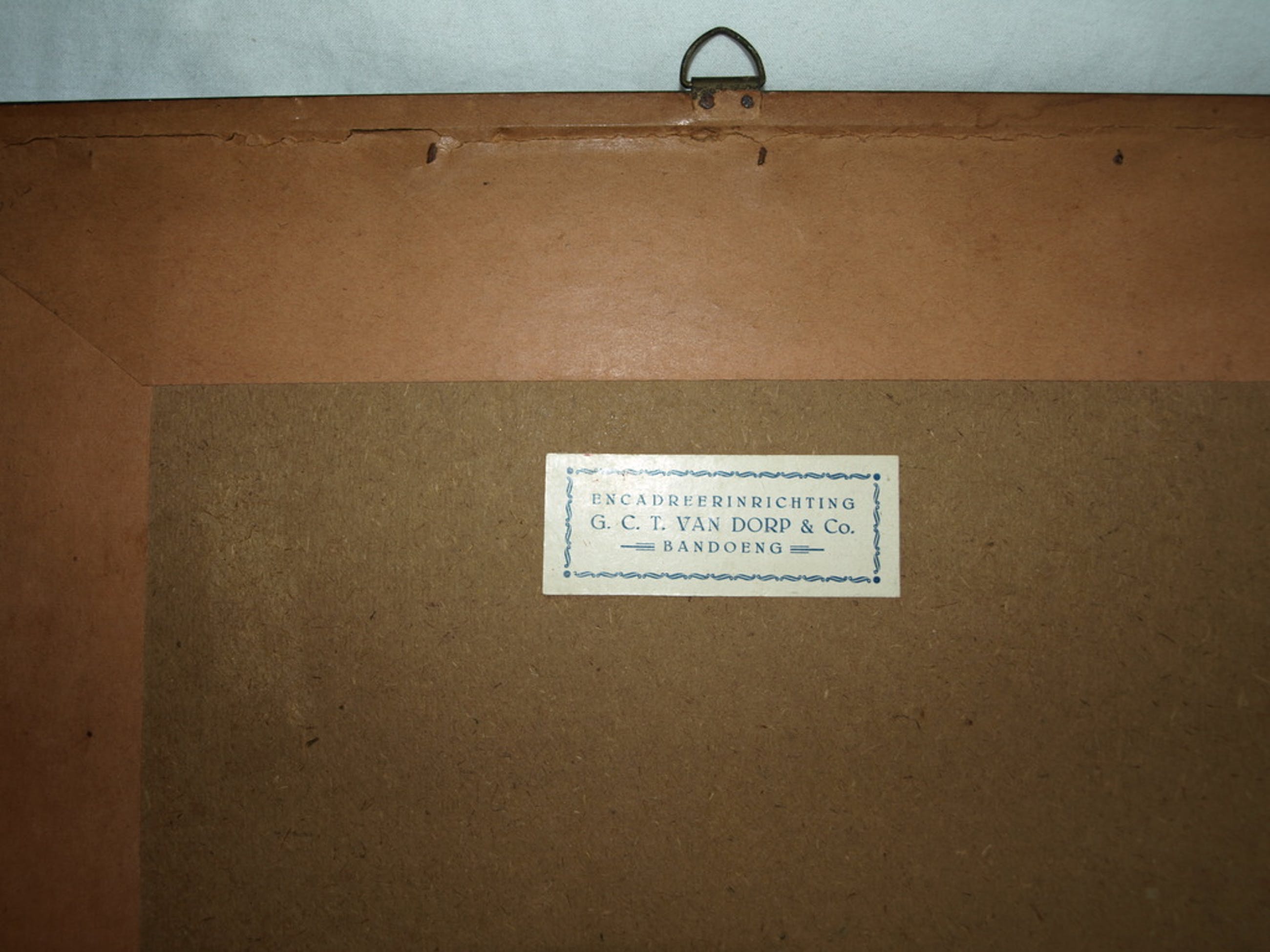 Ingelijst: Ingelijst in een zwarte houten lijst met passe-partout en glasplaat. Ingelijst in Bandoeng (Indonesië, Java) door ‘G.C.T van Dorp & co’.