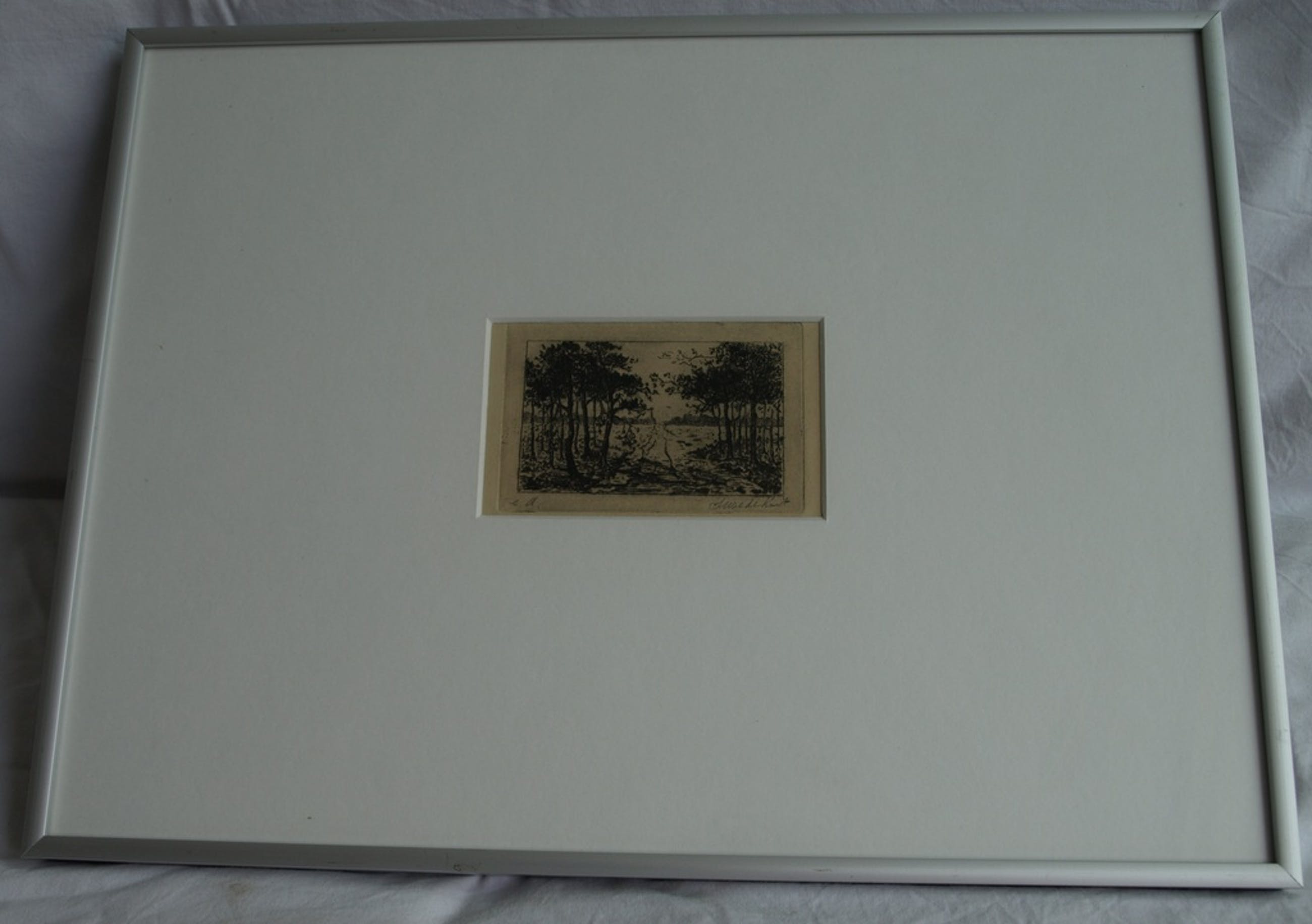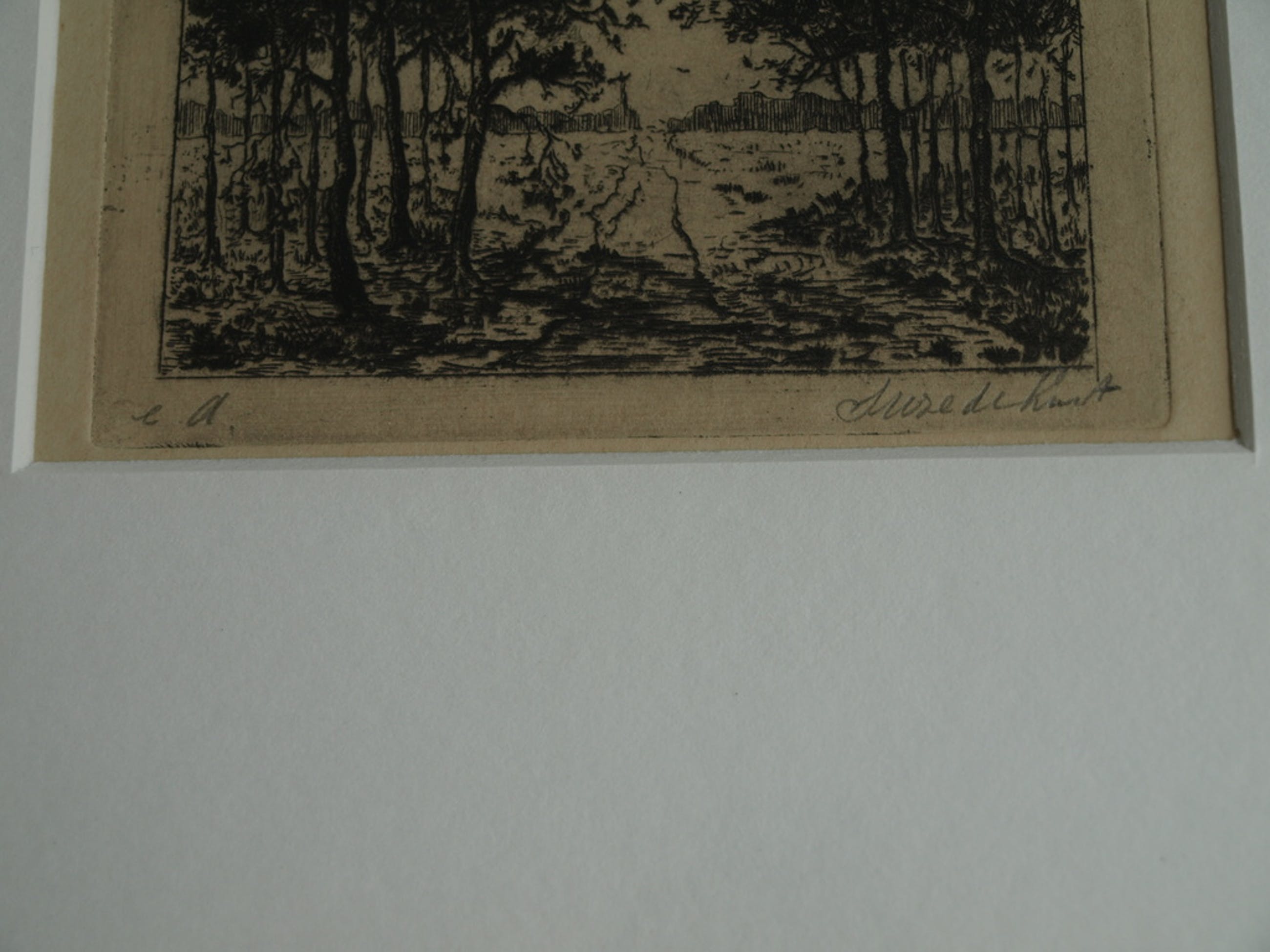Een kleine ets van de Nederlandse kunstenares Suze de Lint met een voorstelling van een landschap met bomen.