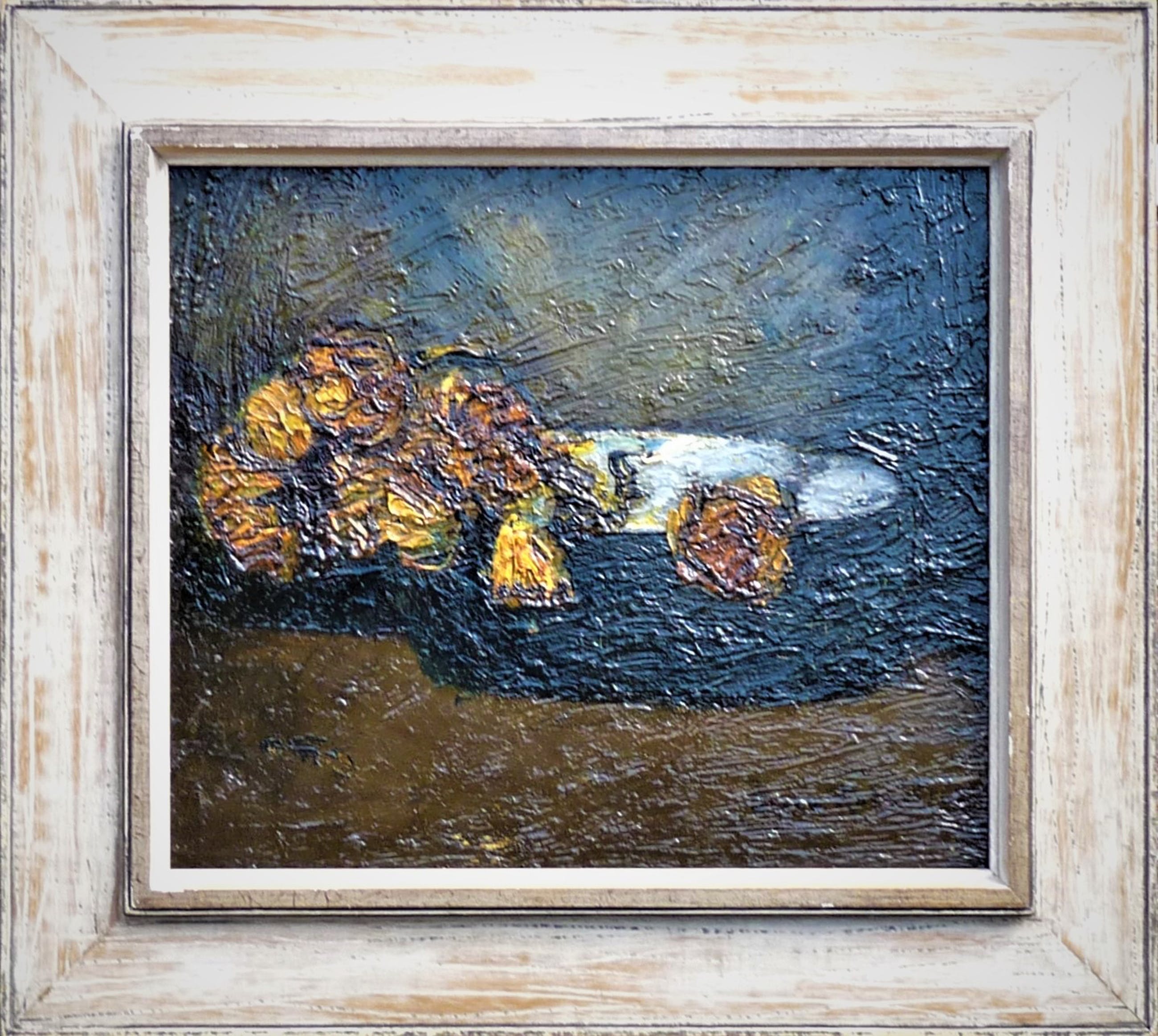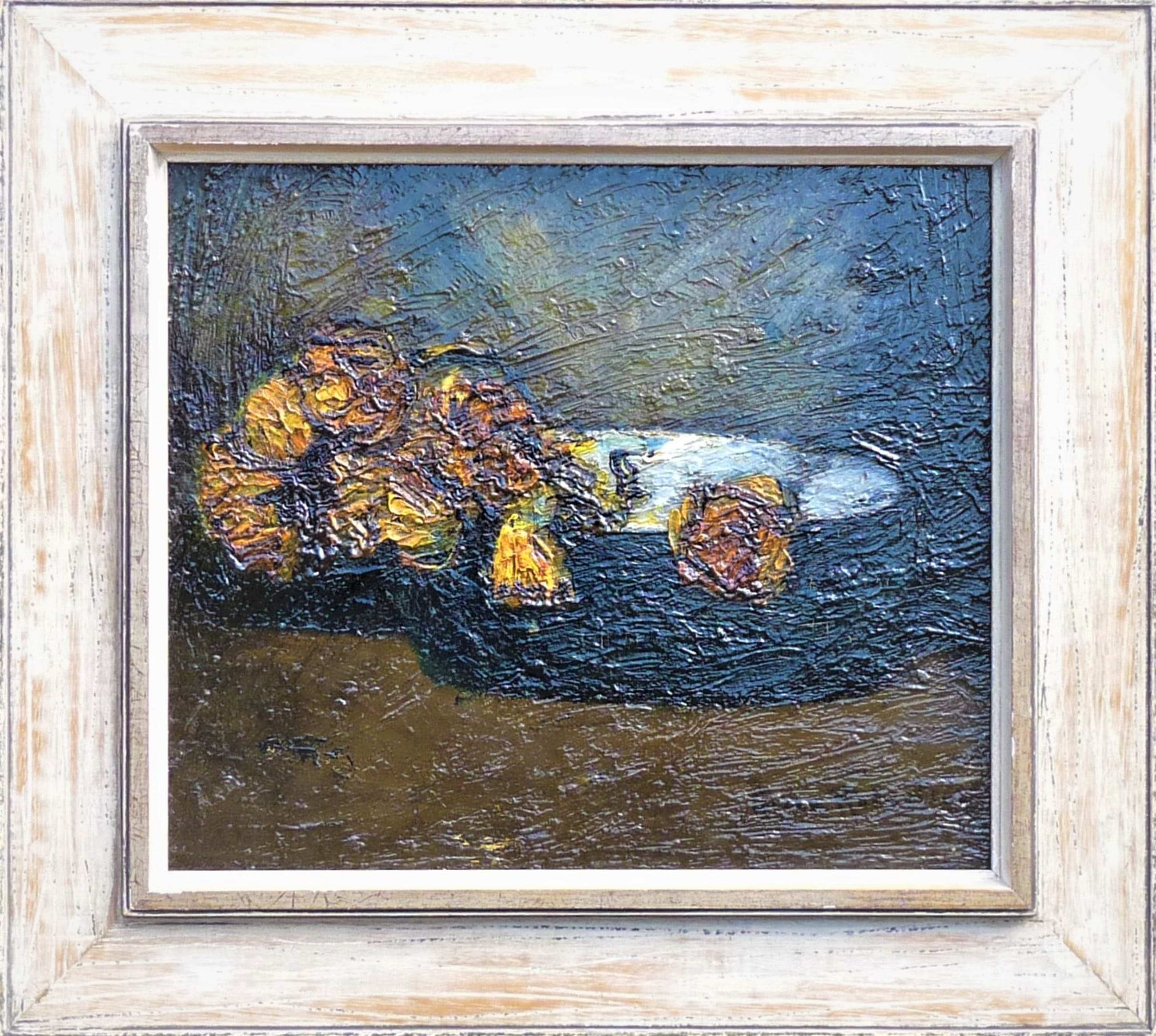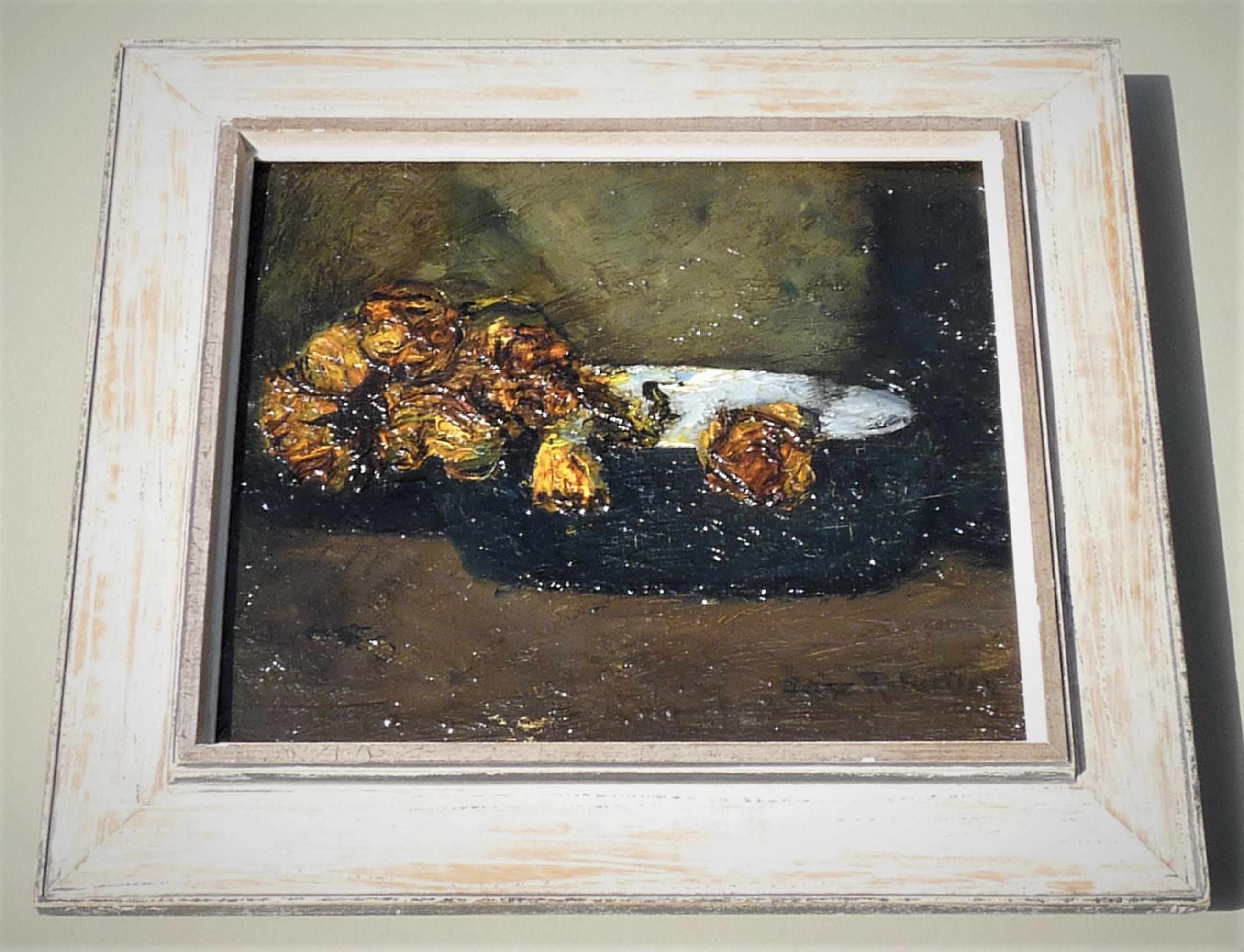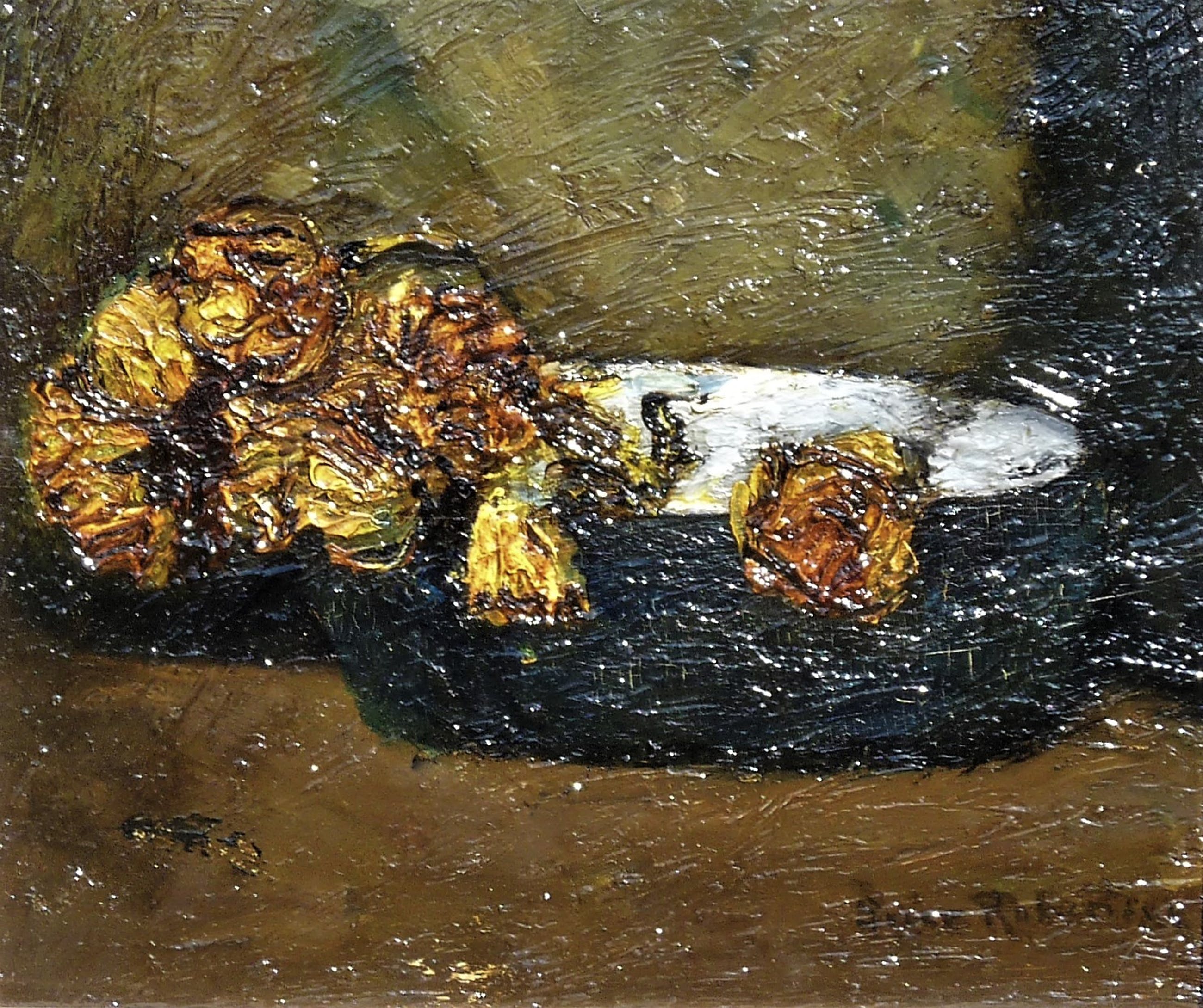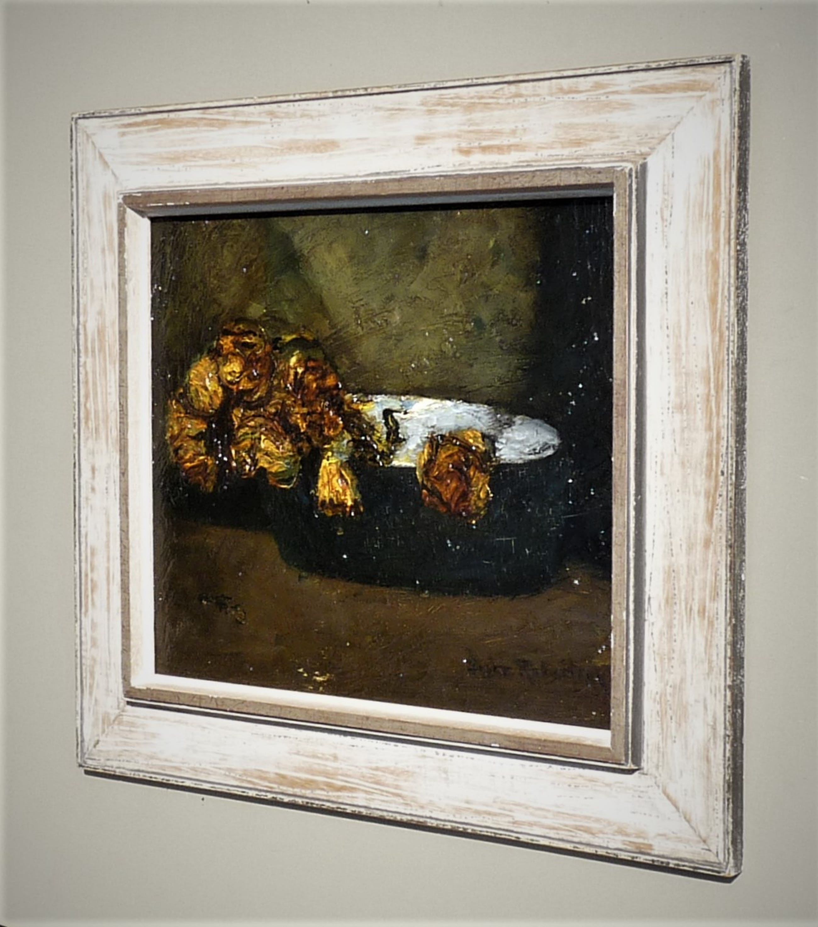 Mooi werk van de kunstenares Suze Robertson (1855-1892). Ze leefde kort maar heeft een bijzonder ouevre achter gelaten. Haar werk, vaak donker en expressief, had een zeer herkenbare stijl. Ze werkte vaak zoals in dit werk niet pasteus met de verf zelf, maar maakte eerste een ondergrond van een bepaald mengsel met een bepaalde struktuur, waarop ze veelal dun schilderde. Dit werk was zeer vuil en verkleurd door oude vernislagen. Schilderij is recentelijk professioneel gereinigd (oppervlaktereiniging en verwijderen vernislagen en daarna voorzien van nieuwe vernis) De binnenkant van de schaal was bruin en heeft nu weer zijn oorspronkelijke grijze kleur.Wat verder te vertellen over deze kunstenares. Haar werk hangt in vele musea en heeft een duidelijke plaats in de kunstgeschiedenis van Nederland. Het werk is r.o. gesigneerd. Overduidelijk haar signatuur, doch niet zo makkelijk te zien op de fotos omdat het lichtbruin op bruin is geschilderd. Fotograferen was niet echt makkelijk door reflecties van de struktuur van het werk. Dit schilderij wordt door mij volledig gegarandeerd als authentiek.