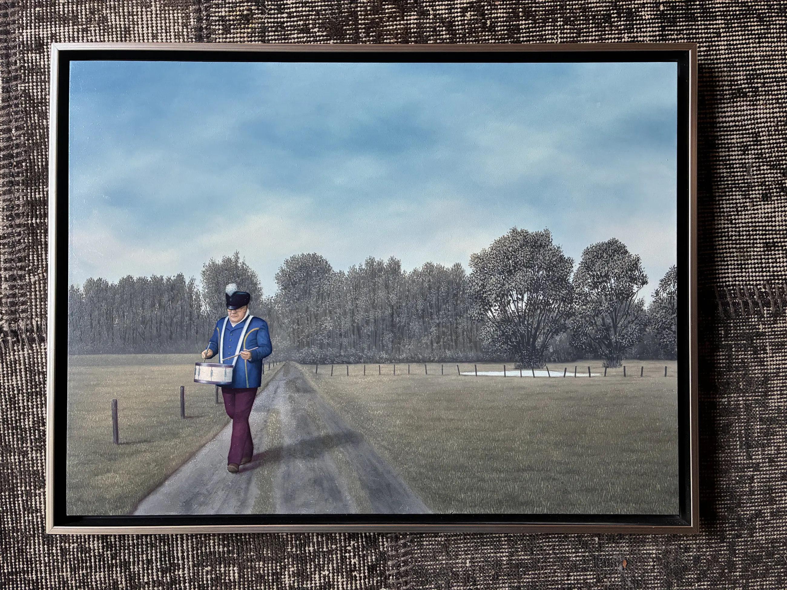 Olieverf op board van Sven Hoekstra. Titel: Naar huis Het werk is niet duidelijk gesigneerd door de kunstenaar. De authenticiteit van het aangeboden werk wordt volledig gegarandeerd. Een afbeelding staat op de website van de kunstenaar: https://www.svenhoekstra.nl/2005-/afb26.html Het onderwerp van dit schilderij (en muzikant in een landschap is typerend voor de stijl van Sven Hoekstra.