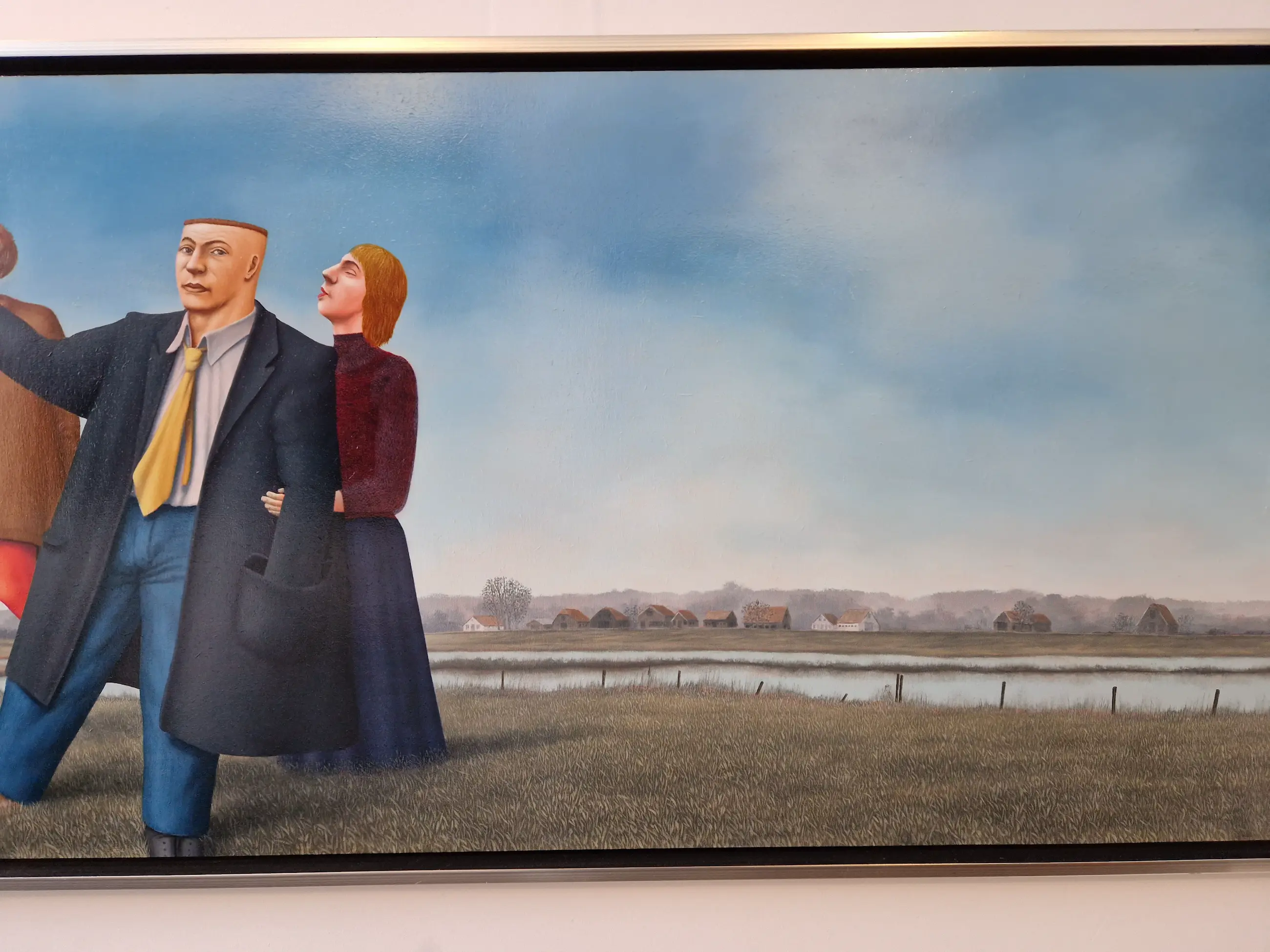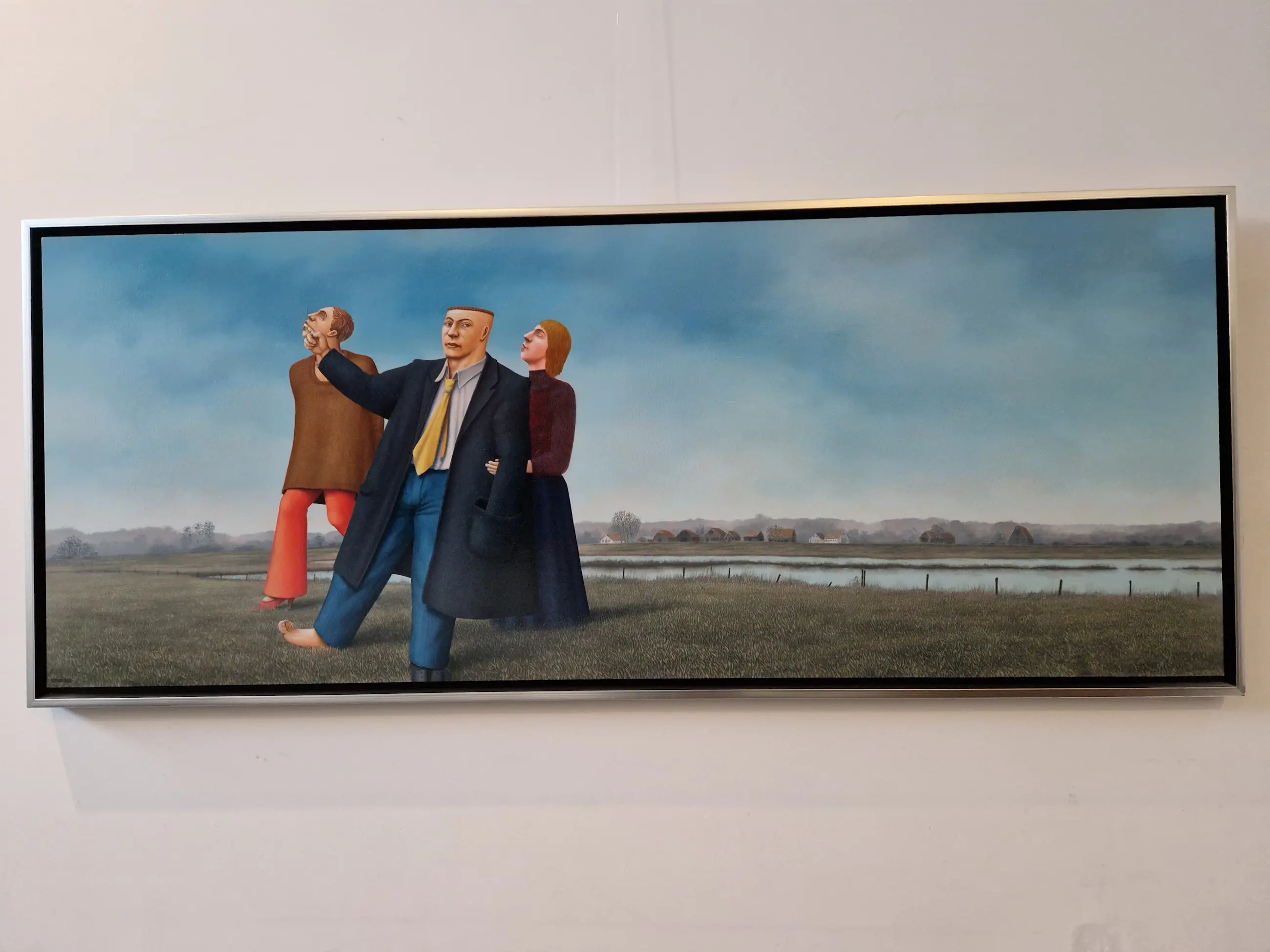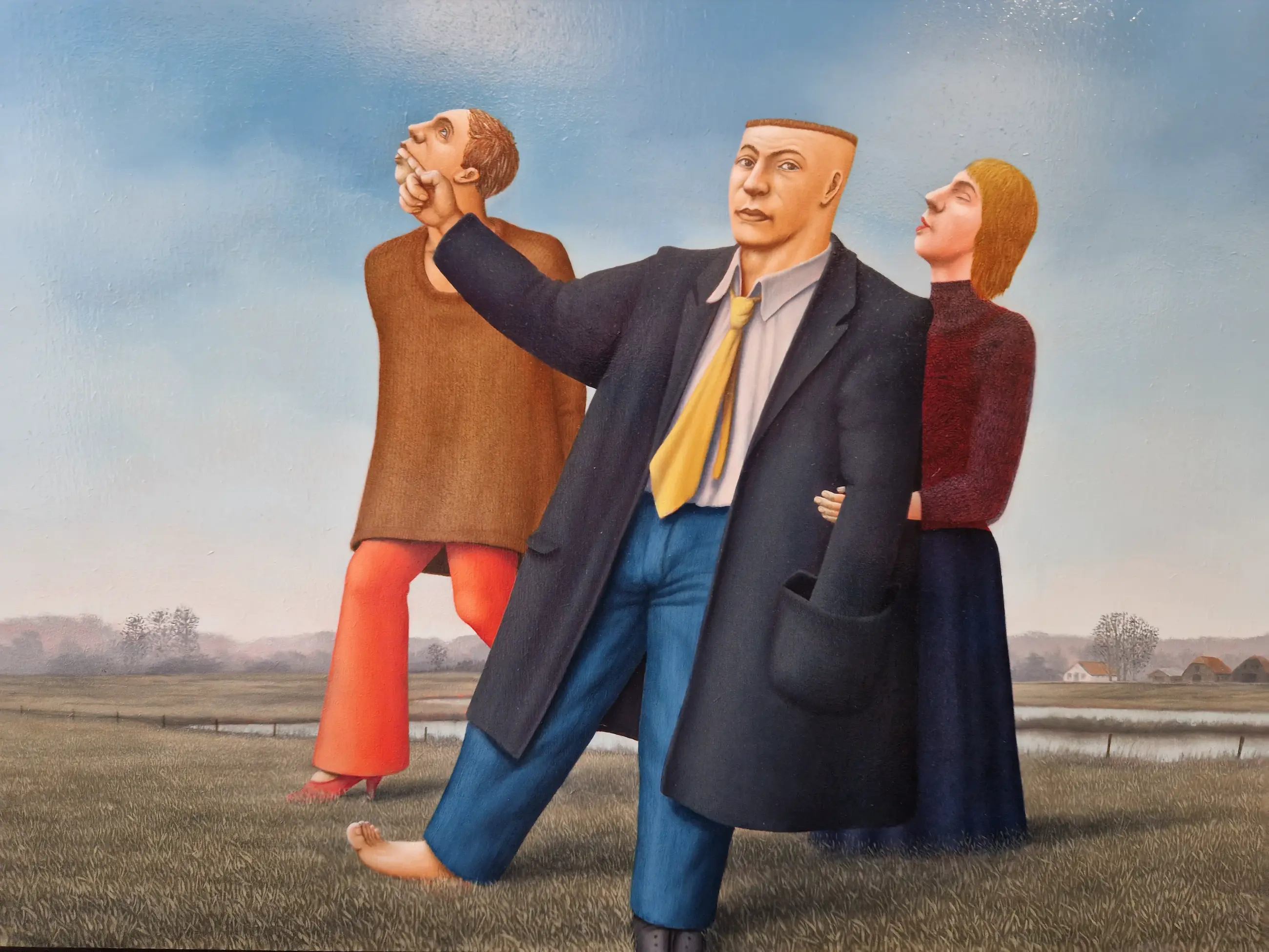 De achtergrond (de Waal...?) is heel realistisch weergegeven, terwijl de drie figuren op de voorgrond naïef en absurdistisch zijn geschilderd. Het effect hiervan op de kijker is een bevreemdende indruk, waarbij een glimlach haast niet te onderdrukken is.