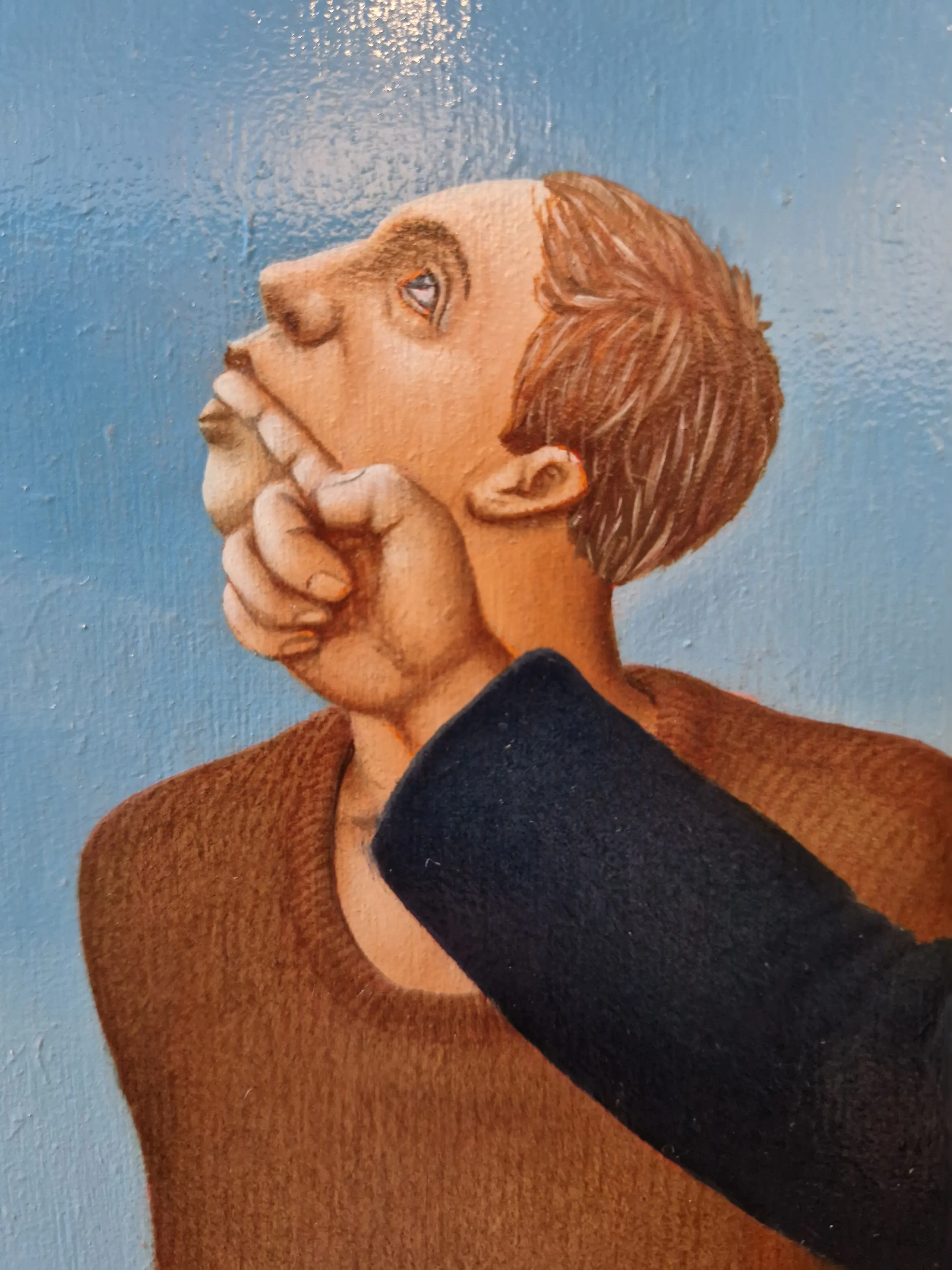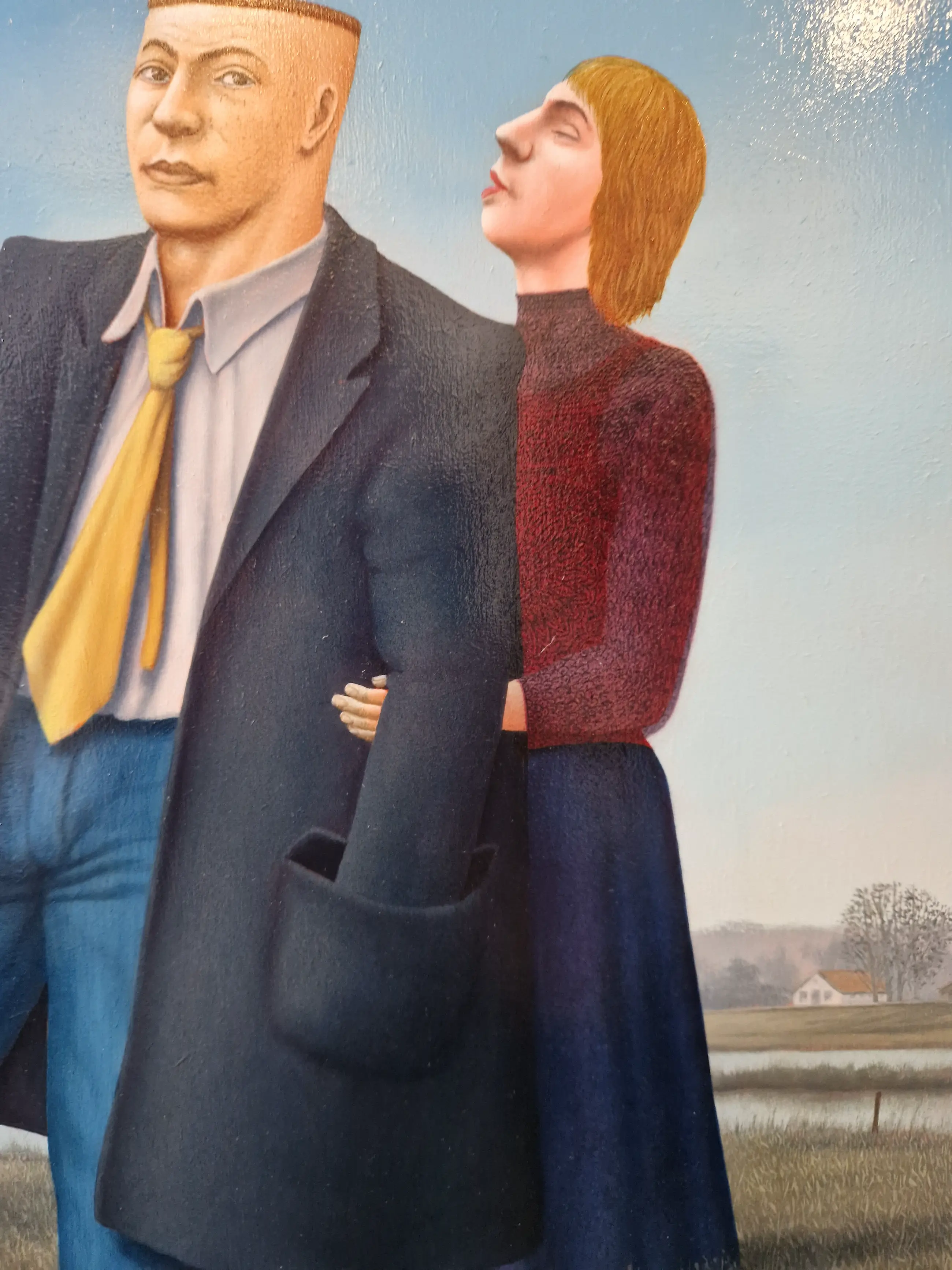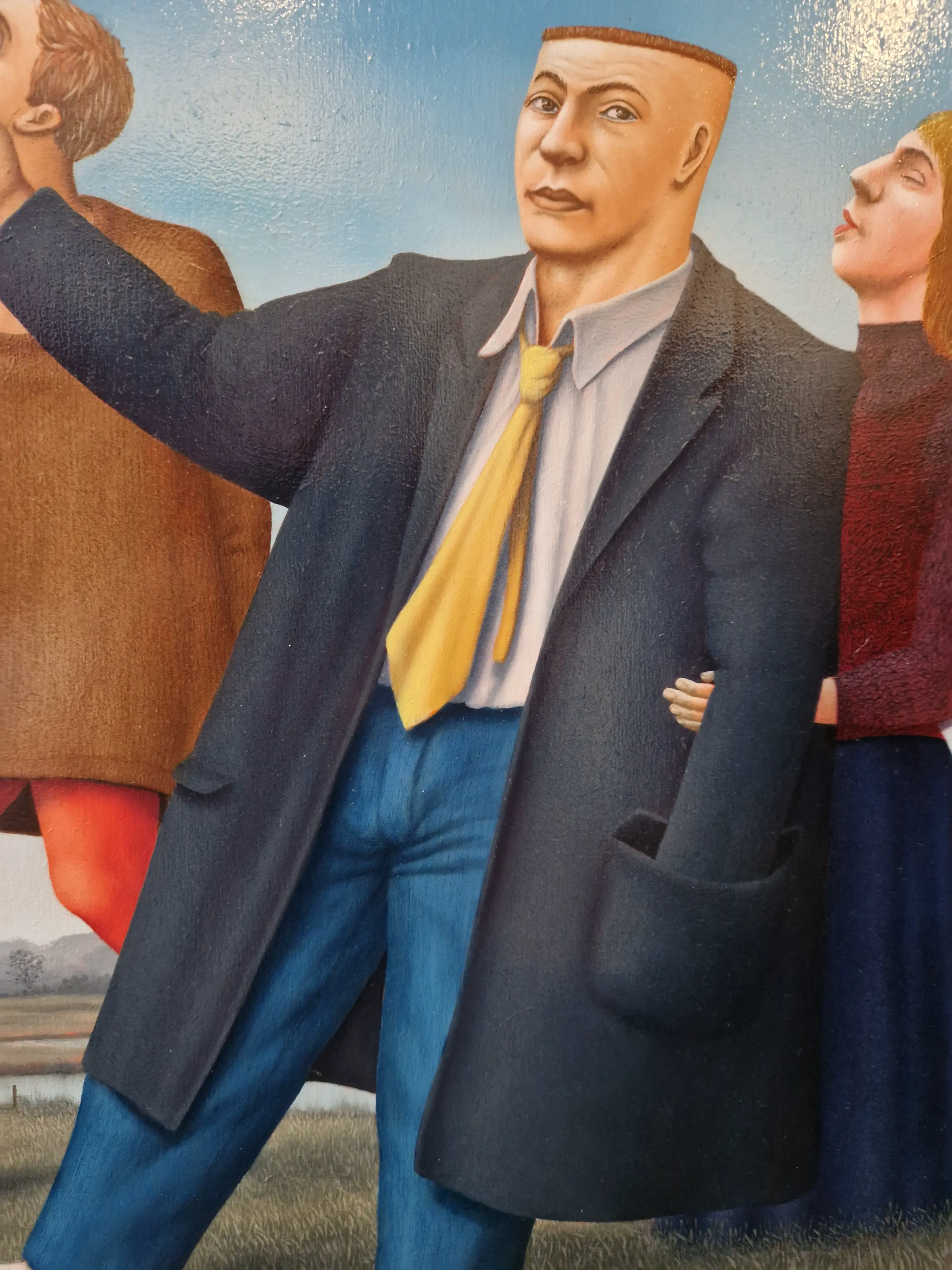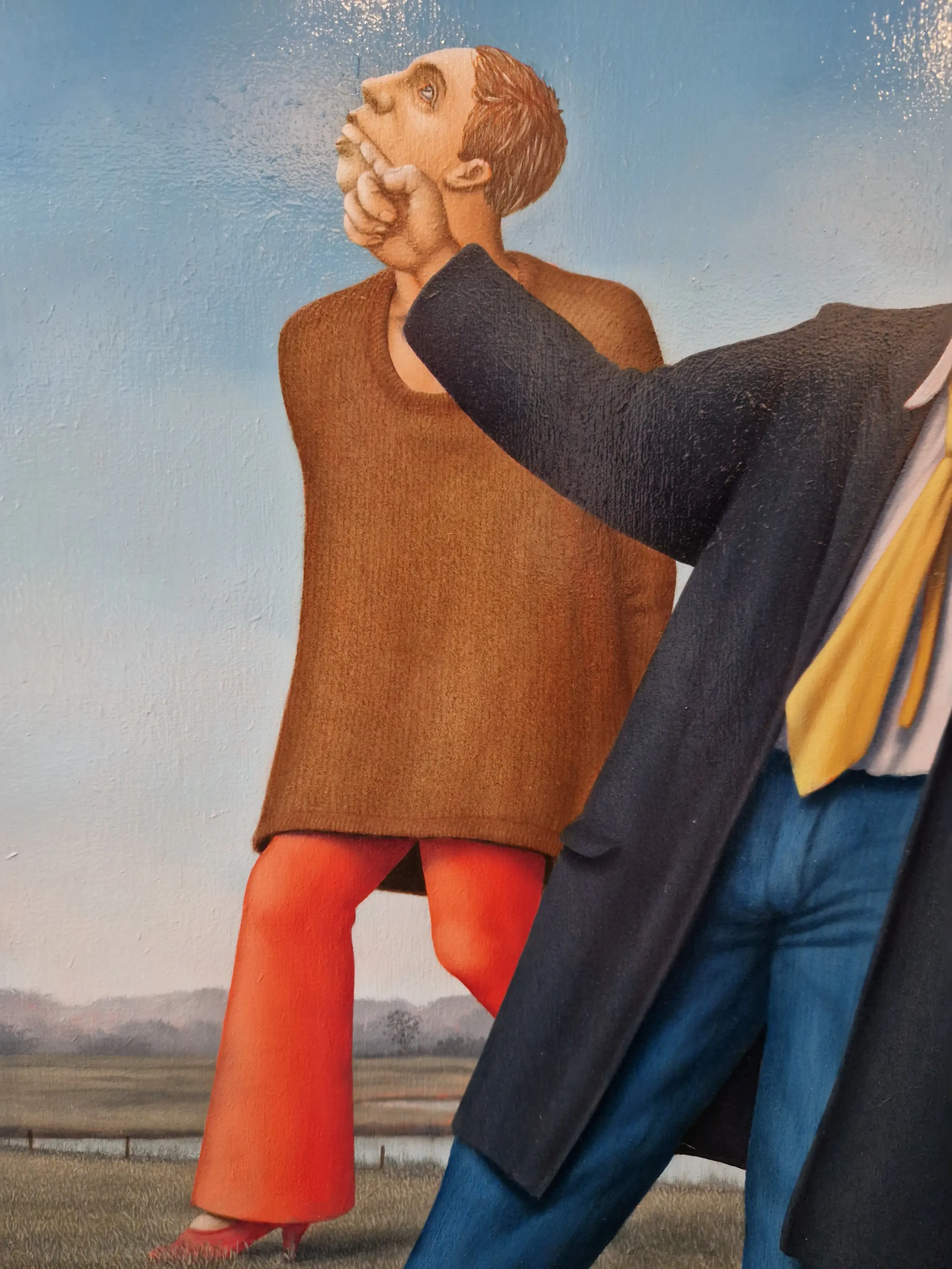 De achtergrond (de Waal...?) is heel realistisch weergegeven, terwijl de drie figuren op de voorgrond naïef en absurdistisch zijn geschilderd. Het effect hiervan op de kijker is een bevreemdende indruk, waarbij een glimlach haast niet te onderdrukken is.