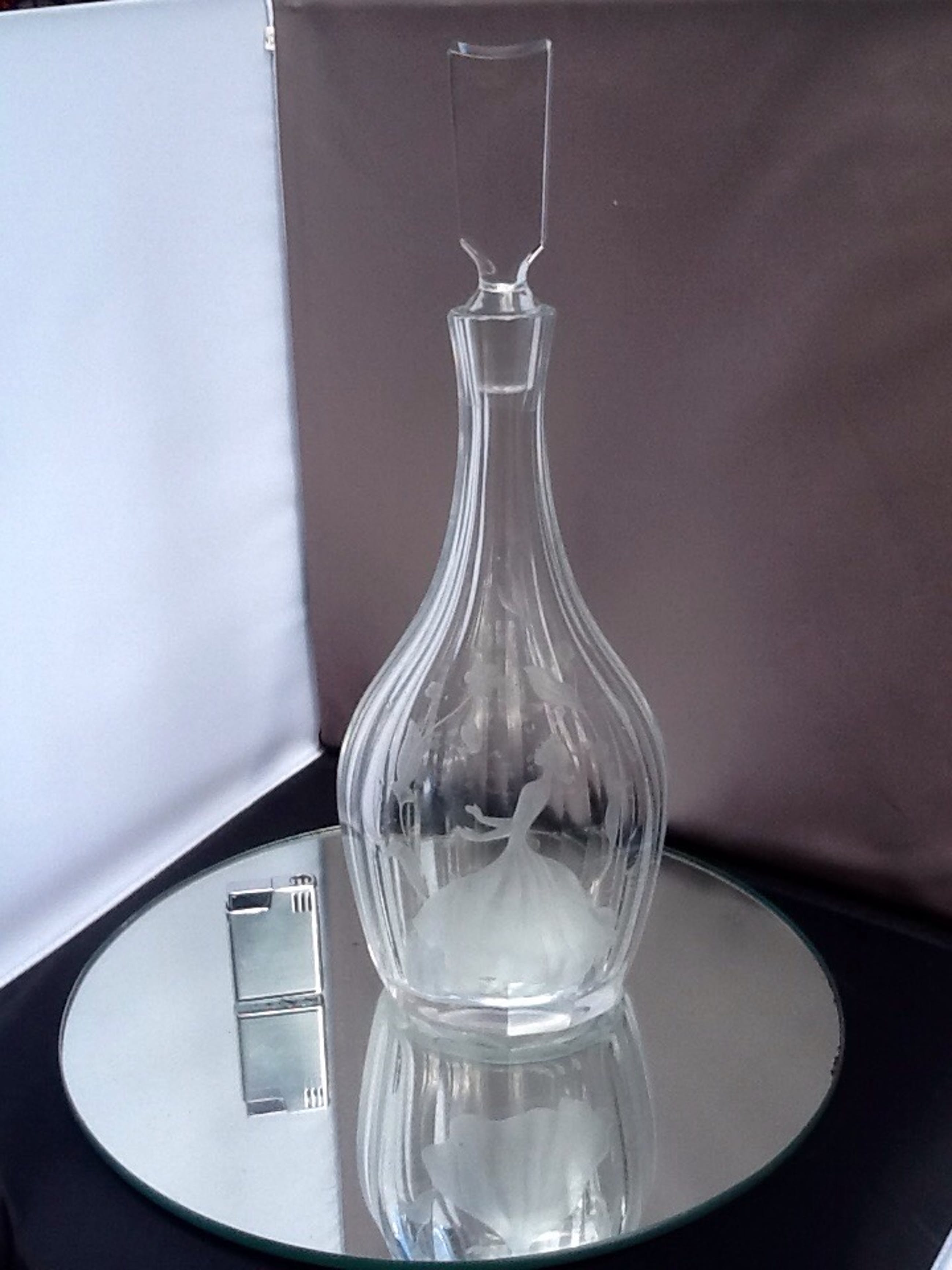 De karaf heeft ook een mooi gevormde gefaceteerde stop en een geëtste voorstelling van een vrouw met bloemen en vogels.