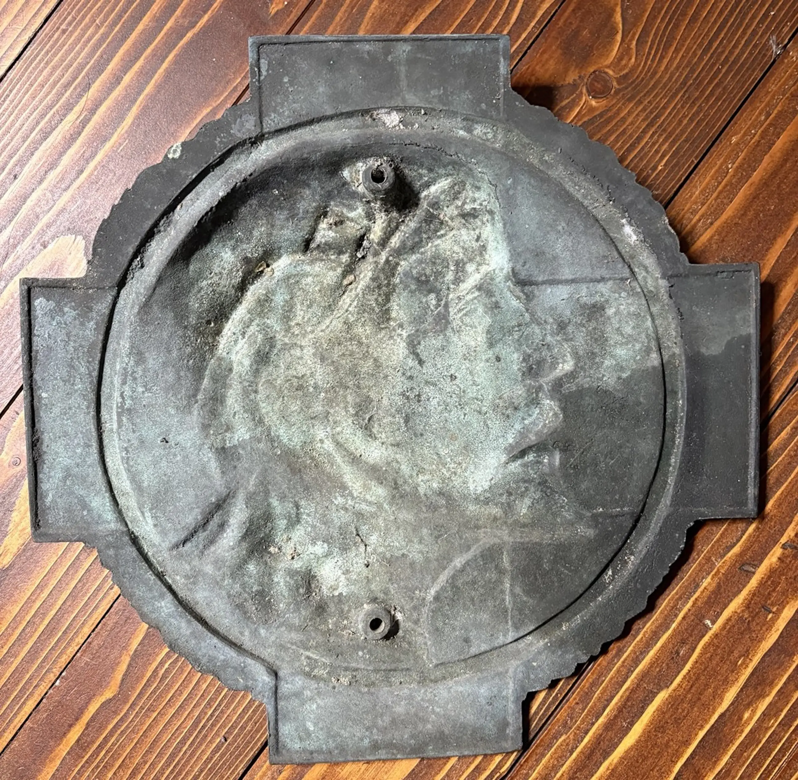 De plaquette heeft een mooie natuurlijke groene patina (verdigris) die de ouderdom en authenticiteit benadrukt. Gesigneerd S. NORGA onderaan het midden. Op de achterkant twee schroefgaten voor wandmontage.