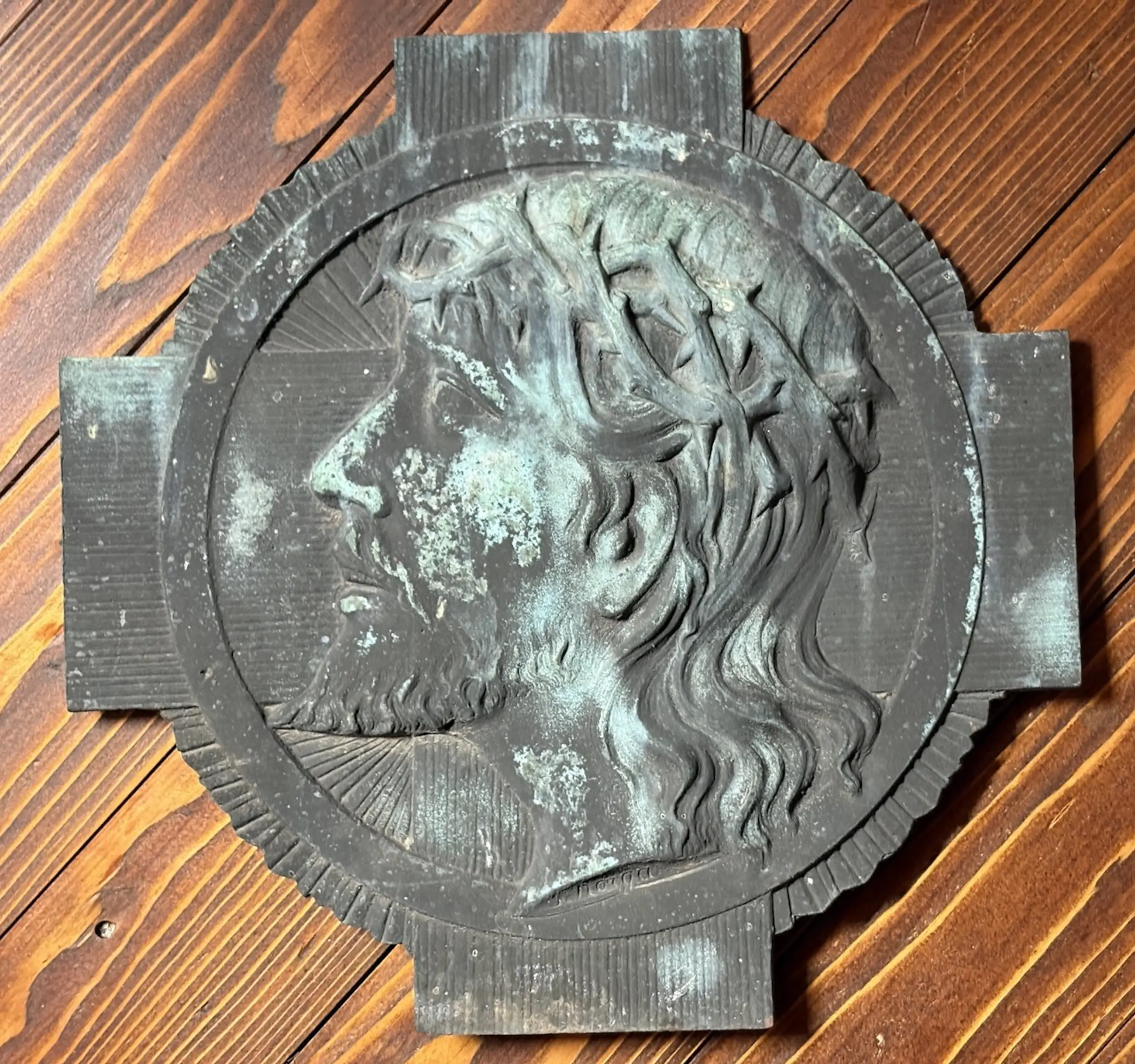 Sylvain Norga - Bronzen reliëfplaquette met Christus hoofd