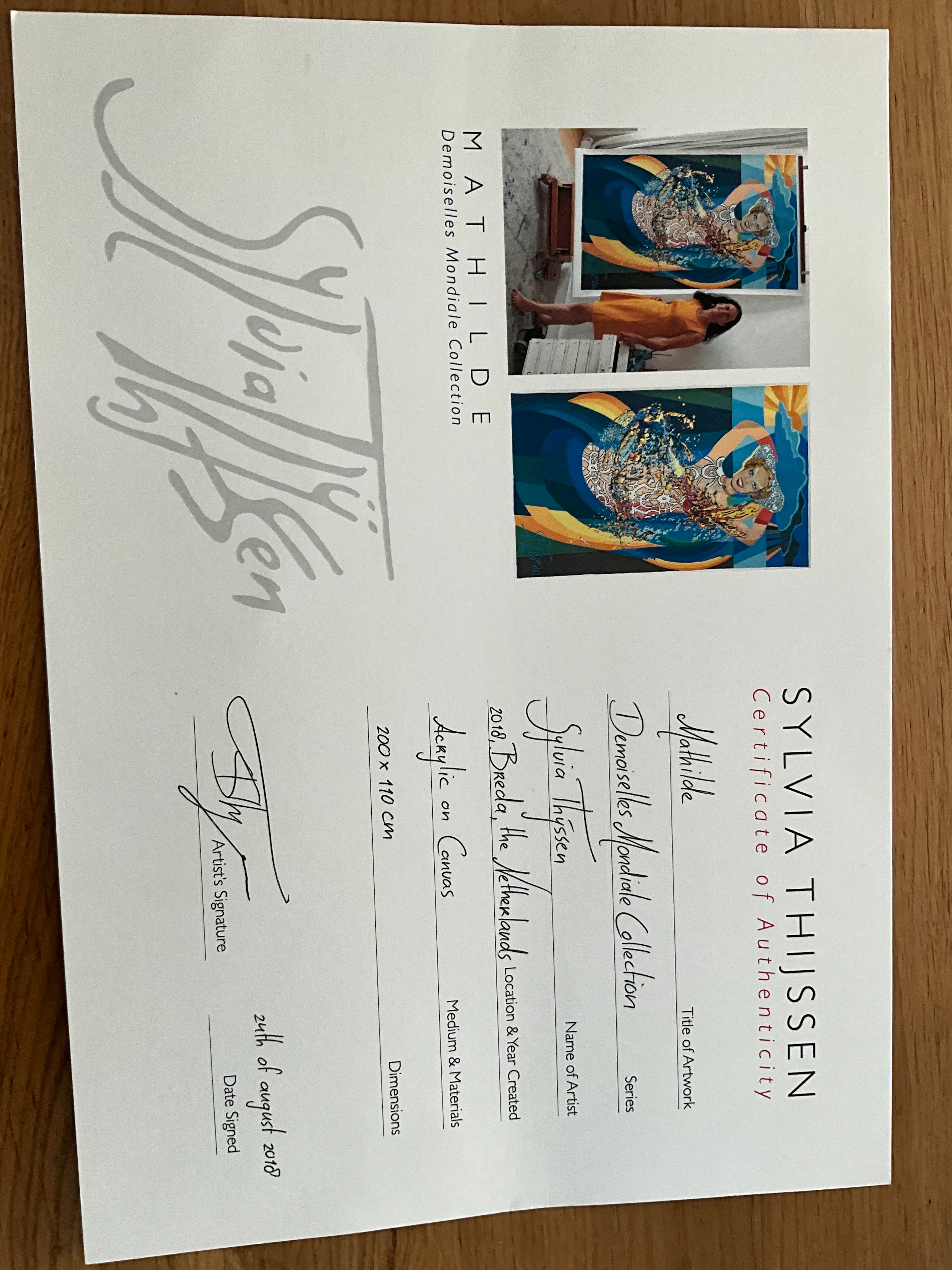 Bij het schilderij geleverd een certificaat, het verhaal van dit bijzondere kunstwerk en een catalogus van eerdere werk van Sylvia Thijssen.